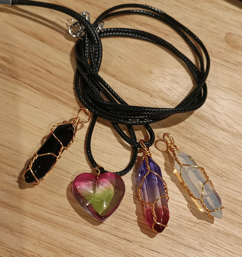 4 X WIRE WRAP CRYSTAL PENDANTS WITH 2 BLACK CORDS