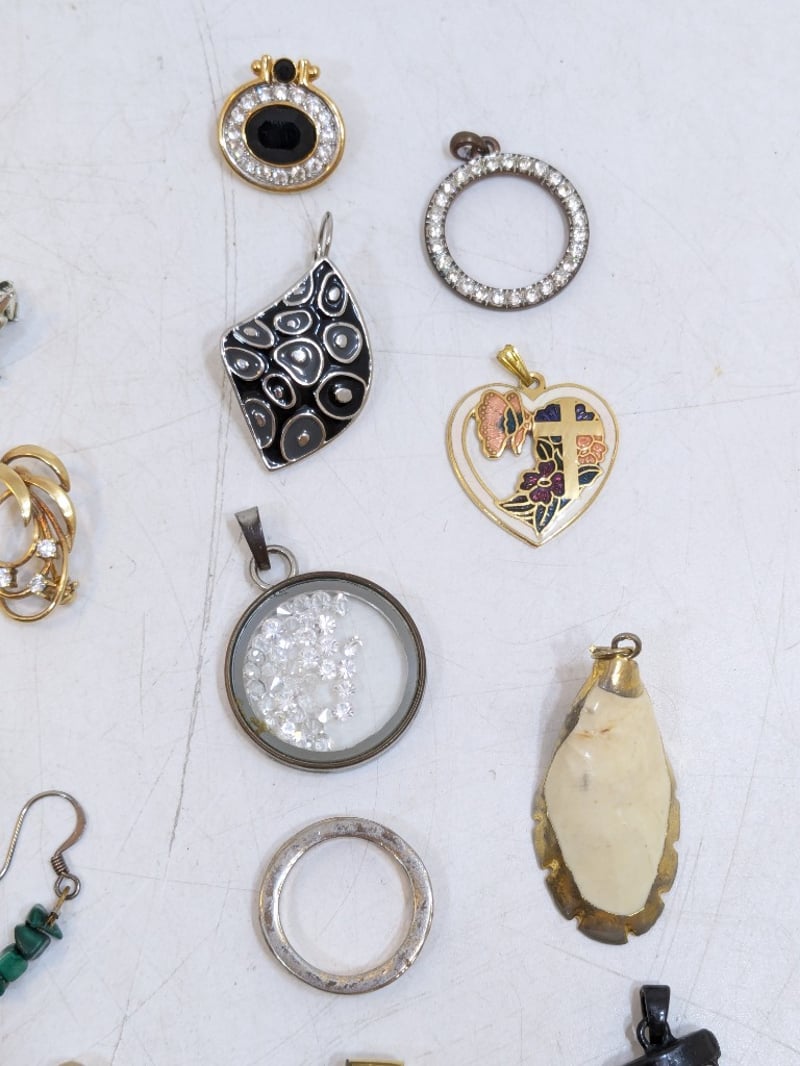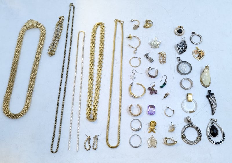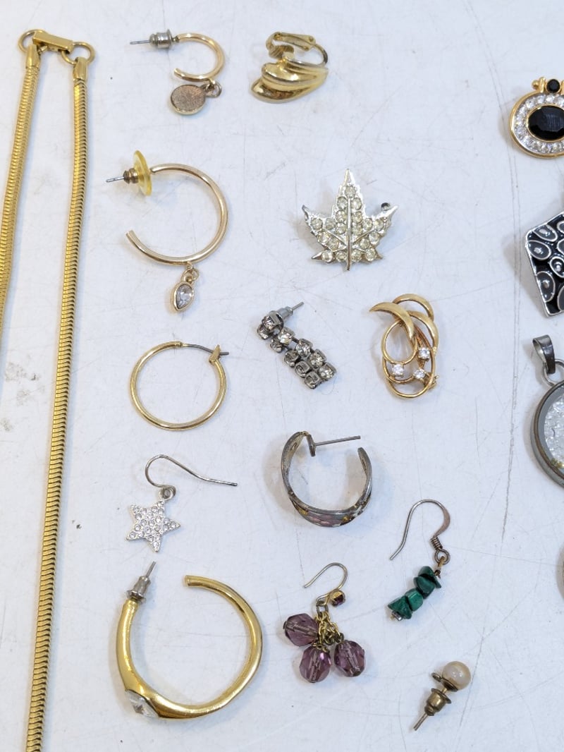 Includes Various Individual Earrings, Necklace Pendants, Faux Gold Chains, Brooches, Etc