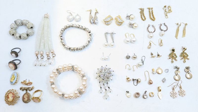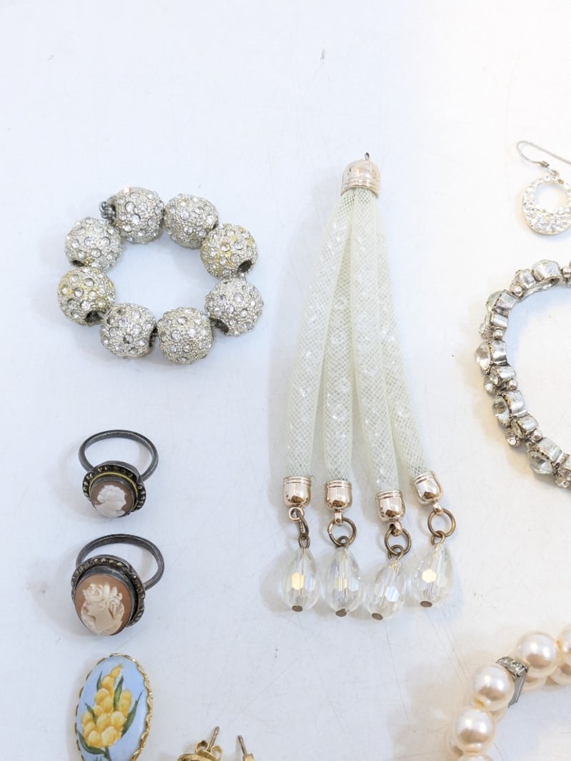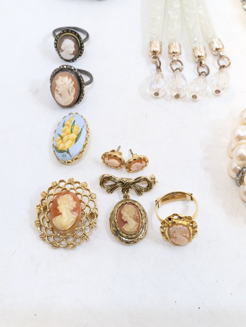 Includes Set Of Faux Cameo Jewellery, Faux Pearl Earrings, Brooches, Various Necklace Pendants, Etc