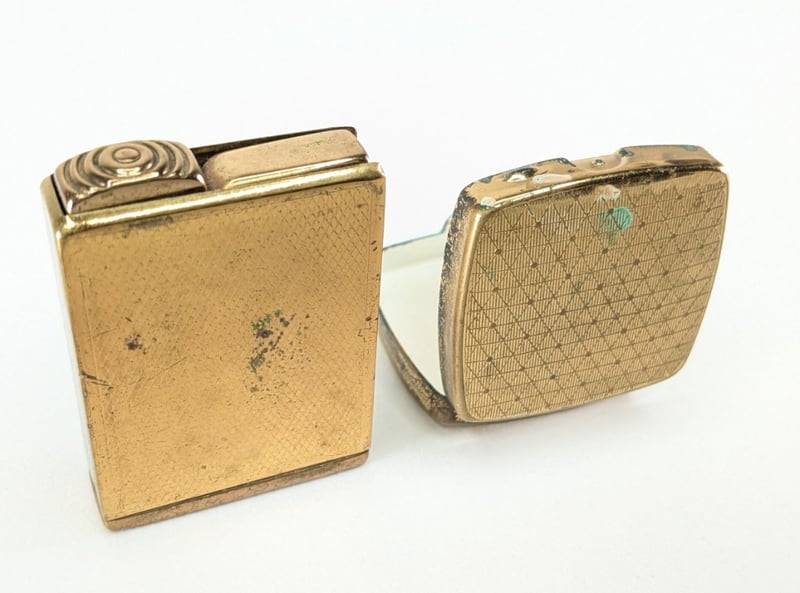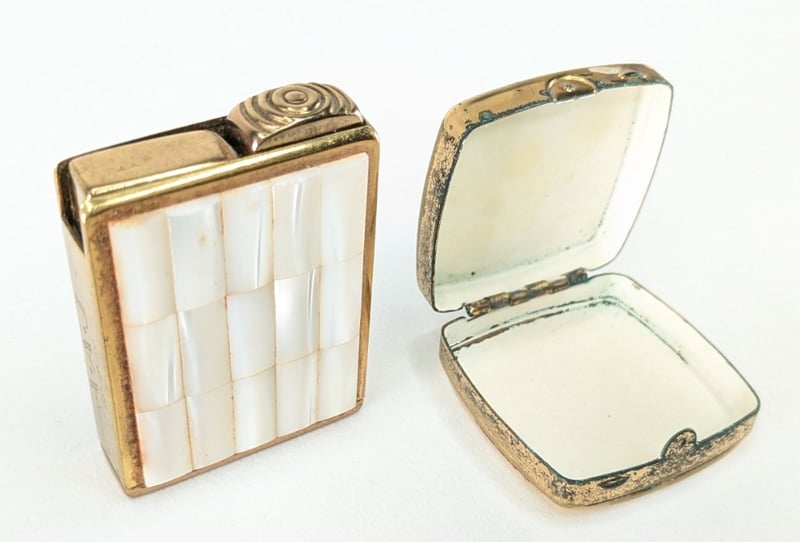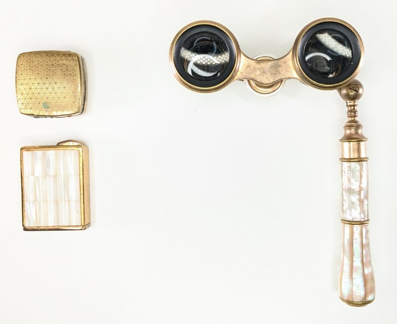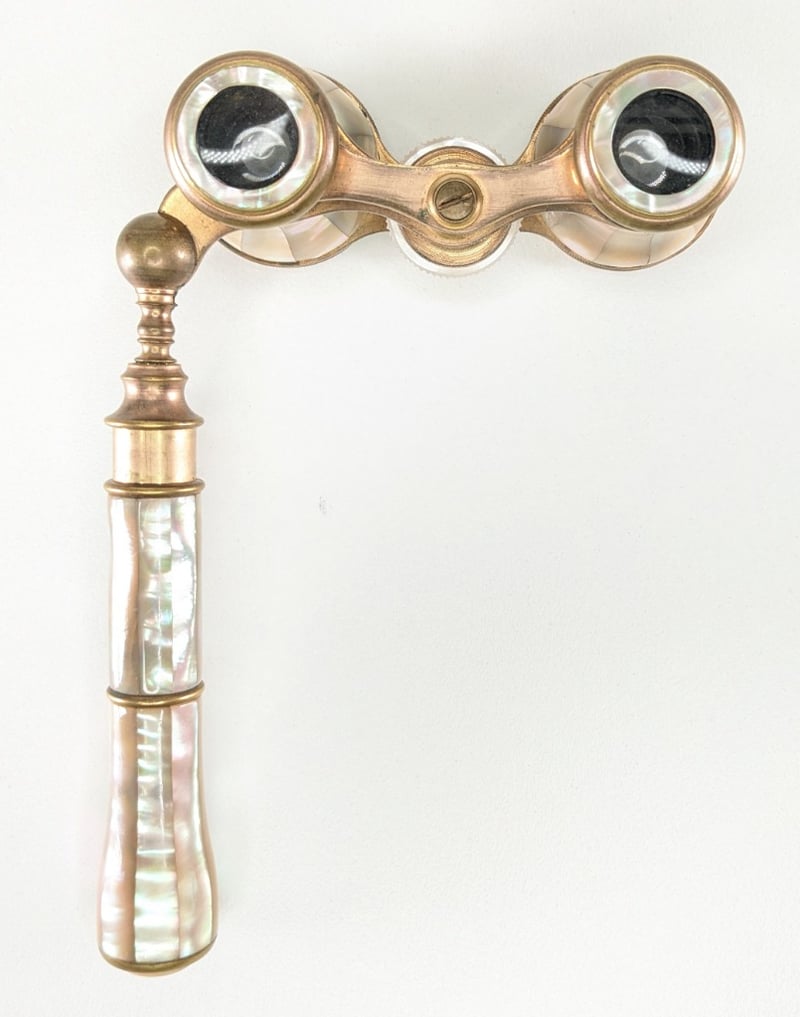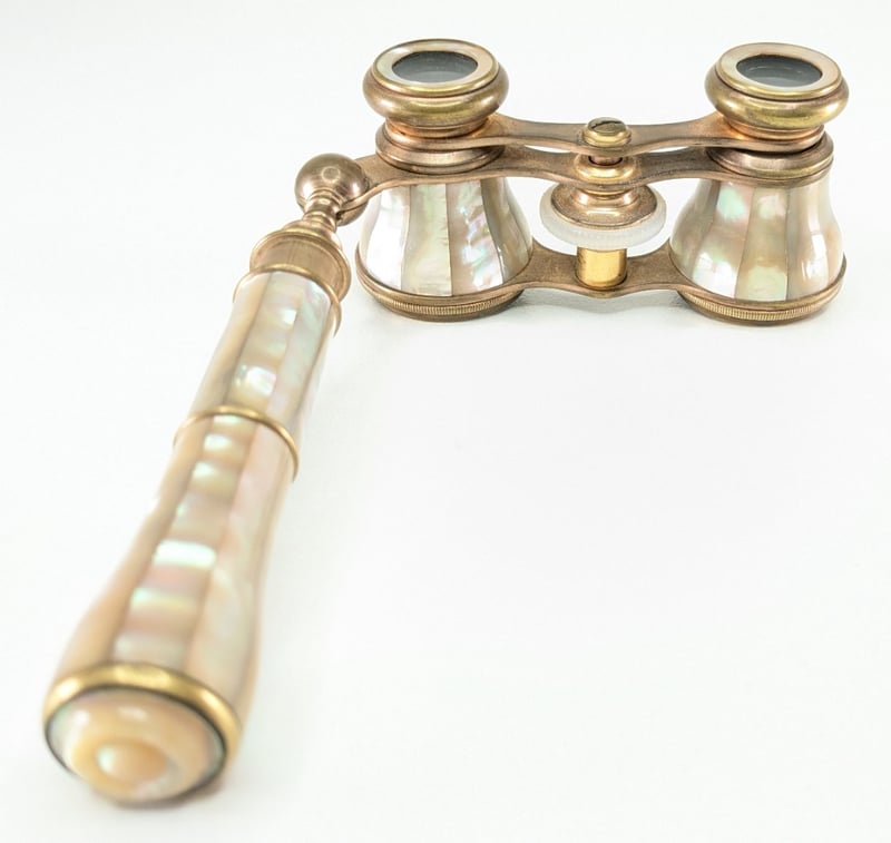 SET OF BRASS AND PEARL LORGNETTE BINOCULARS, LIGHTER, CRINKET BOX.