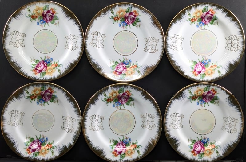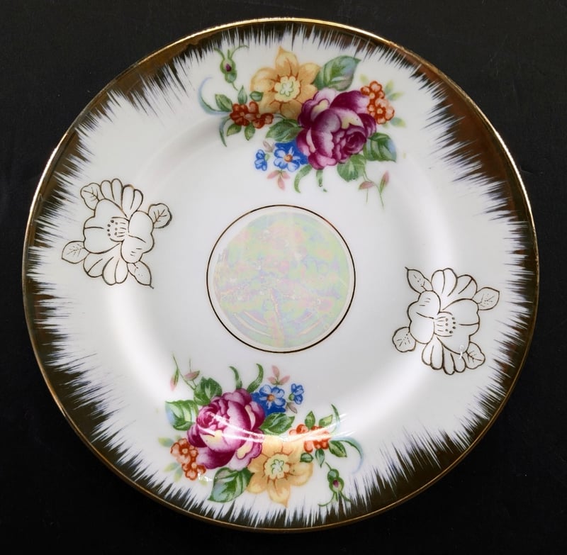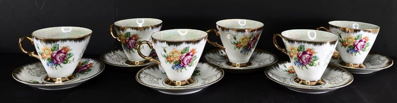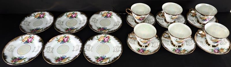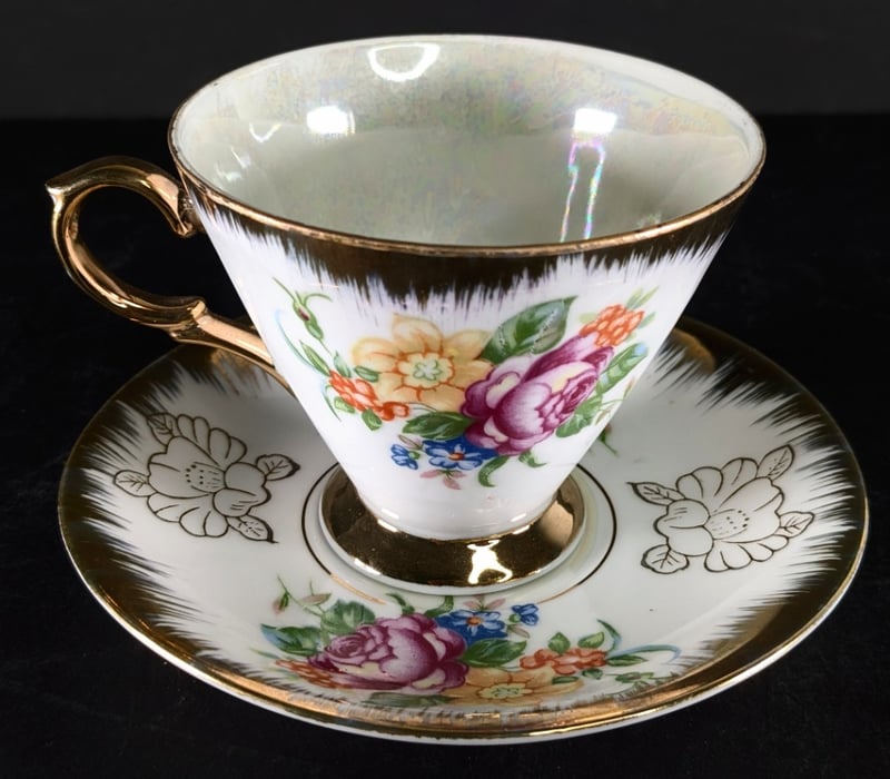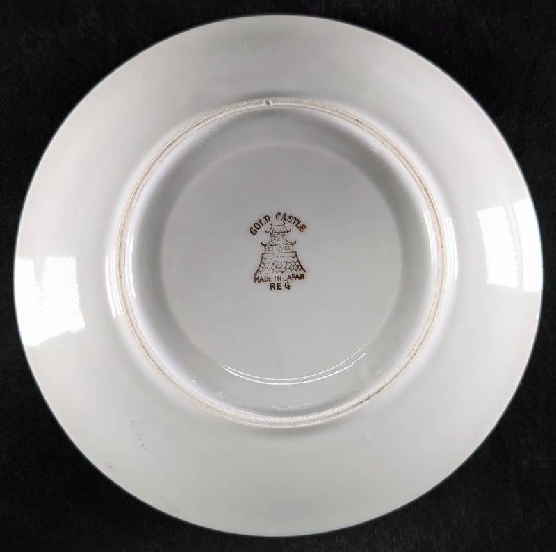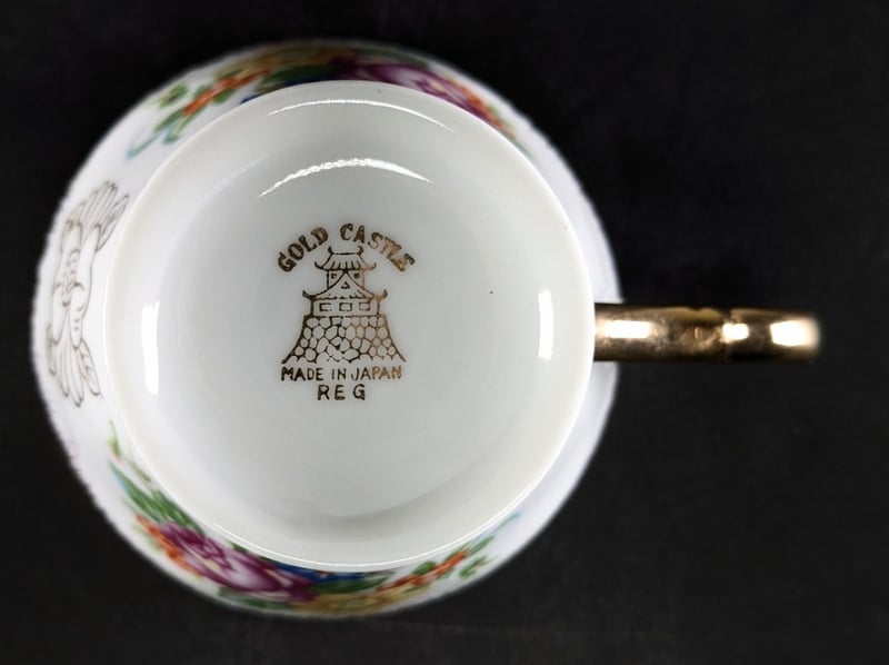 VINTAGE GOLD CASTLE TEACUP AND SAUCER SET, MADE IN JAPAN.