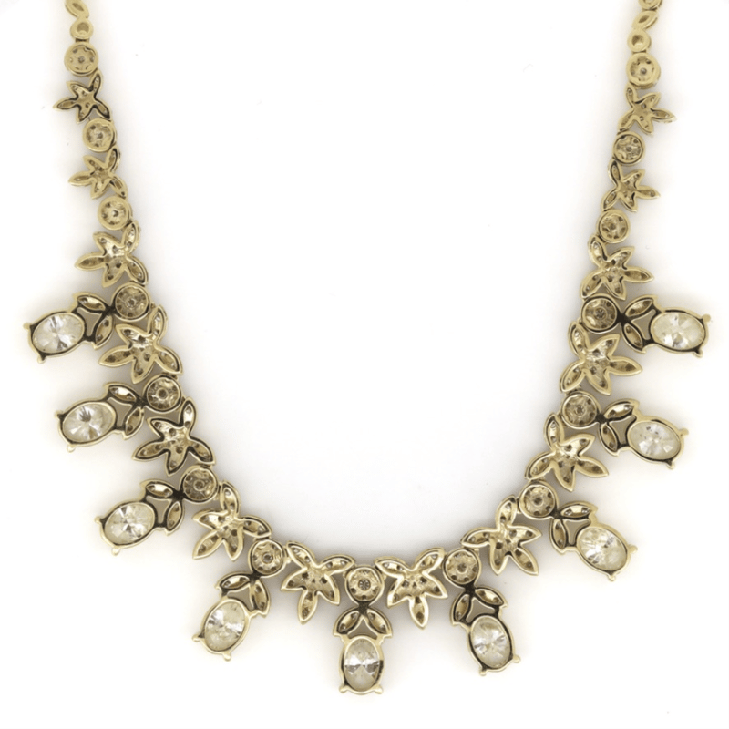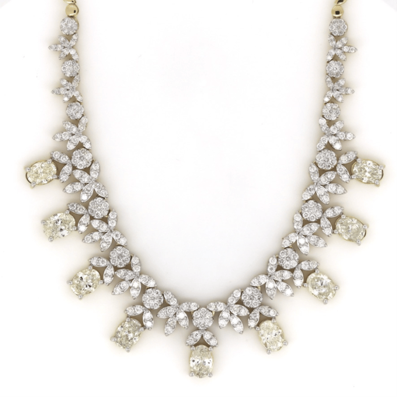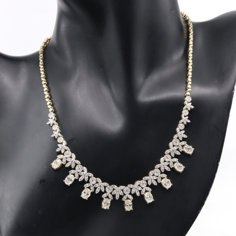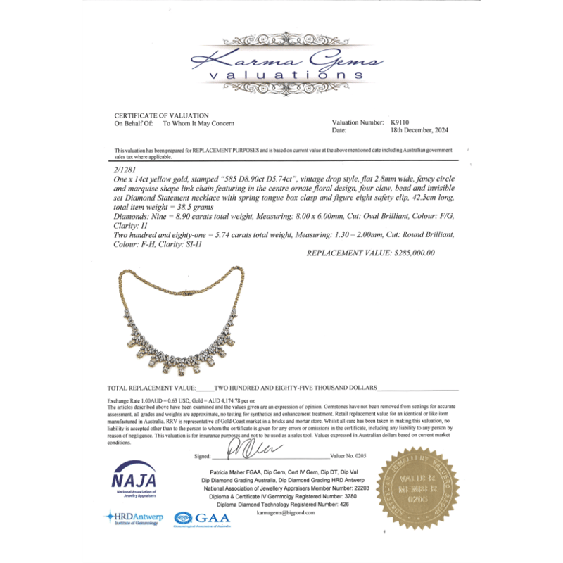 14K WHITE GOLD AND 14.64CT TDW DIAMOND, STATEMENT NECKLACE. The Necklace Features, 9 Oval Brilliant Cut, Diamonds (8.90Ct Tdw, F-G Colour, I1 Clarity), 4 Claw Set. Accompanying The Ornate Design Are, 281 Round Brilliant Cut, Diamonds (5.74Ct Tdw, F-H Colour, Si-I1 Clarity) Set In Bead And Invisible Settings. The Necklace Has A Box Lock Closure With A Figure Eight Safety Clip. The Necklace Length Is 42.5Cm Long. Valuations Provided by an Independent Third-Party Professional Not Directly Associated With Lloyds Auctions at AUD $$285,000.00This valuation has been conducted by an independent third-party professional. The valuation amount is an assessment by the issuing valuer and does not reflect the auction value of the item. Any inquiries regarding the valuation should be directed to the issuing valuer (refer to contact details on the certificate), as Lloyds Auctions has no affiliation or influence over the valuation, the valuer, or the stated amount. Condition: Good - Refer Images 0645976+9205