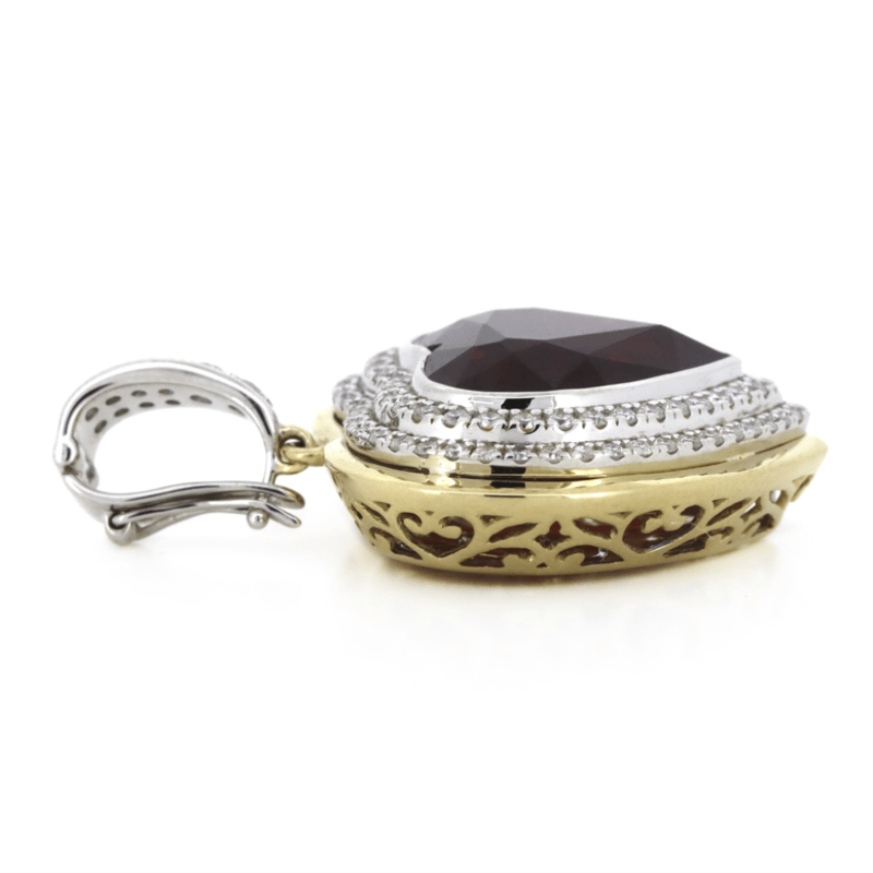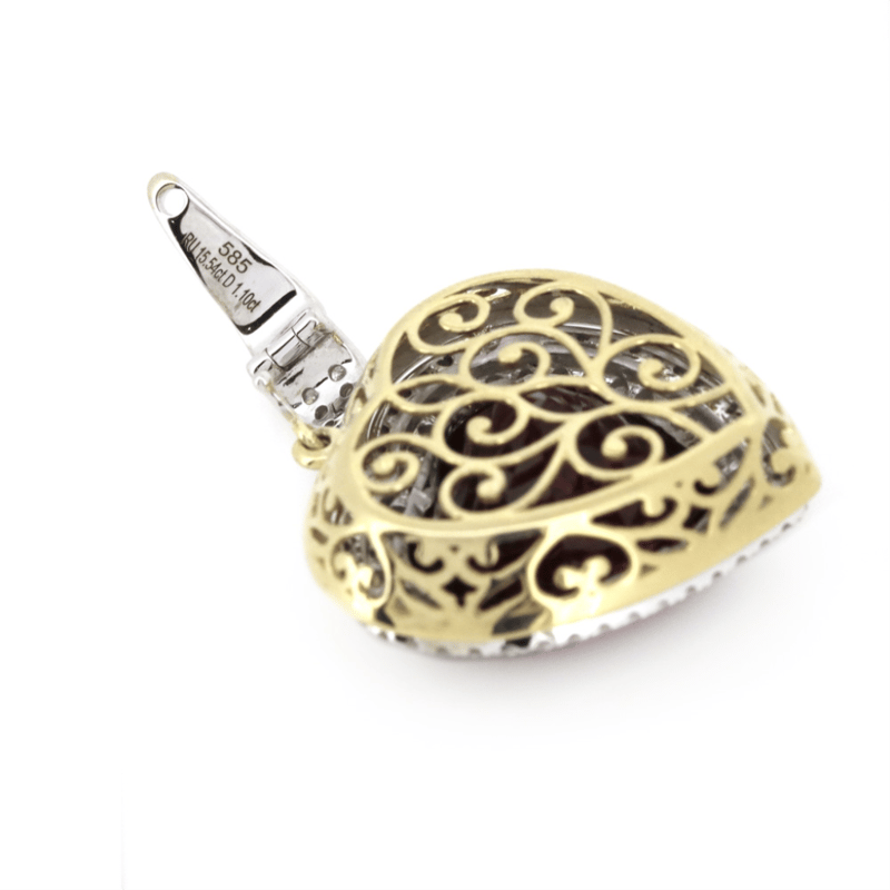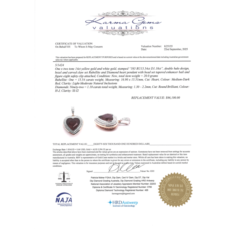 The Centre Features, Heart Cut, Medium-Dark Red, Rubellite (15.54Ct, Light-Moderate Inclusions), Bezel Set. Surrounding The Centre In A Double Halo And Decorating The Bail Are, 92 Round Brilliant Cut, Diamonds (1.10Ct Tdw, H-J Colour, Si-I2 Clarity), Bead Set. The Pendant Features A Figure Eight Safety Clip Attached. Total Item Weight Is 20Grams.