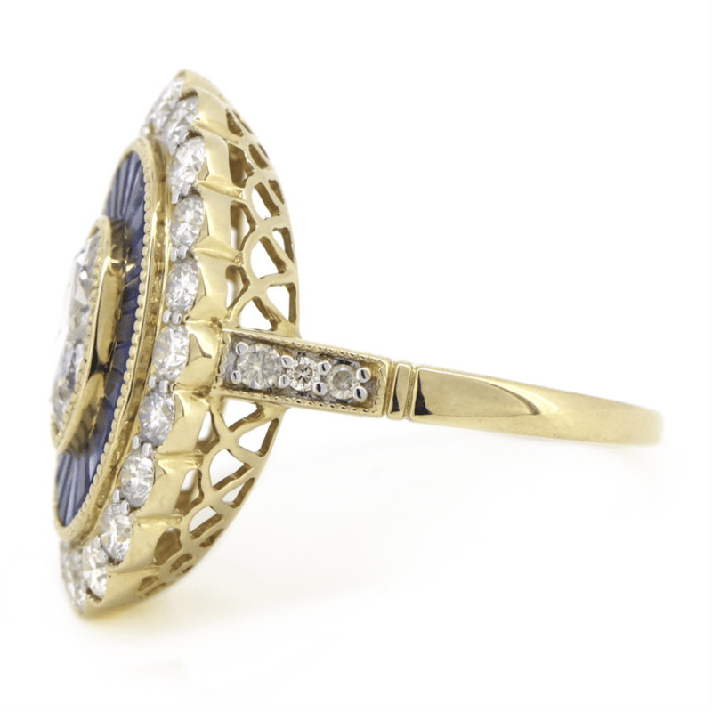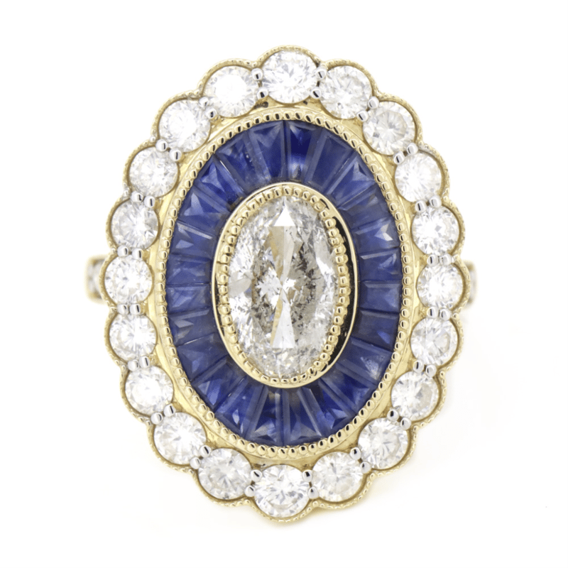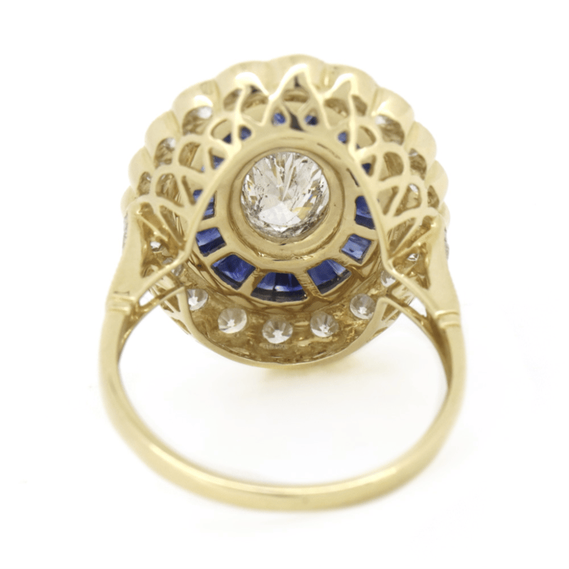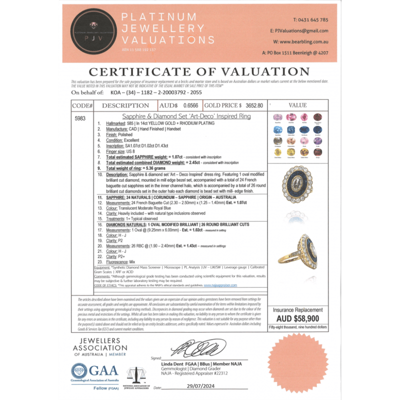 14K YELLOW GOLD, BLUE SAPPHIRE AND DIAMOND RING The Centre Features, One Oval Modified Brilliant Cut, Diamond (1.02Ct TdW, H-J Colour, P2 Clarity), Bezel Set With Millgrain Detail. Surrounding The Centre Are, 24 French Baguette Cut, Translucent Moderate Royal Blue, Sapphires (1.06Ct, Slightly Included), Channel Set With Millgrain Detail. Surrounding The Inner Halo Are, 26 Round Brilliant Cut, Diamonds (1.43Ct Tdw, H-J Colour, P2+ Clarity), Bead Set With Millgrain Detail. Ring Size O. Valuations Provided by an Independent Third-Party Professional Not Directly Associated With Lloyds Auctions at AUD $$58,900.00This valuation has been conducted by an independent third-party professional. The valuation amount is an assessment by the issuing valuer and does not reflect the auction value of the item. Any inquiries regarding the valuation should be directed to the issuing valuer (refer to contact details on the certificate), as Lloyds Auctions has no affiliation or influence over the valuation, the valuer, or the stated amount. Condition: Good - Refer Images 0645976+9213