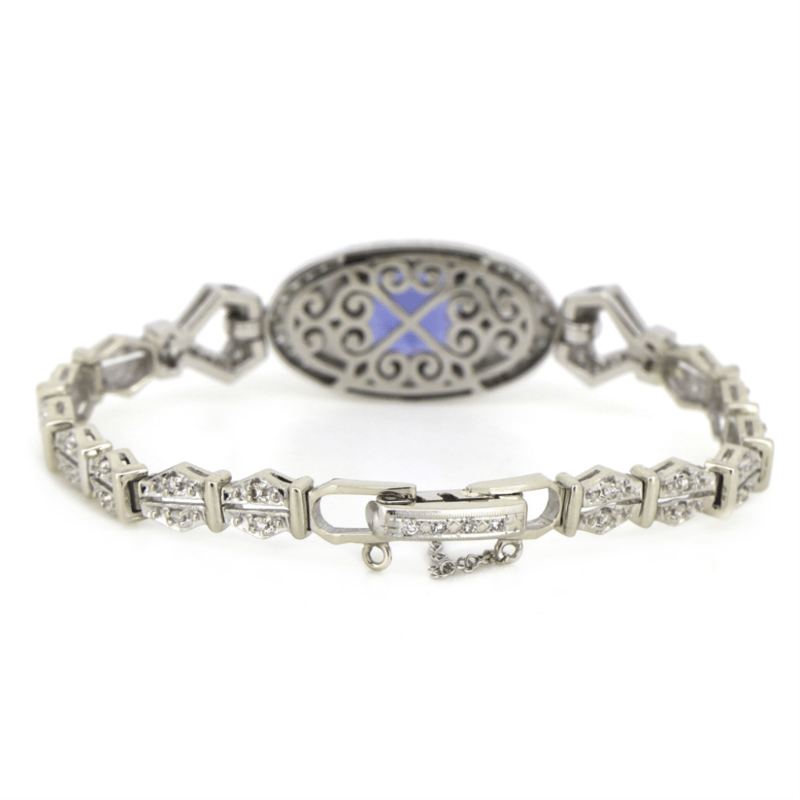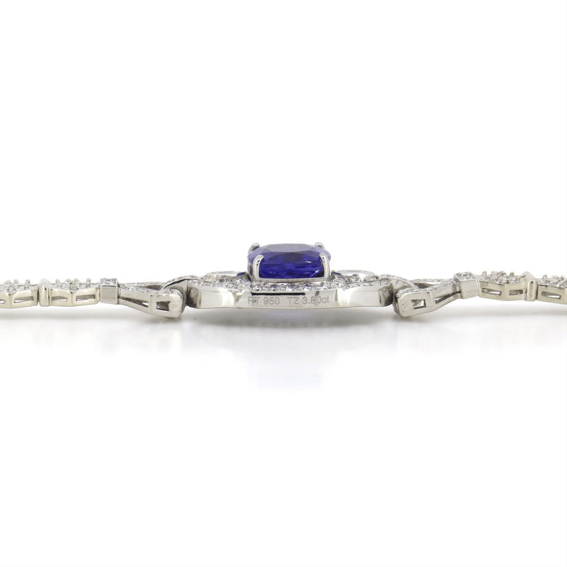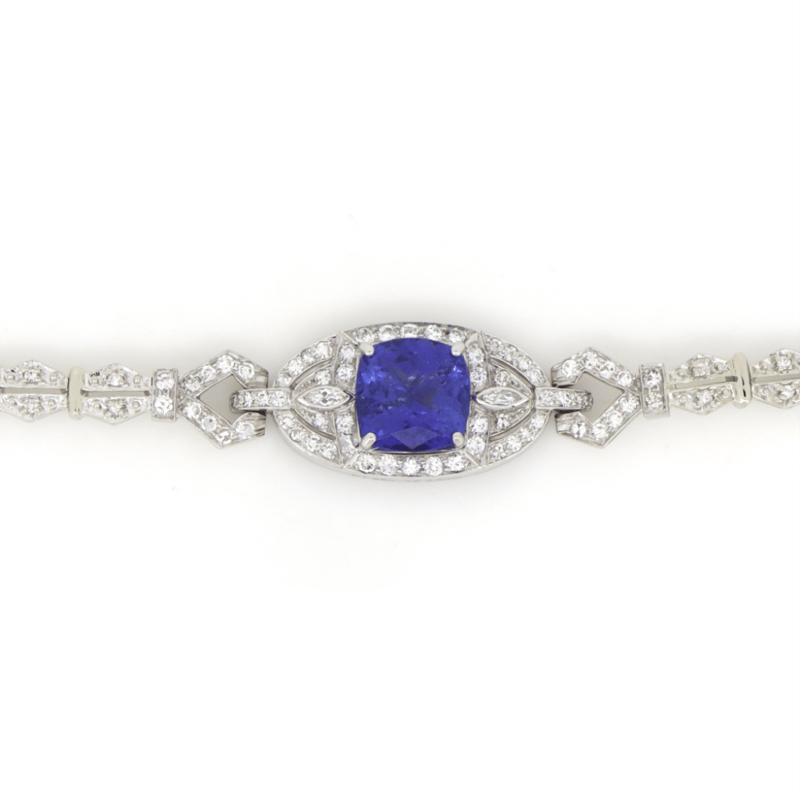 The Centre Features, One Cushion Cut, Vivid Blue, Tanzanite (3.80Ct, Moderate-Heavy Inclusions), Claw Set. Encompassing The Design Are, 98 Round Brilliant/Round Single/Marquise Cut, Diamonds (1.35Ct Tdw, F-I Colour, Vs-Si1 Clarity), Bead/Bezel And Pip Claw Set. The Bracelet Features Fold-Over Clasp And Safety Chain. Length Of Bracelet Is 16.5Cm. Total Item Weight Is 16.78Grams.