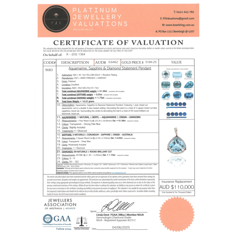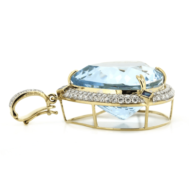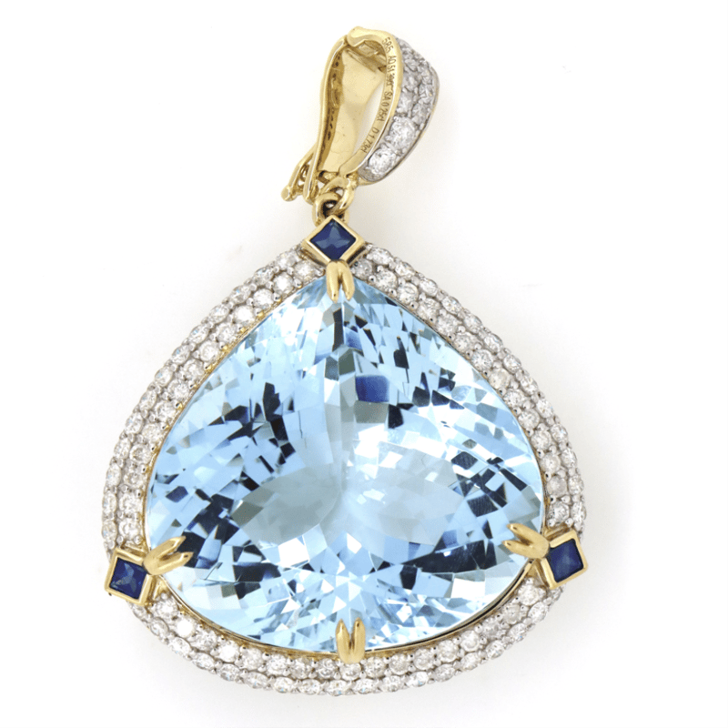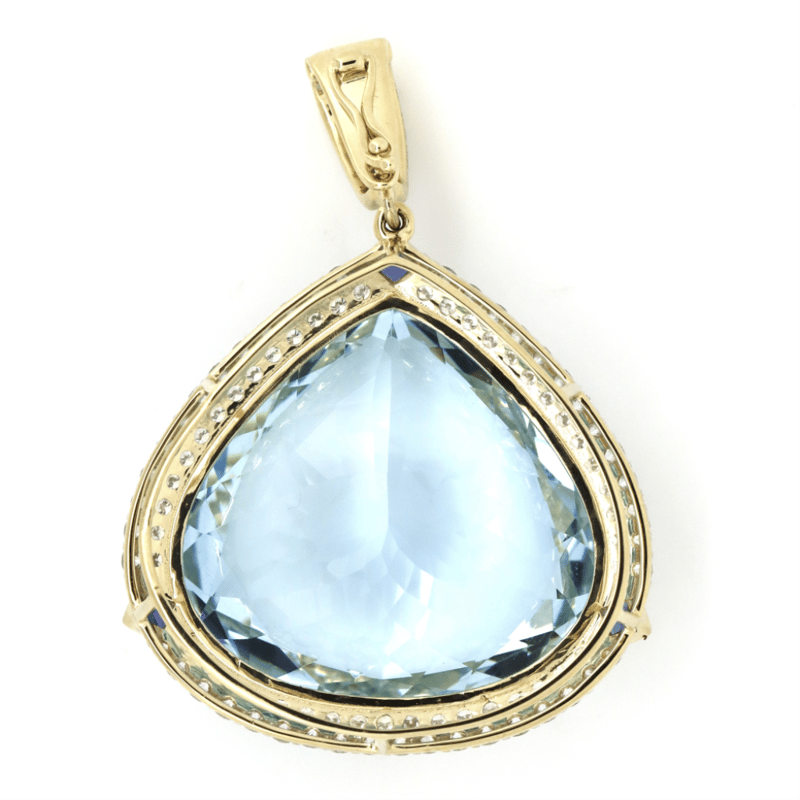 The Centre Features, One Pear Mixed Cut, Strong Pale Blue, Aquamarine (51.39Ct, Slightly Included), Claw Set. Surrounding The Centre In A Double Halo Design And Decorating The Bail Are, 99 Round Brilliant Cut, Diamonds (1.73Ct Tdw, G-H Colour, Si1-Si2 Clarity), Bead Set. Embellishing The Halo Are, 3 Square Mixed Cut, Deep Blue, Sapphires (0.25Ct Tsw, Moderately Included, Enhanced), Bezel Set.