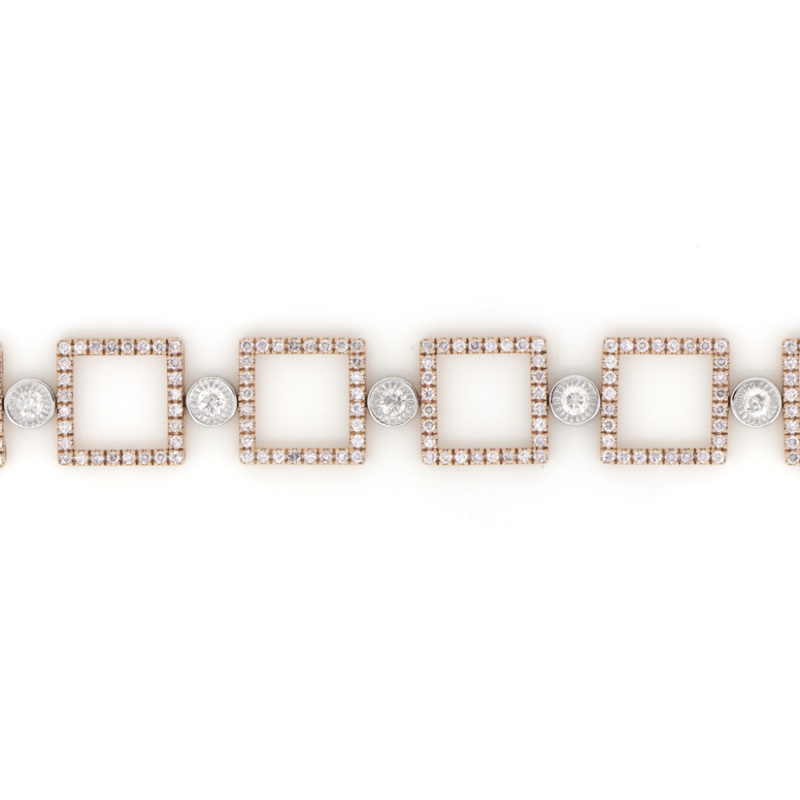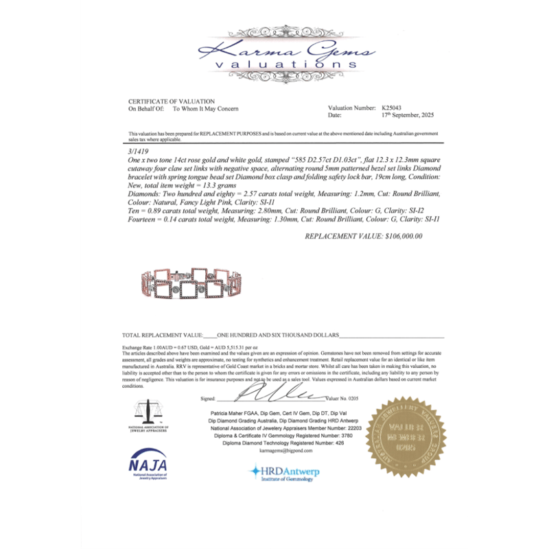 The Bracelet Features, 280 Round Brilliant Cut, Fancy Light Pink, Diamonds (2.57Ct Tdw, Si-I1 Clarity), Claw Set. Alternating Around The Centre Are, 10 Round Brilliant Cut, Diamonds (0.89Ct Tdw, G Colour, Si-I2 Clarity), Bezel Set. Decorating The Clasp Are, 14 Round Brilliant Cut, Diamonds (0.14Ct Tdw, G Colour, Si-I1 Clarity), Bead Set. The Bracelet Features A 14K White Gold Box Clasp With Folding Safety Lock Bar And Is 19Cm Long.