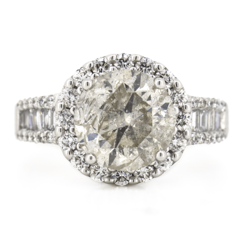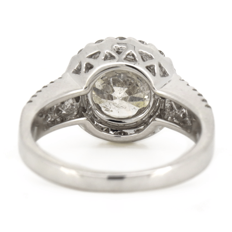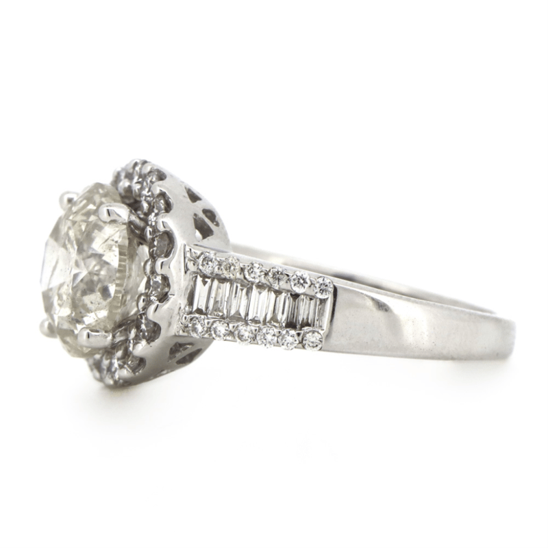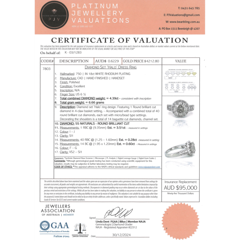 18K WHITE GOLD AND DIAMOND, HALO RING. The Centre Features, One Round Brilliant Cut, Diamond (3.51Ct, I-J Colour, Si1- Clarity), 4 Claw Basket Set. Surrounding The Design Are, 40 Round Brilliant Cut, Diamonds (0.28Ct Tdw, F-G Colour, Vs2- Si1 Clarity), Micro/Bead Setting. Decorating The Shoulders Are, 14 Baguette, Diamonds (0.60Ct Tdw, F-G Colour, Vs2- Si1 Clarity), Channel Set. Ring Size N. Valuations Provided by an Independent Third-Party Professional Not Directly Associated With Lloyds Auctions at AUD $$95,000.00This valuation has been conducted by an independent third-party professional. The valuation amount is an assessment by the issuing valuer and does not reflect the auction value of the item. Any inquiries regarding the valuation should be directed to the issuing valuer (refer to contact details on the certificate), as Lloyds Auctions has no affiliation or influence over the valuation, the valuer, or the stated amount. Condition: Good - Refer Images 0645976+9229