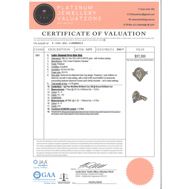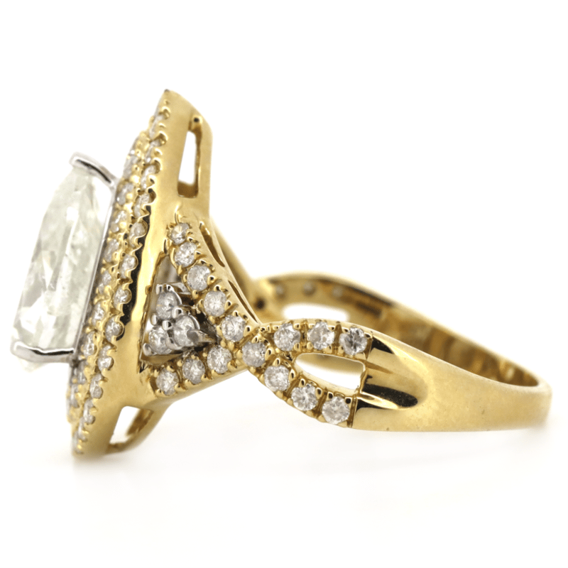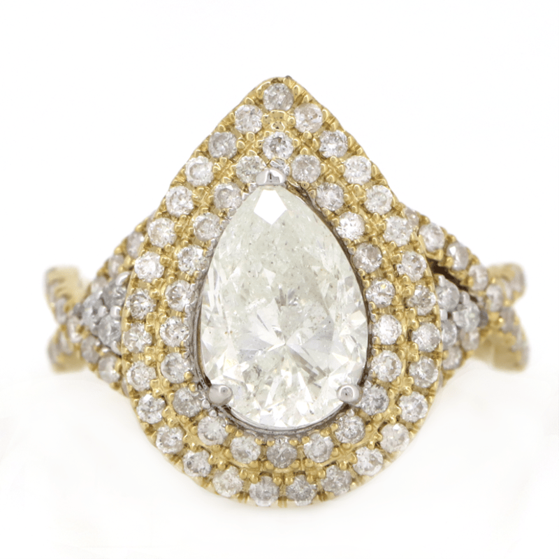 14K YELLOW/WHITE GOLD AND DIAMOND, DOUBLE HALO TWIST BAND RING. The Centre Features, One Pear Modified Brilliant Cut, Diamond (2.01Ct, G-H Colour, P2-P3 Clarity), 3 Claw Set. Surrounding The Centre In A Halo Are, 88 Round Brilliant Cut, Diamonds (0.75Ct Tdw, H-K Colour, P2+ Clarity), Bead Set. Ring Size M 1/2. Valuations Provided by an Independent Third-Party Professional Not Directly Associated With Lloyds Auctions at AUD $$57,300.00This valuation has been conducted by an independent third-party professional. The valuation amount is an assessment by the issuing valuer and does not reflect the auction value of the item. Any inquiries regarding the valuation should be directed to the issuing valuer (refer to contact details on the certificate), as Lloyds Auctions has no affiliation or influence over the valuation, the valuer, or the stated amount. Condition: Good - Refer Images 0645976+9233