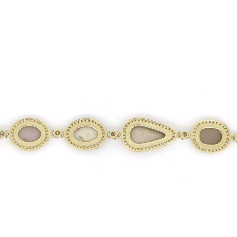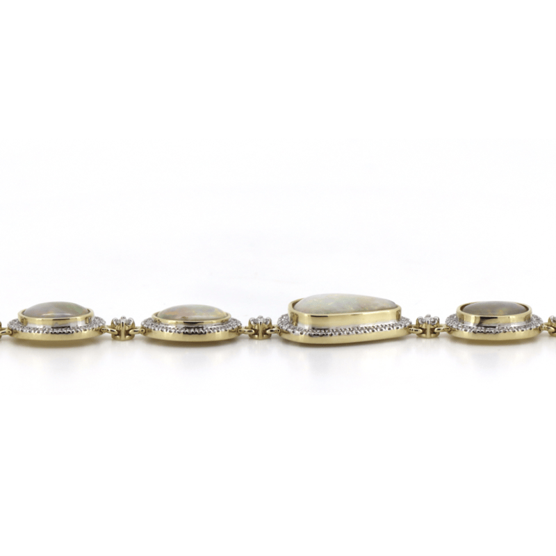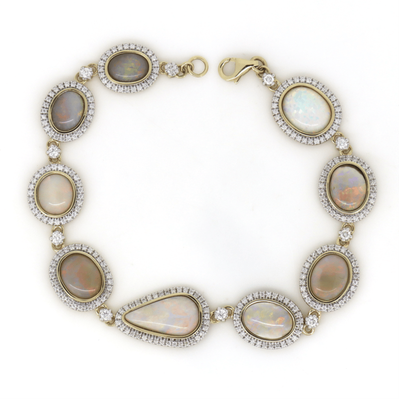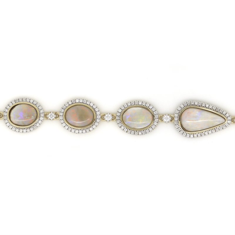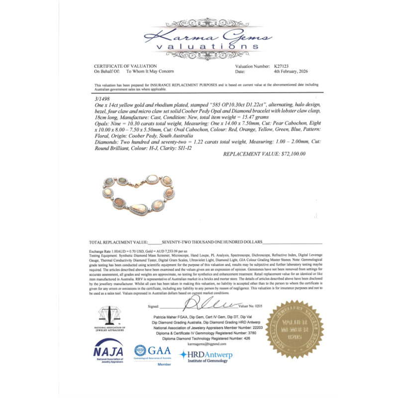 14K YELLOW GOLD, 10.30CT COOBER PEDY OPAL AND DIAMOND, HALO BRACELET. The Bracelet Features, 8 Oval Cabochon Cut/1 Pear Cabochon Cut, Coober Pedy Opals (10.30Ct Tsw, Flashes Of Red, Oranges, Yellow, Green, Blue Colour), Bezel Set. Encompassing The Opals In A Halo And Decorating The Joints Are, 272 Round Brilliant Cut, Diamonds (1.22Ct Tdw, H-J Colour, Si1-I2 Clarity), Bead/Bezel Set. Length Of Bracelet 18Cm. Valuations Provided by an Independent Third-Party Professional Not Directly Associated With Lloyds Auctions at AUD $$72,100.00This valuation has been conducted by an independent third-party professional. The valuation amount is an assessment by the issuing valuer and does not reflect the auction value of the item. Any inquiries regarding the valuation should be directed to the issuing valuer (refer to contact details on the certificate), as Lloyds Auctions has no affiliation or influence over the valuation, the valuer, or the stated amount. Condition: Good - Refer Images 0645976+9234