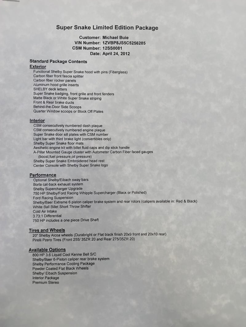 This Shelby Super Snake represents one of the most formidable modern American muscle cars, developed to push the already potent GT500 into true supercar performance territory. With a vendor‑reported output of approximately 800 horsepower, this example delivers extraordinary straight‑line performance while retaining the raw, analogue driving experience of a manual gearbox.