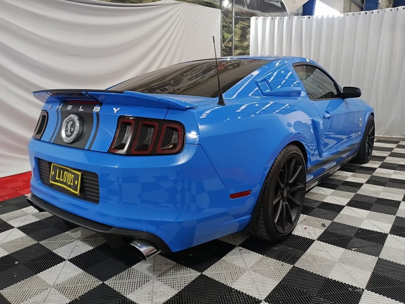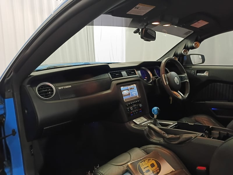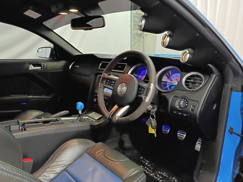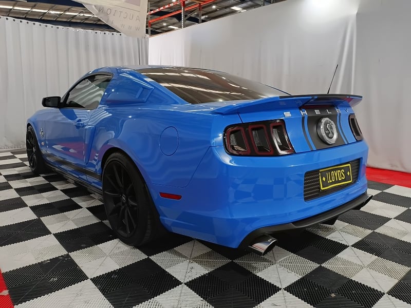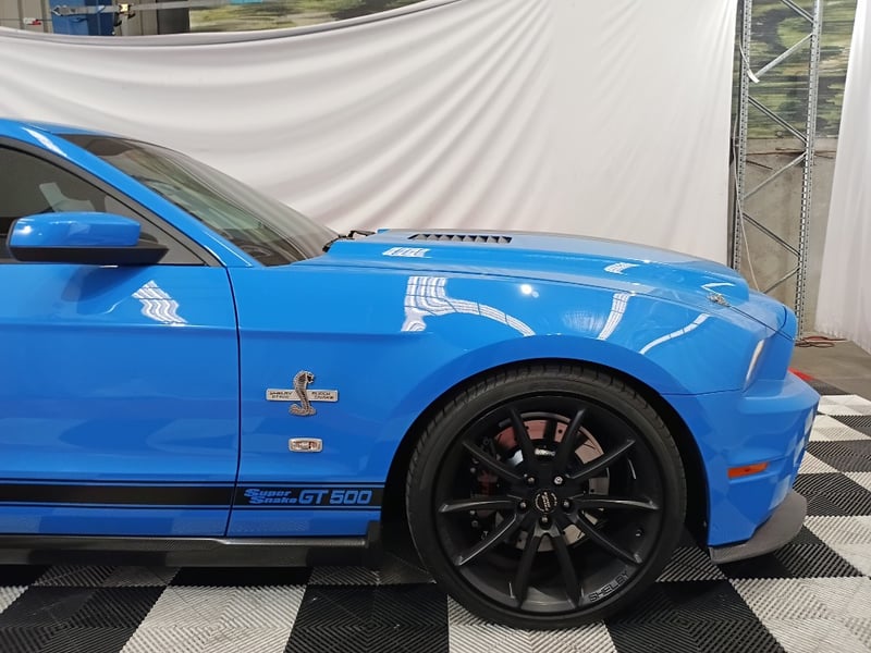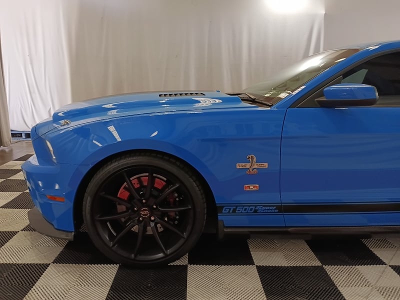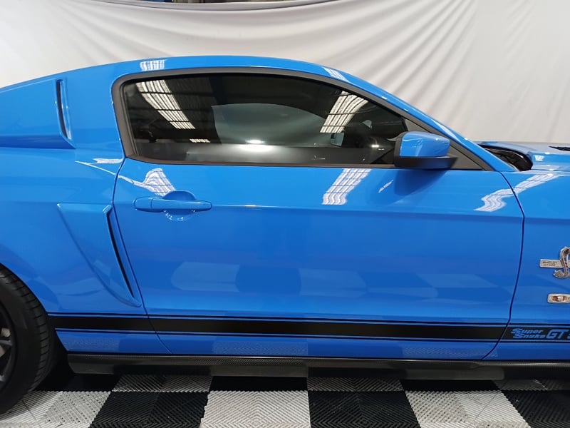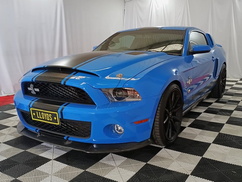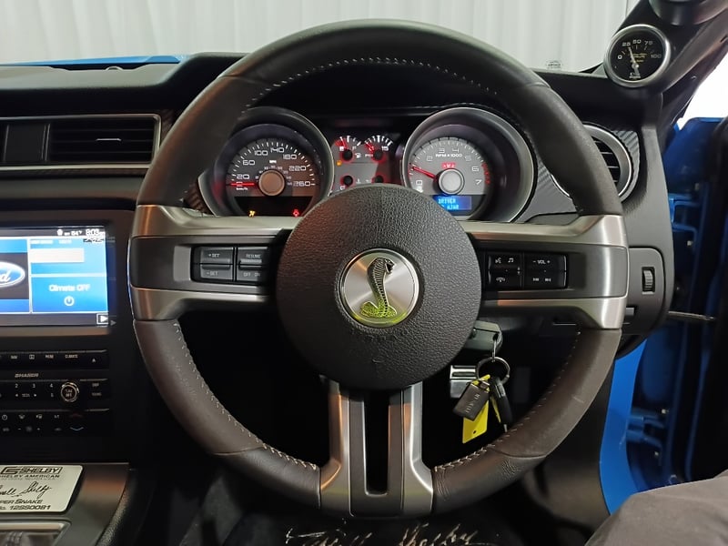 2012 Ford Mustang Shelby Super Snake GT500, finished in Blue and built as an extreme, factory‑endorsed performance conversion. Rear‑wheel drive configuration powered by a supercharged V8 petrol engine producing a vendor‑reported 800 horsepower, paired with a five‑speed manual transmission. Odometer indicating just 13,960 miles.