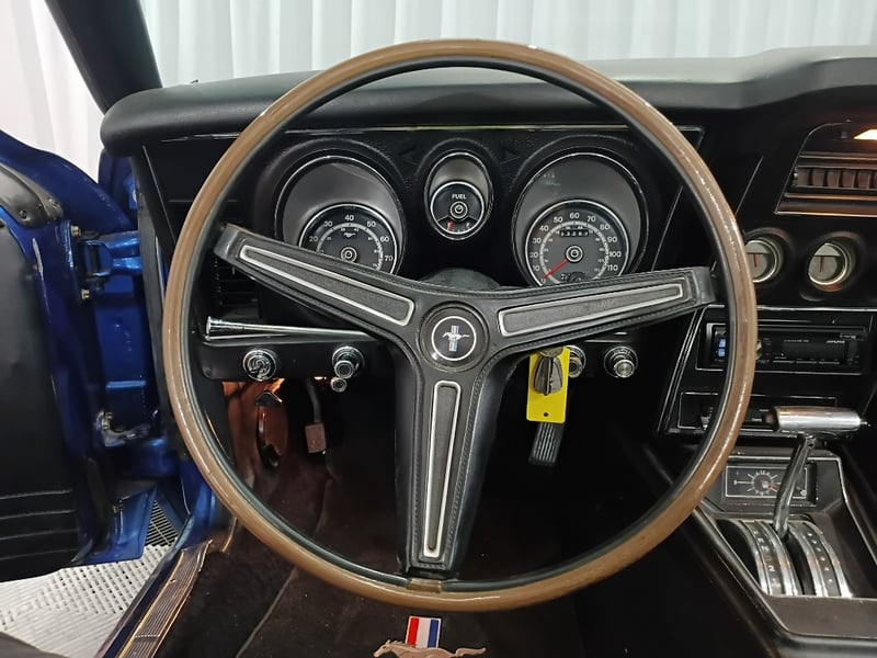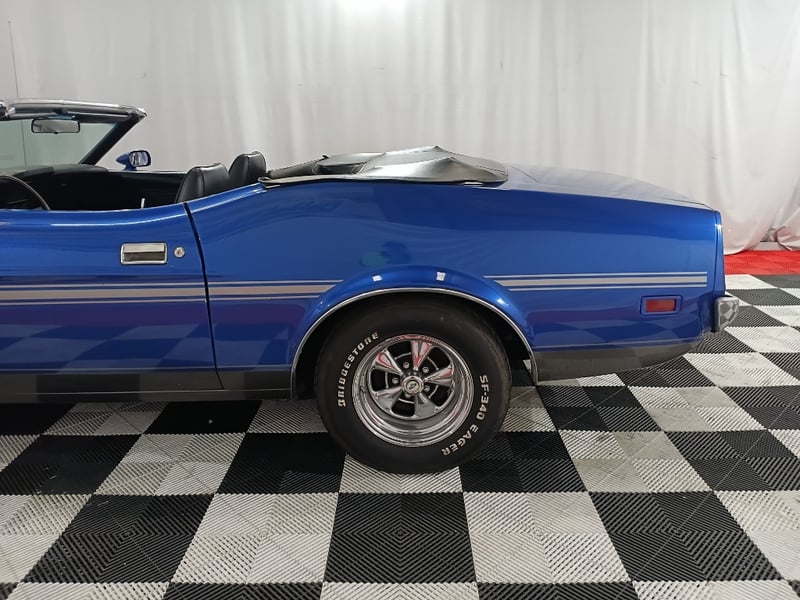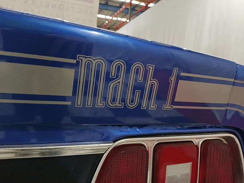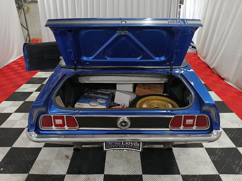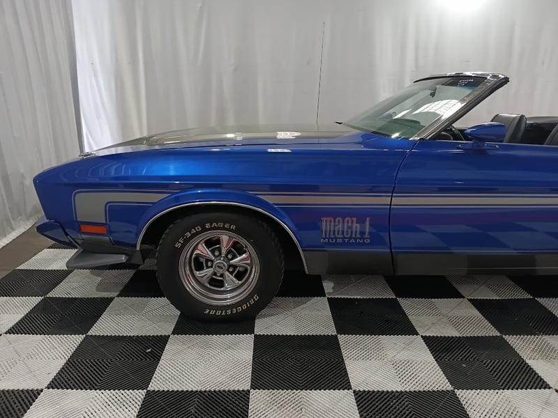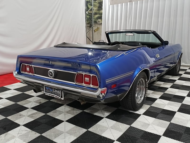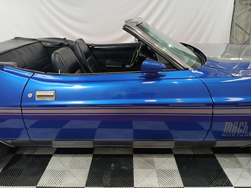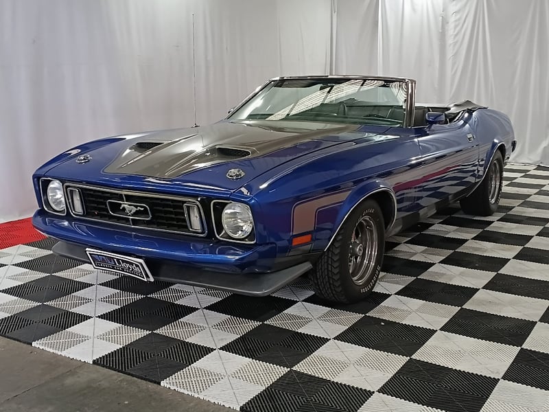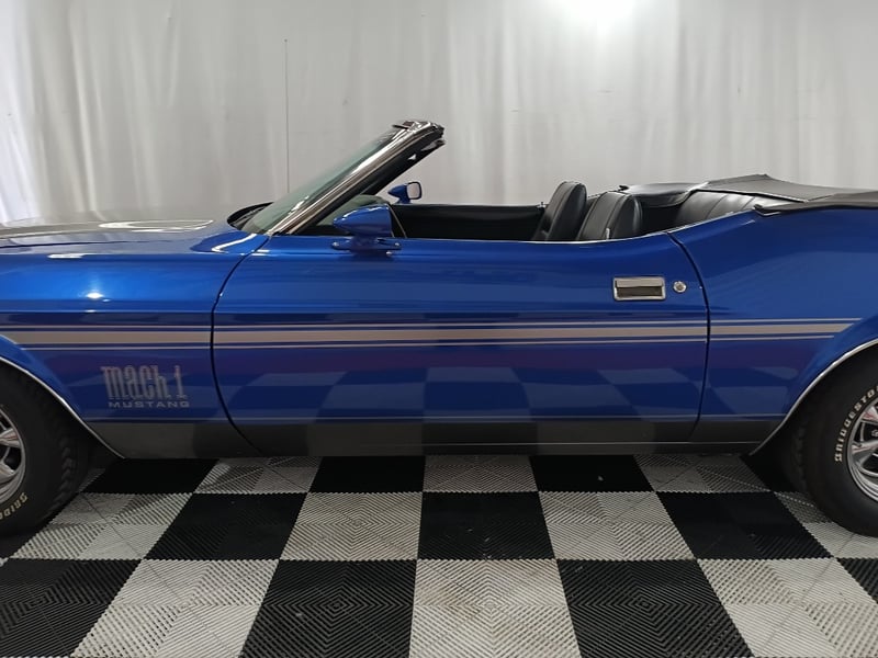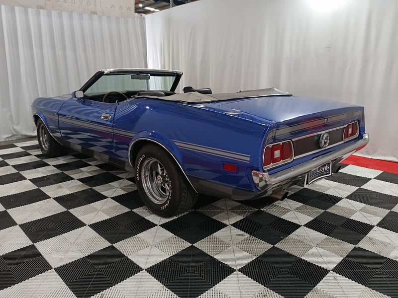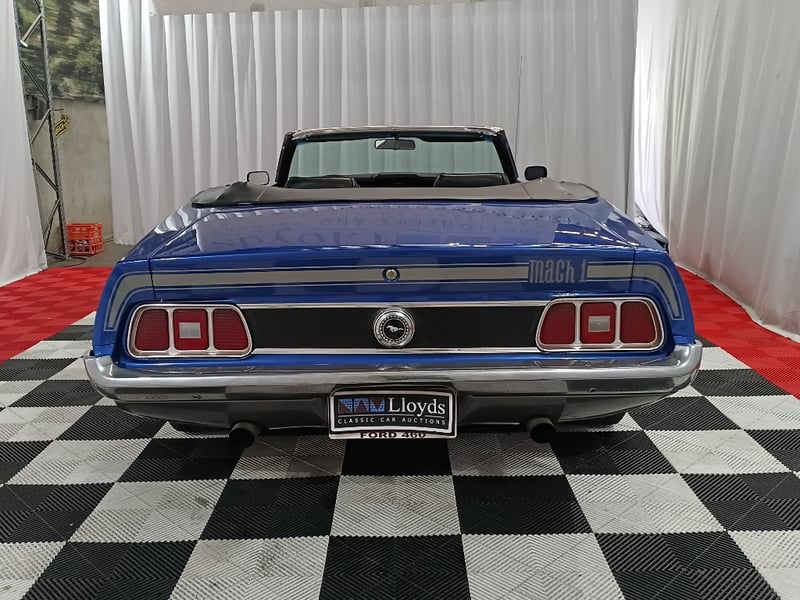 1973 Ford Mustang Mach 1 convertible, presented in striking Kashmir Blue with classic Mach 1 grey striping. Left‑hand drive, rear‑wheel drive configuration powered by a formidable 460ci (7.5‑litre) V8 petrol engine, paired with an automatic transmission. Odometer indicating approximately 73,367 miles.