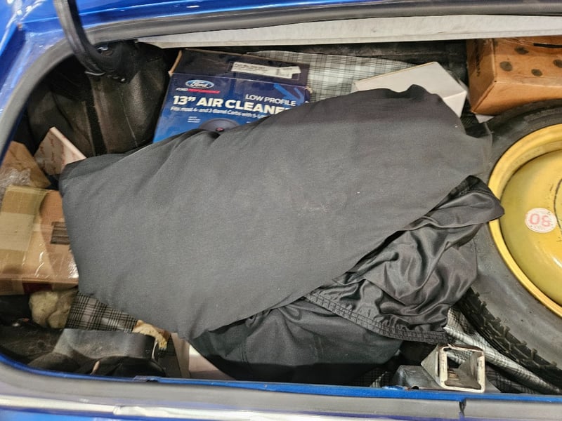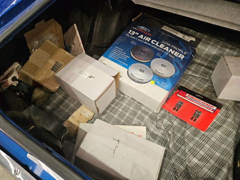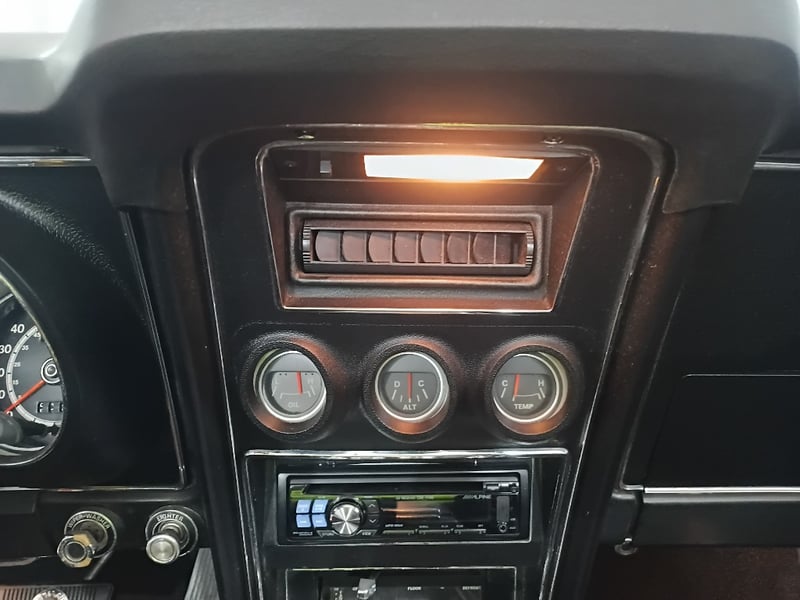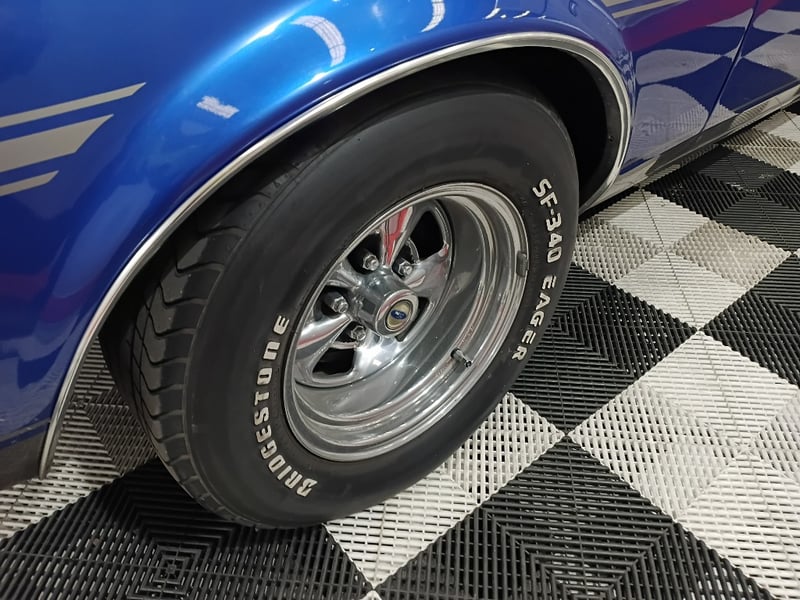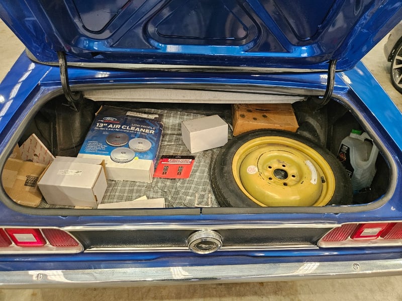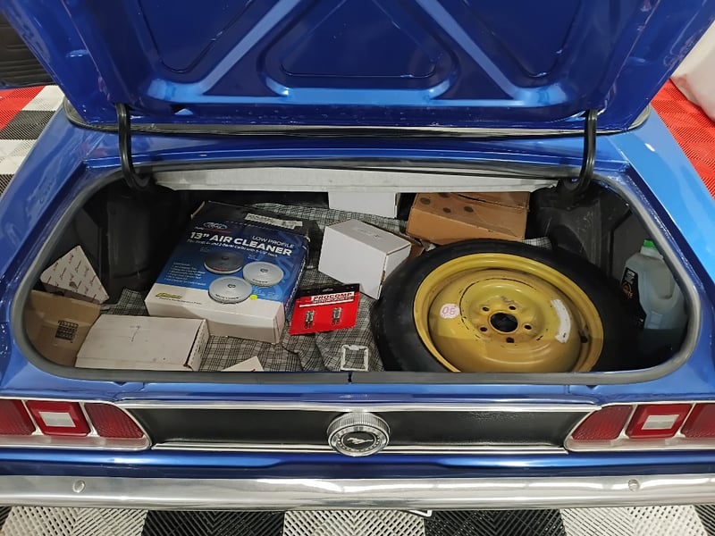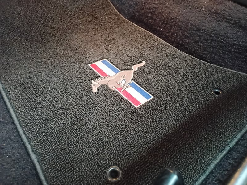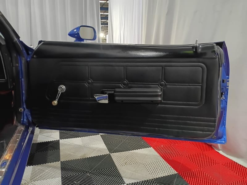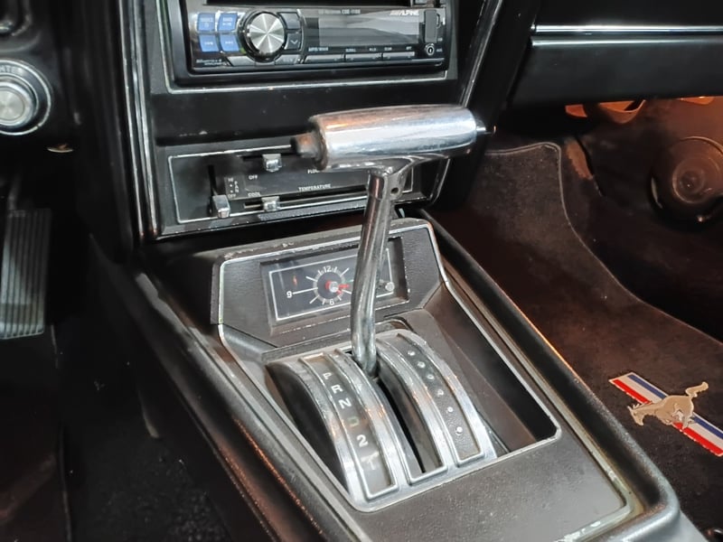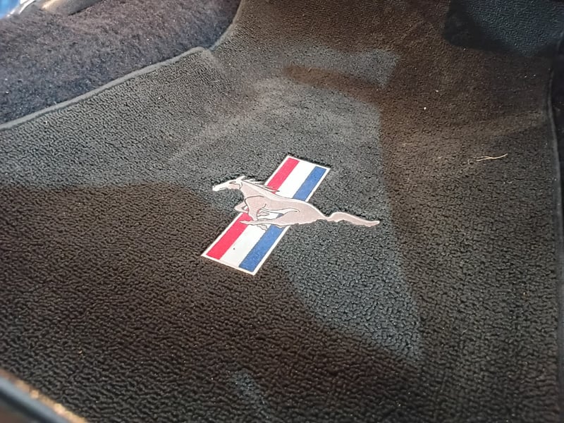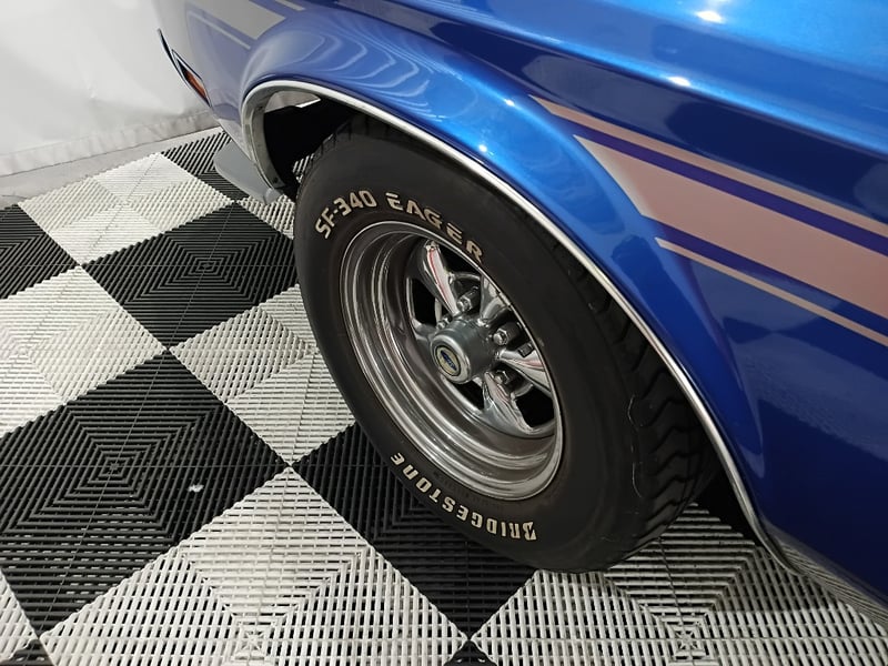 Braking and steering systems have been refreshed with new shock absorbers, front disc brakes and pads, rear drum shoes, and renewed steering components including idler arm, drag links, and tie‑rod ends. Interior highlights include genuine Mach 1 steering wheel, dashboard fascia and glovebox, upgraded LED dash lighting, a new clock, and halogen headlights. Exterior details include a new vinyl top, refreshed weather stripping, and re‑chromed bumpers and trim.