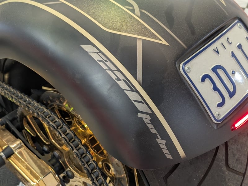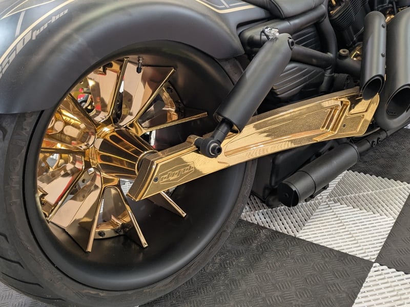 The single‑seat configuration reinforces the bike’s purposeful, performance‑focused design, while the custom gold and black finish gives it a bold visual presence. The belt‑drive setup ensures smooth and reliable power transfer, complementing the refined yet aggressive nature of this build.