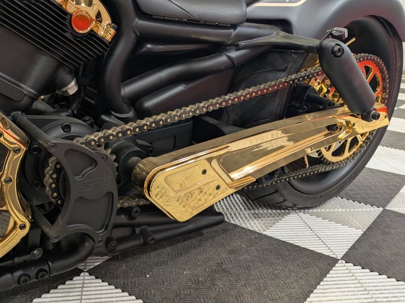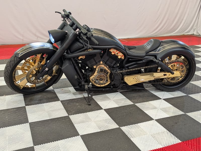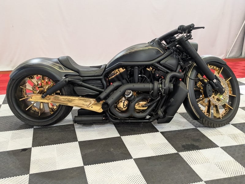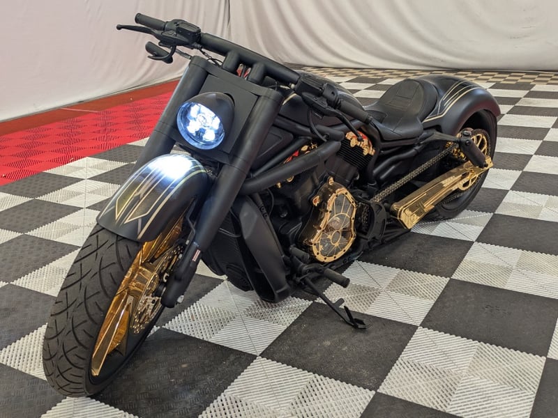 2016 Harley‑Davidson Night Rod custom motorcycle, professionally built by DGD Custom and finished in an aggressive gold and black colour scheme. Belt‑driven and powered by the iconic 1247cc (76.1ci) liquid‑cooled 60‑degree Revolution V‑Twin engine, paired with a manual transmission. Odometer indicates 9,877 kilometres.