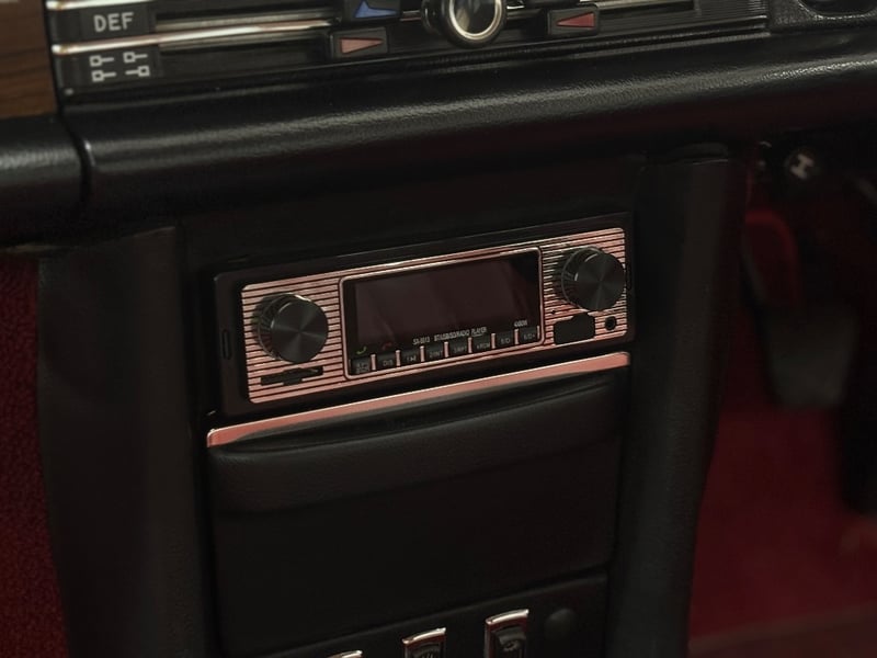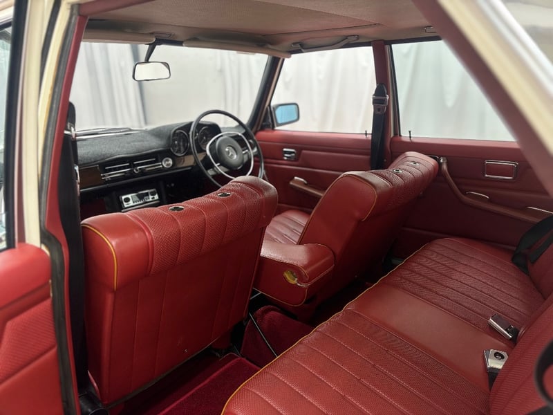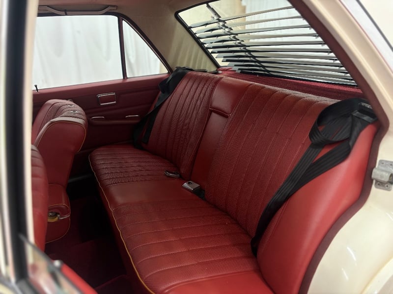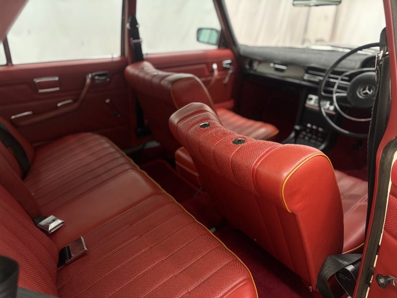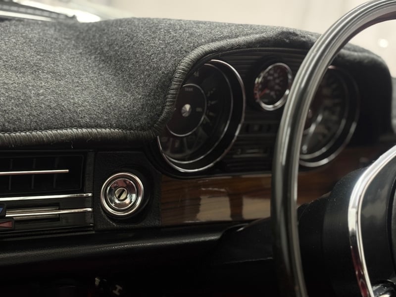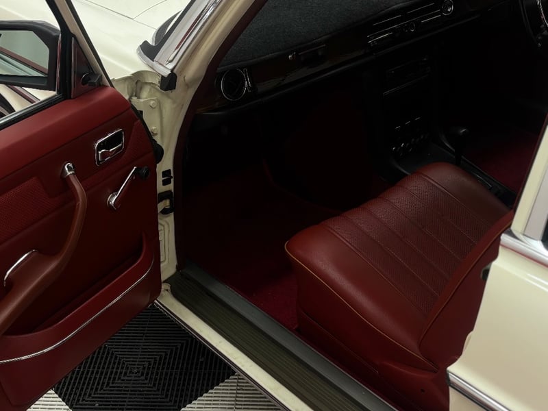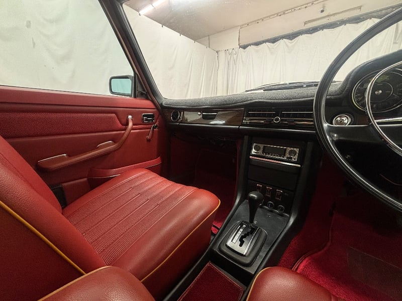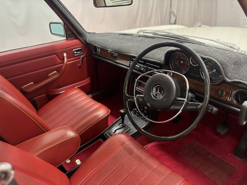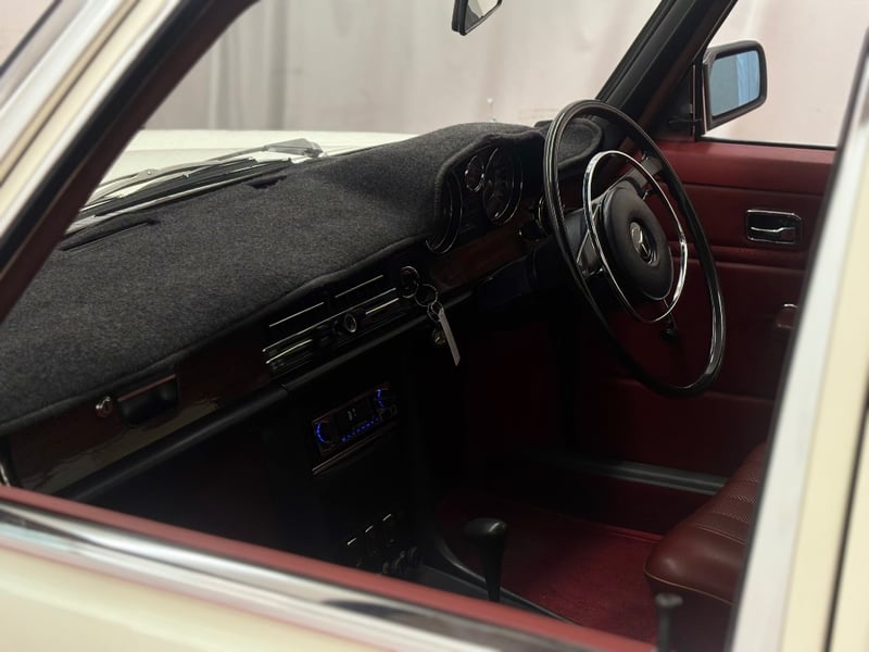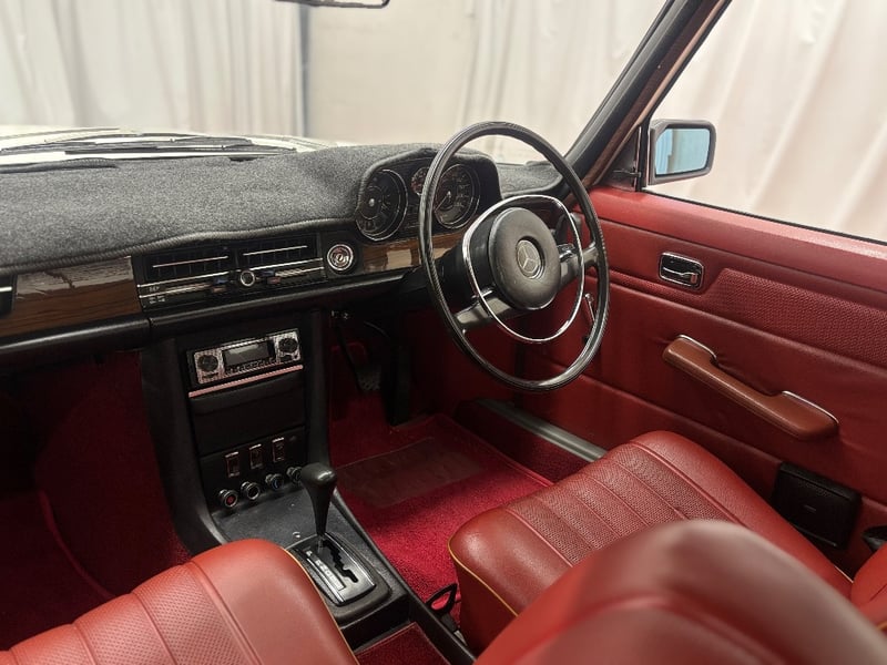 This Mercedes‑Benz 280C presents as a stylish example of Mercedes’ elegant 1970s design, combining solid engineering with timeless luxury. The interior is appointed with red leather upholstery complemented by a distinctive Zebrano wood dashboard, climate control, tinted windows, alloy wheels, and a Pioneer speaker system.