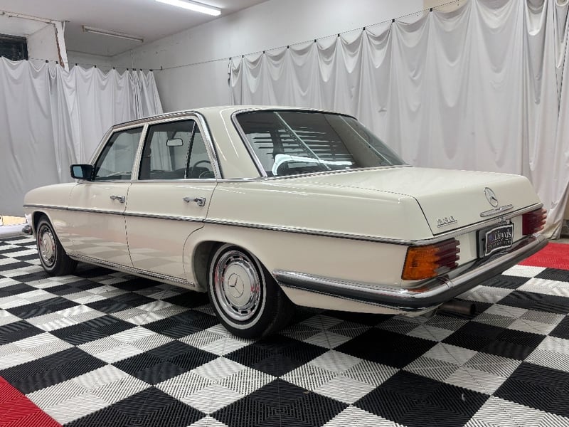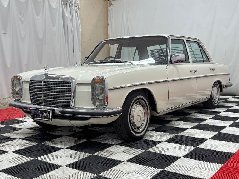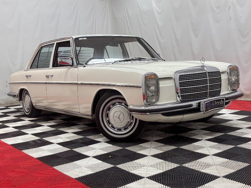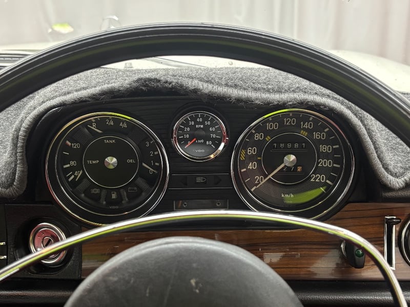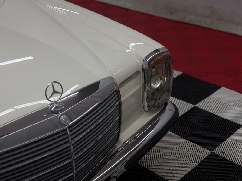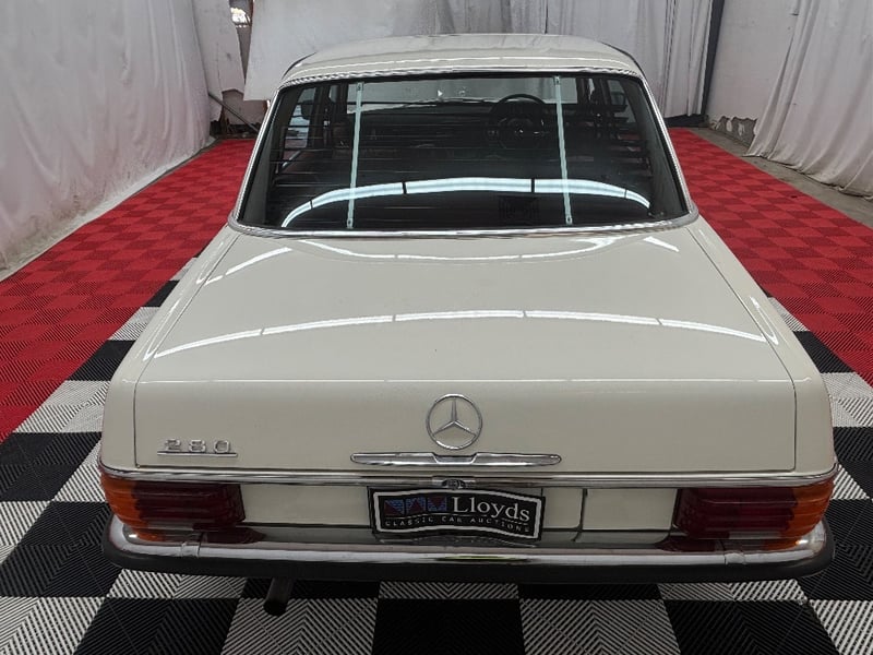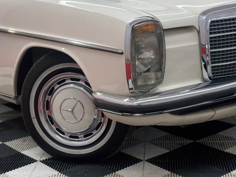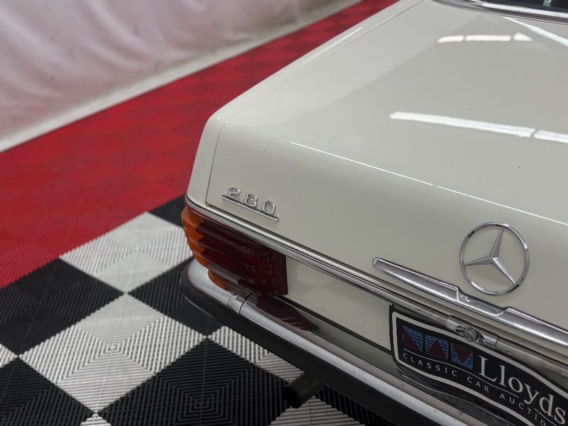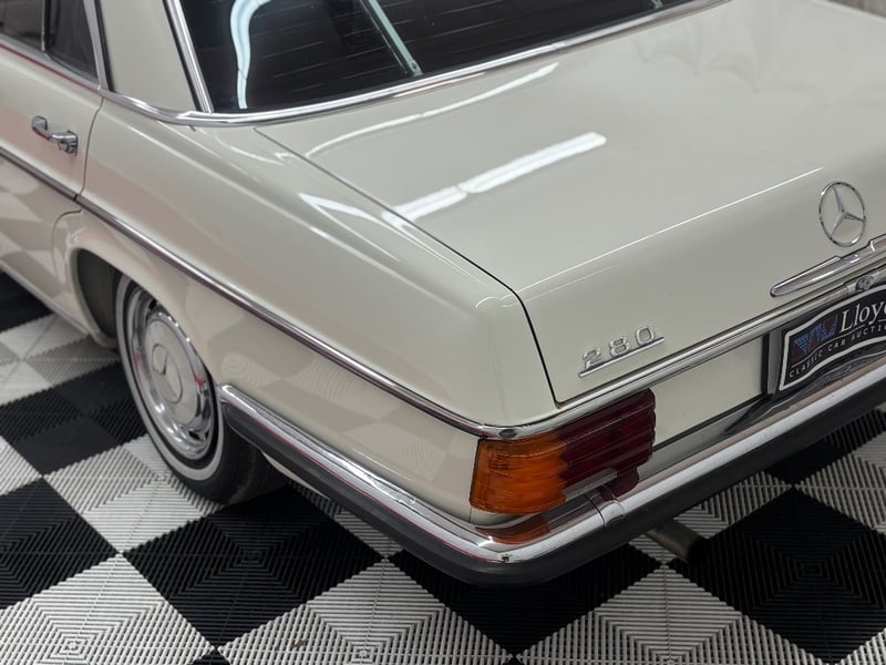 1973 Mercedes‑Benz 280C finished in classic white, featuring a rear‑wheel‑drive layout powered by a smooth 2.8‑litre inline‑six petrol engine paired with an automatic transmission. Odometer indicating 18,981 kilometres.