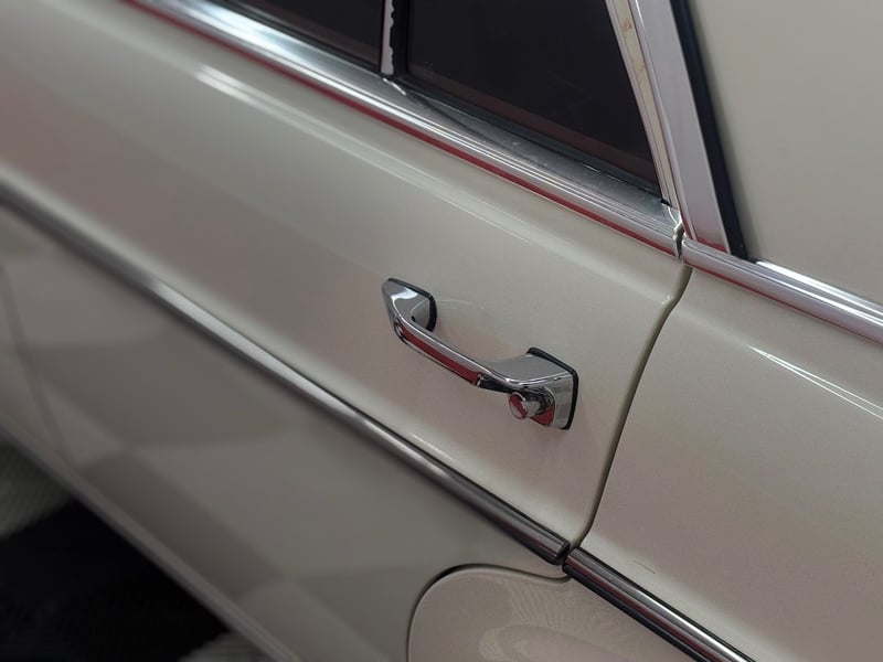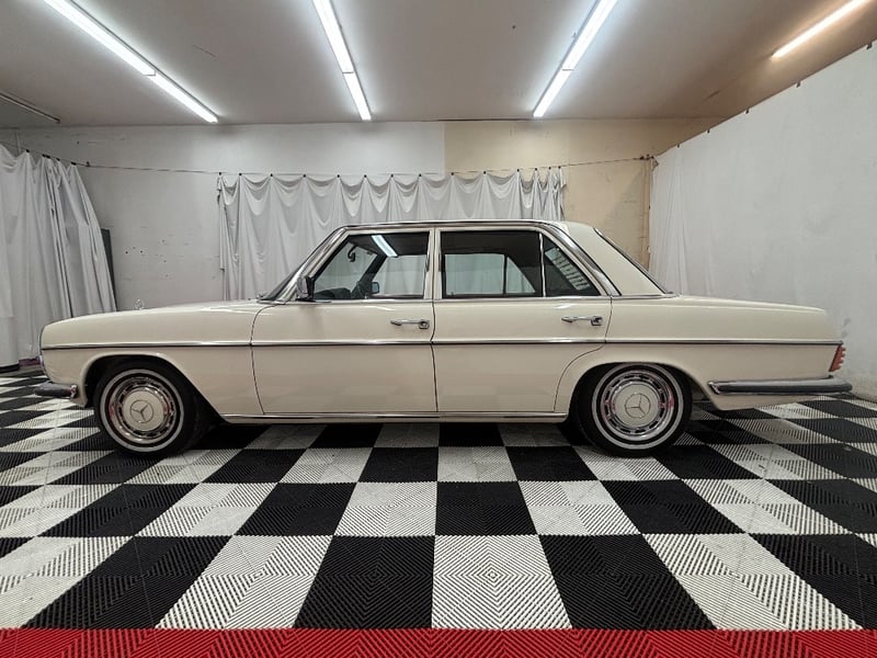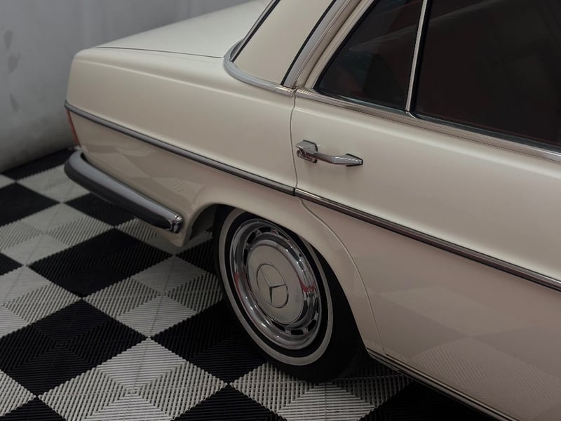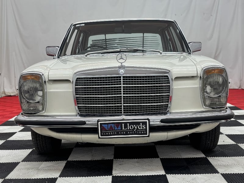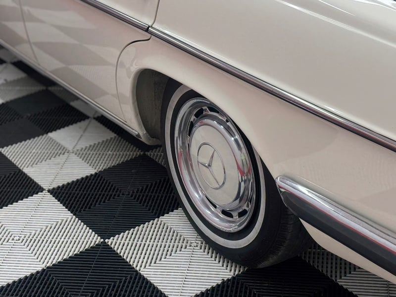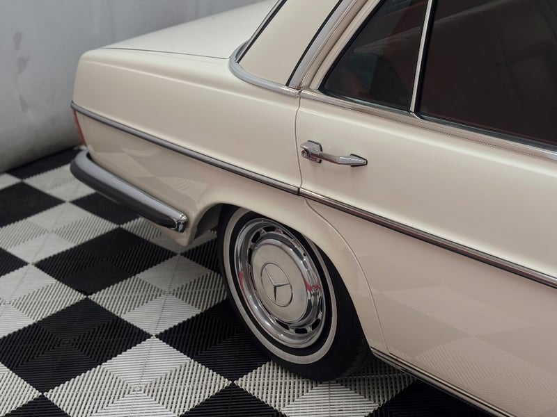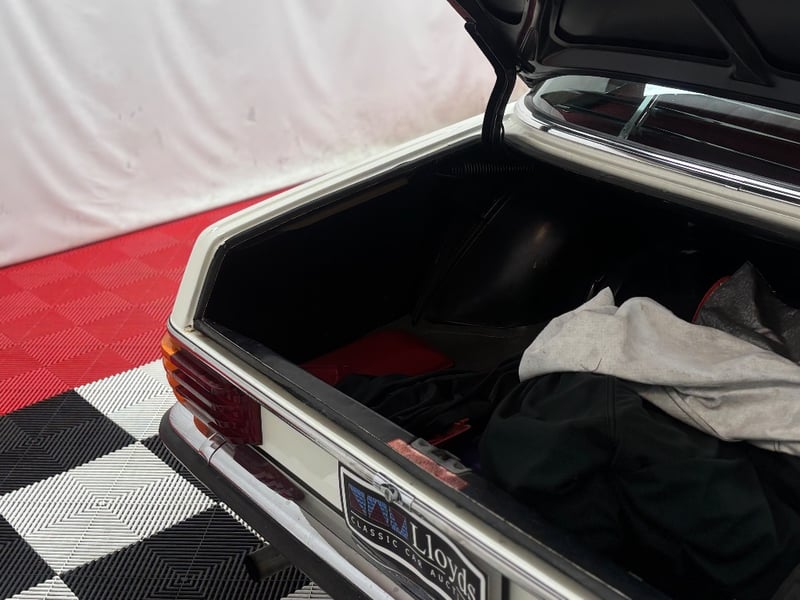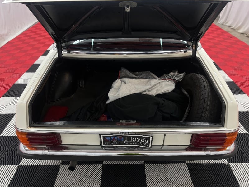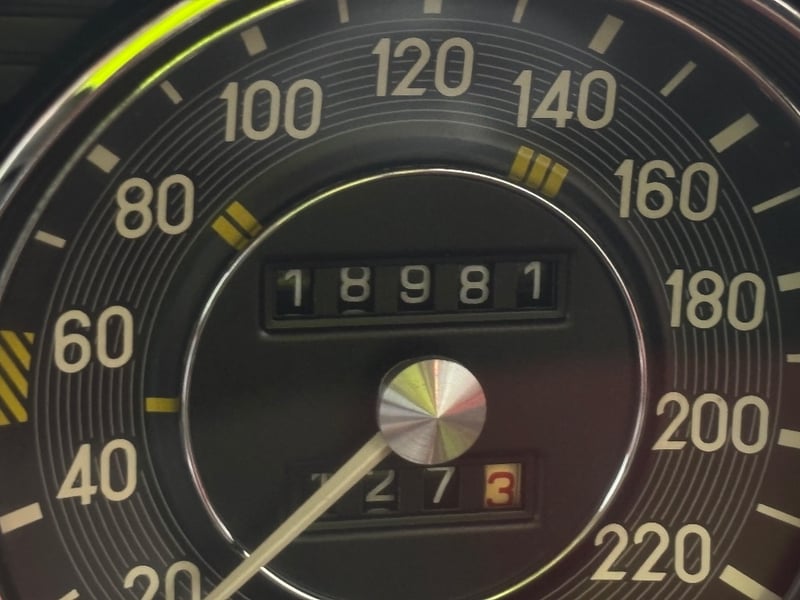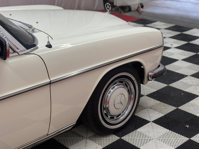 1973 Mercedes‑Benz 280C finished in classic white, featuring a rear‑wheel‑drive layout powered by a smooth 2.8‑litre inline‑six petrol engine paired with an automatic transmission. Odometer indicating 18,981 kilometres.