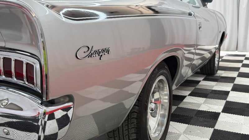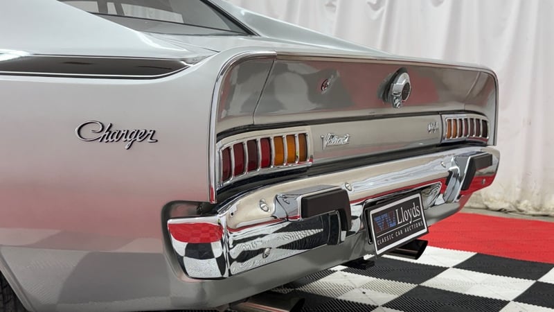 1973 Chrysler VJ Charger two‑door coupe finished in silver. Rear‑wheel drive configuration powered by a 5.2‑litre (318ci) V8 petrol engine paired with an automatic transmission. Odometer indicating 55,179 kilometres.