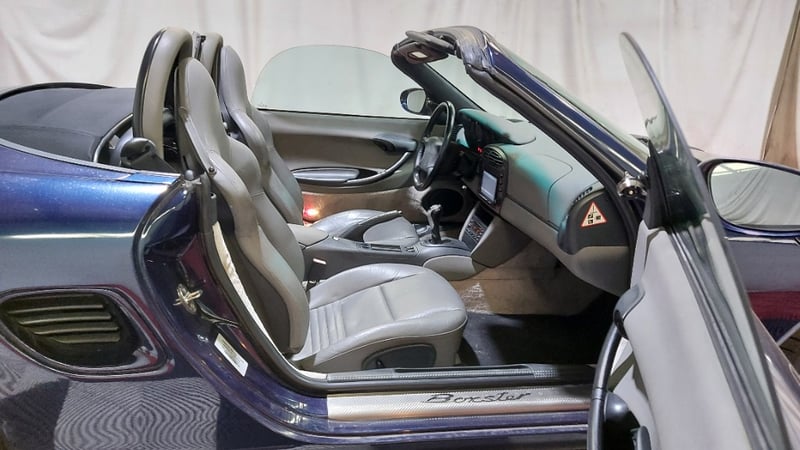 1998 Porsche Boxster (986) two‑door convertible, finished in blue and configured with rear‑wheel drive. Powered by a 2.5‑litre naturally aspirated petrol engine paired with a 5‑speed manual transmission. Odometer indicating 85,025 kilometres. This example is a fresh Japanese import and presents as a low‑kilometre entry into Porsche open‑top motoring.