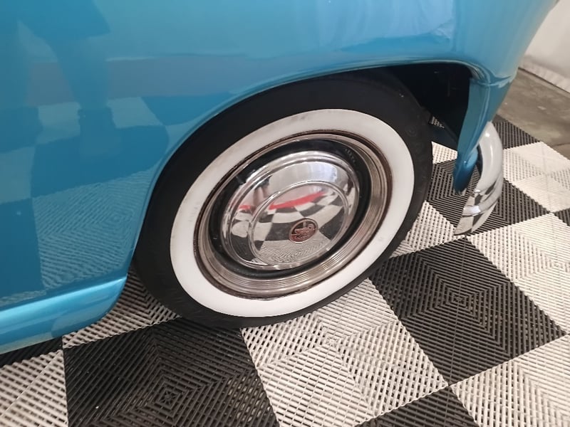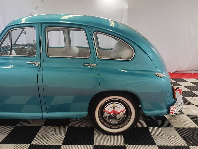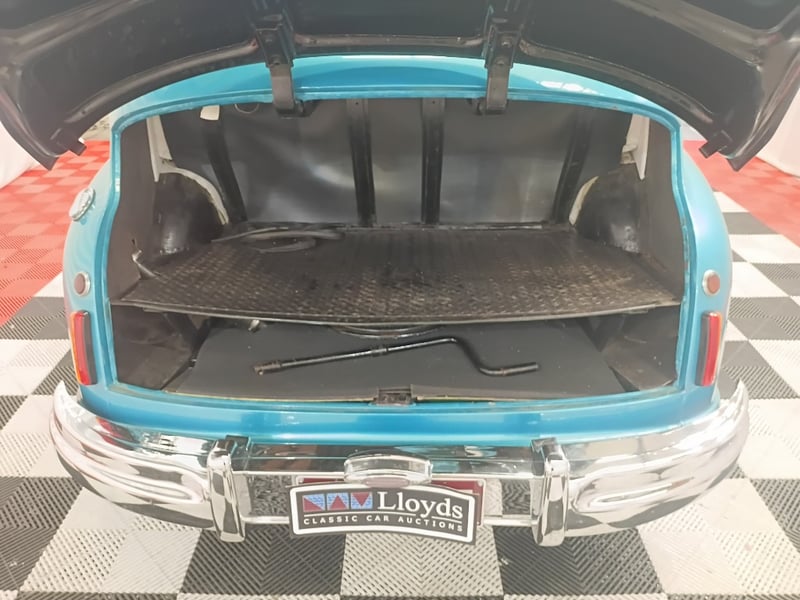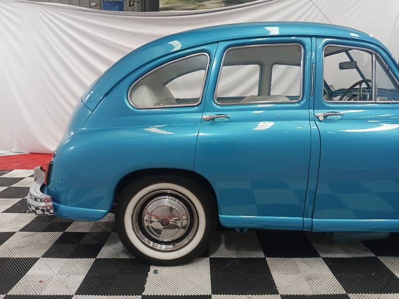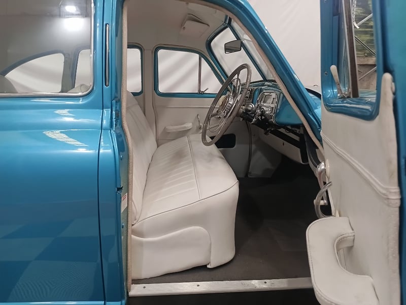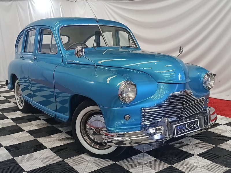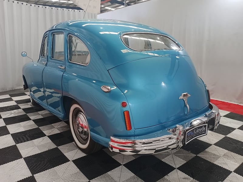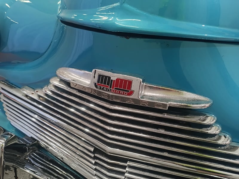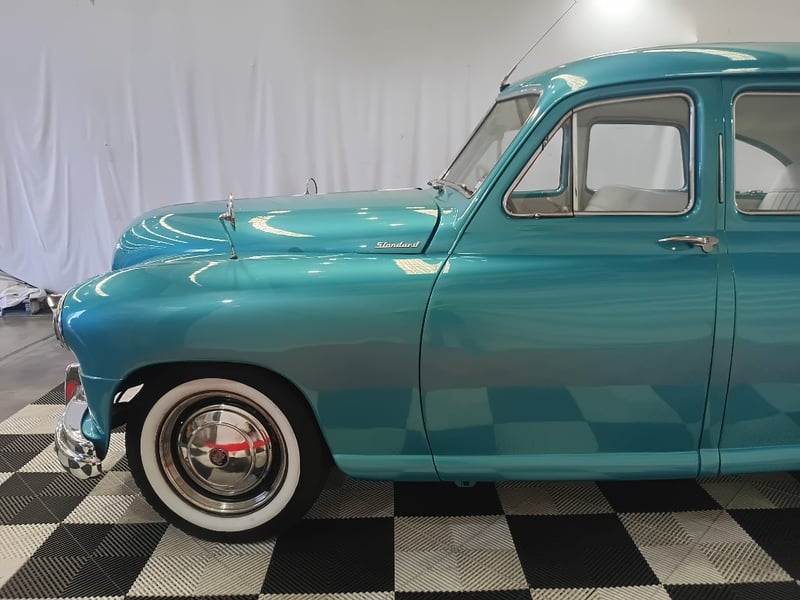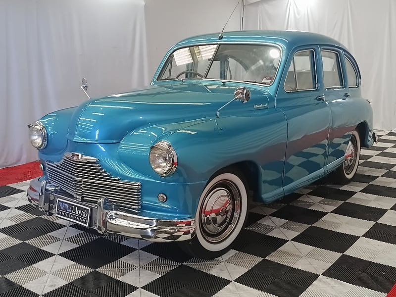 This Standard Vanguard presents as a beautifully styled post‑war classic, showcasing elegant lines and period charm. Finished in a striking turquoise, the car is complemented by bright chrome grille and bumper detailing, along with white‑wall tyres that enhance its timeless vintage appeal.