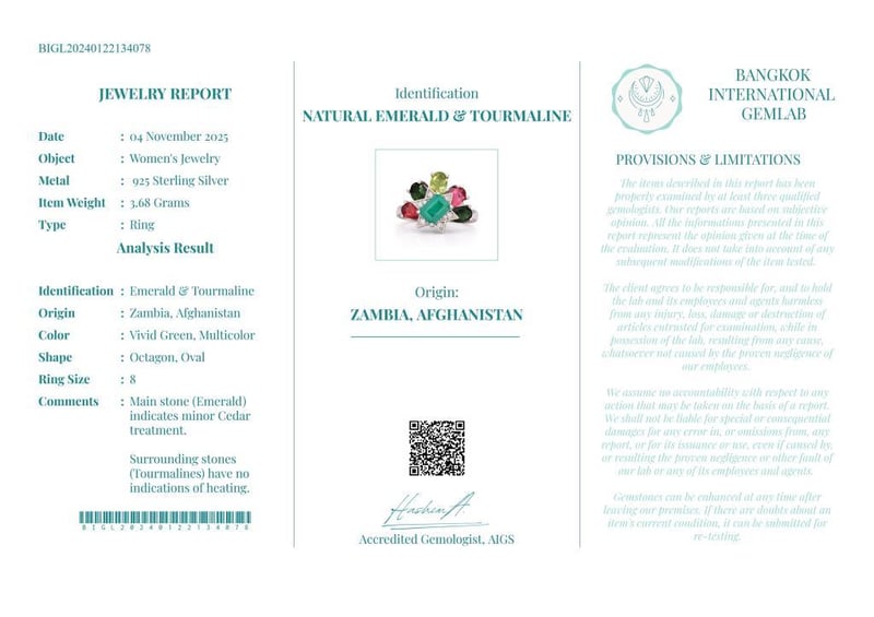 Comments : Main Stone (Emerald) Indicates Minor Cedar Treatment.