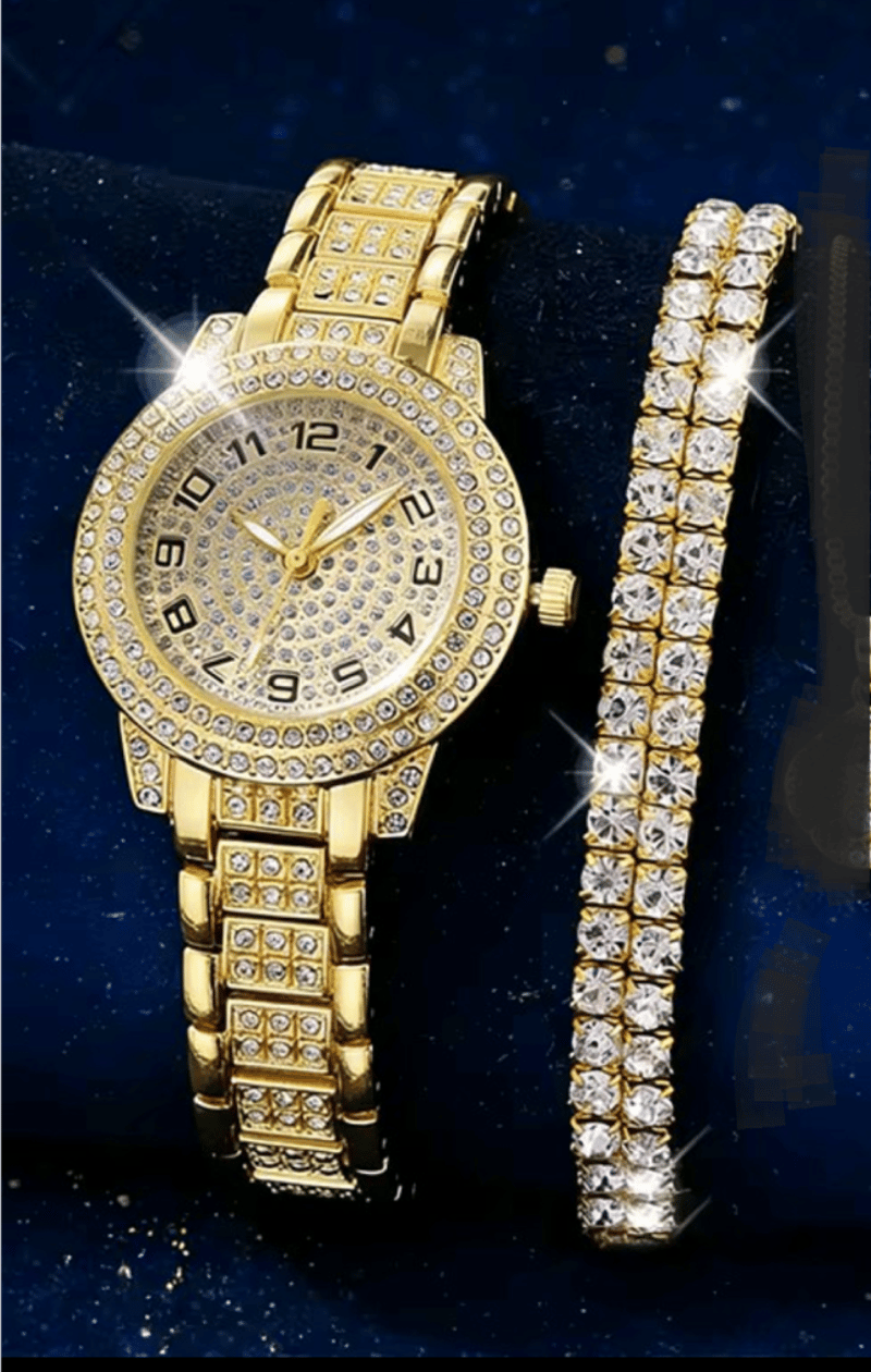 GOLD COLOUR STAINLESS STEEL WATCH AND BRACELET WITH CRYSTALS
