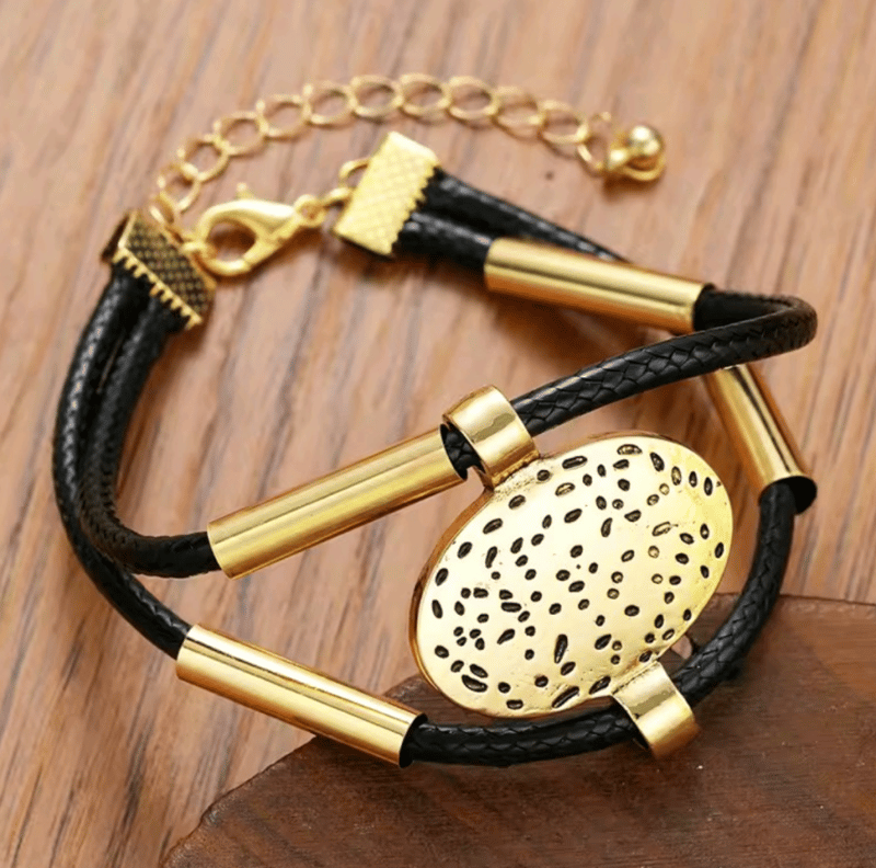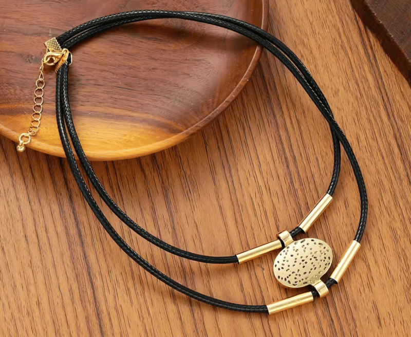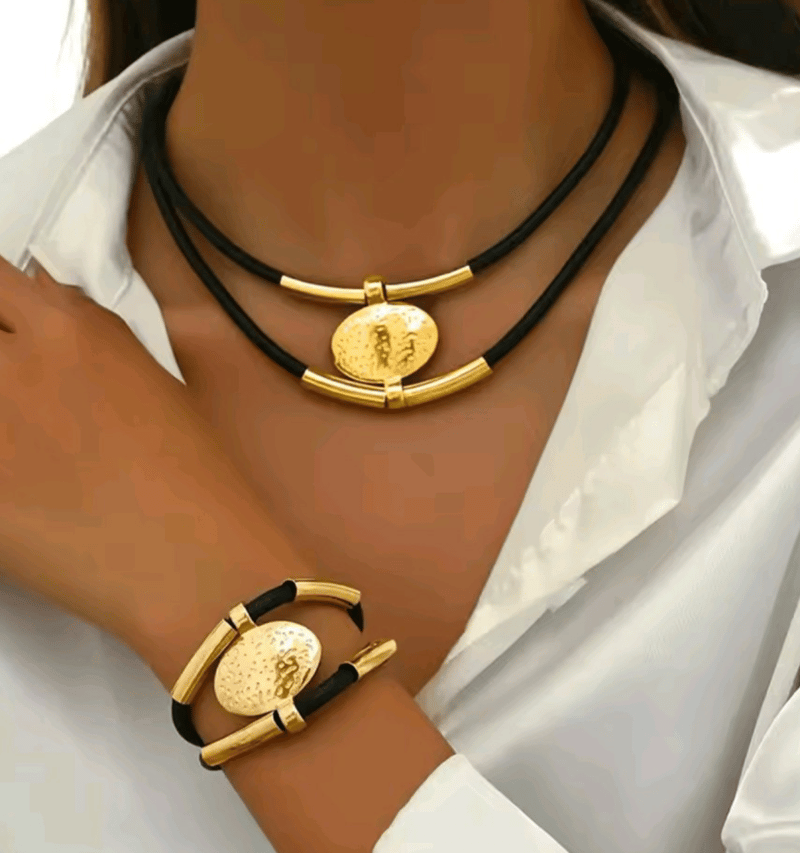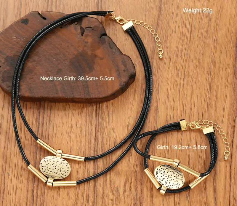 BLACK CORDED GOLD COLOUR STAINLESS STEEL NECKLACE BRACELET SET