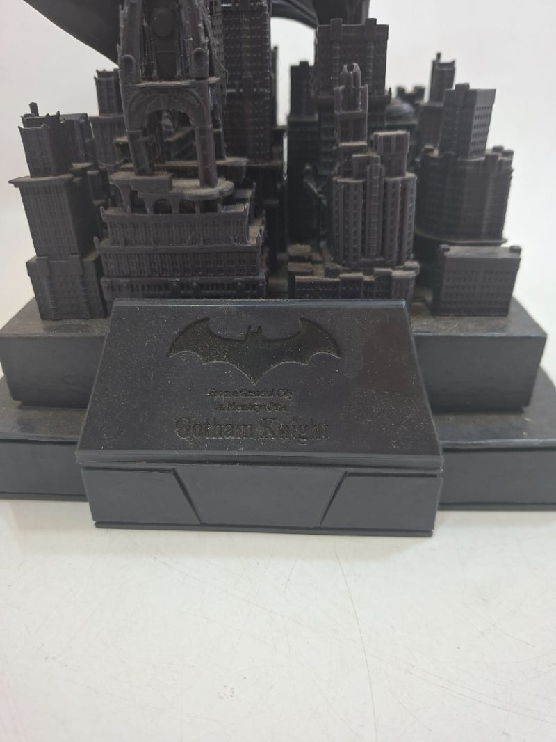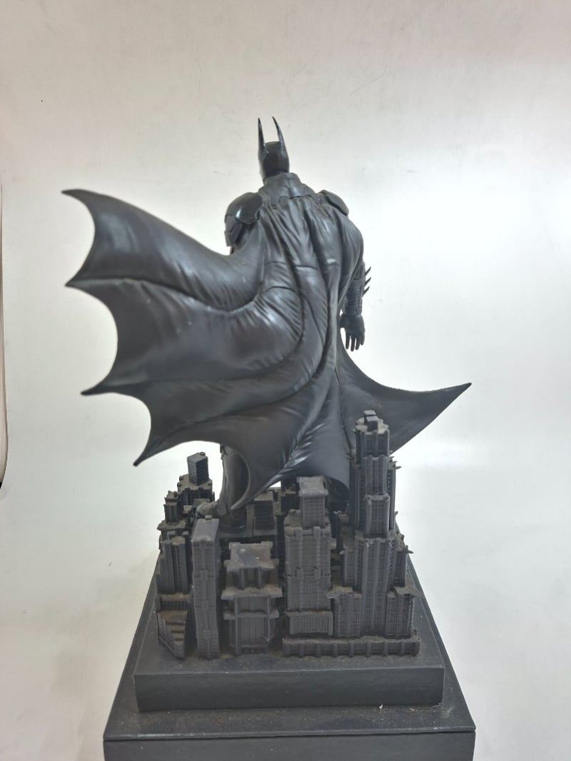 Impressive Monochromatic Resin Collectible Statue Depicting Batman In Heroic Stance Astride An Intricately Detailed Gotham City Skyline Base. Features Dynamic Billowing Cape, Muscular Anatomical Sculpting, And Architectural Cityscape With Gothic Architectural Elements. Base Includes Engraved Plaque. Dark Metallic Finish Throughout With Exceptional Detail Work On Building Facades And Batman'S Costume Detailing.