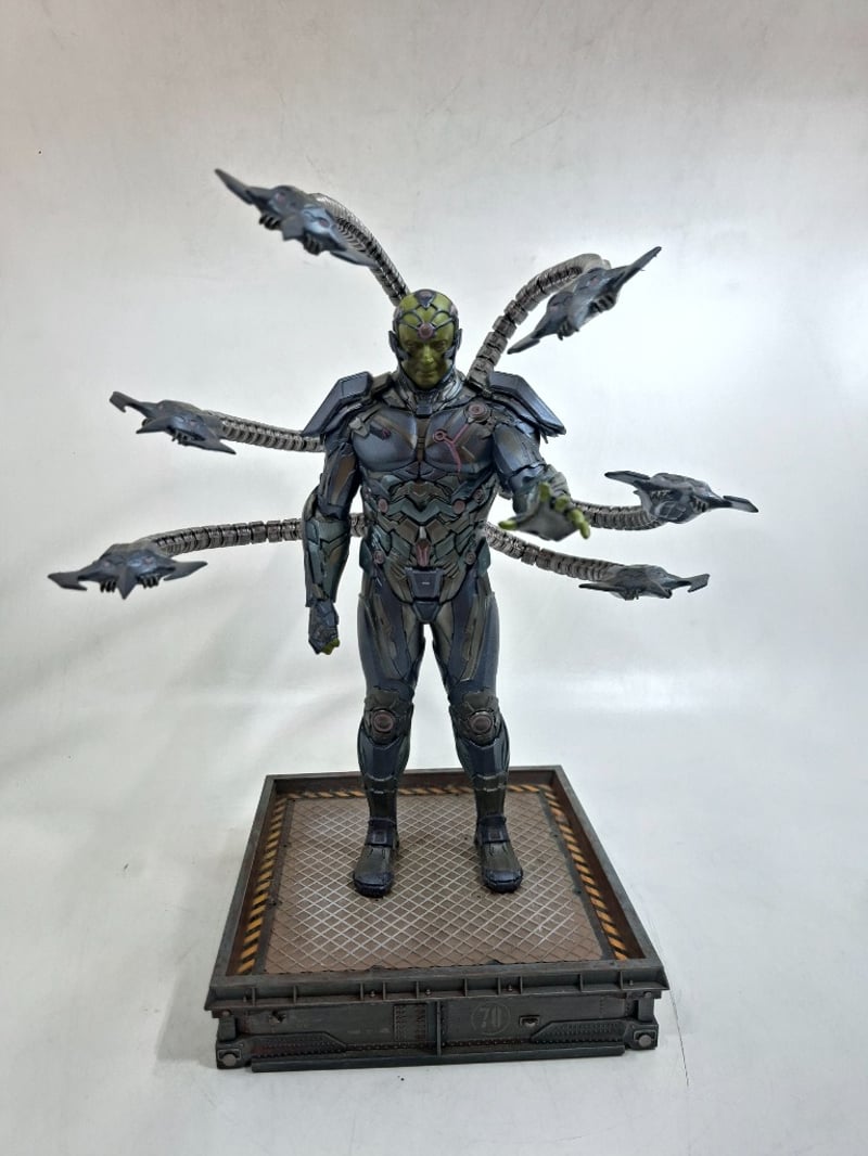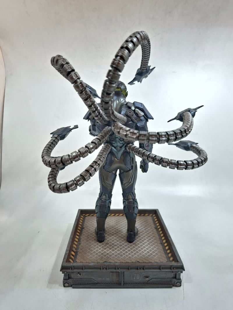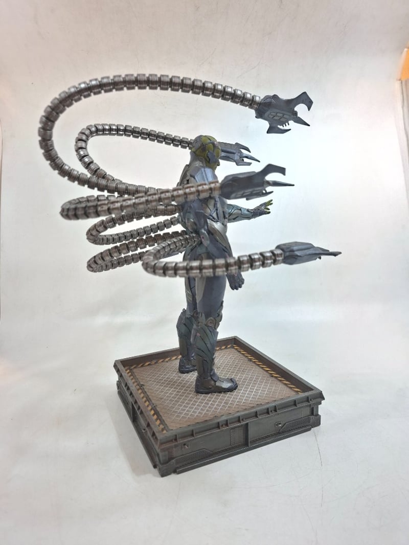 Highly Detailed Collectible Figurine Featuring A Humanoid Character With Yellow-Green Facial Features And Metallic Grey Armor Plating, Mounted On An Industrial-Style Platform Base. The Figure Displays Eight Articulated Segmented Tentacle Appendages With Claw-Tipped Ends, Demonstrating Exceptional Sculpting And Articulation. Intricate Detailing Throughout The Bodysuit, Armor Segments, And Tentacles Showcases Professional Paint Application With Metallic Accents. Character Appears To Be From Scienc