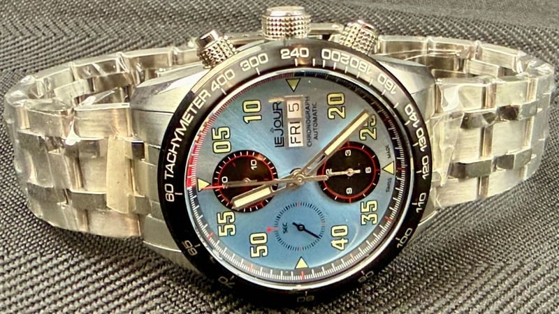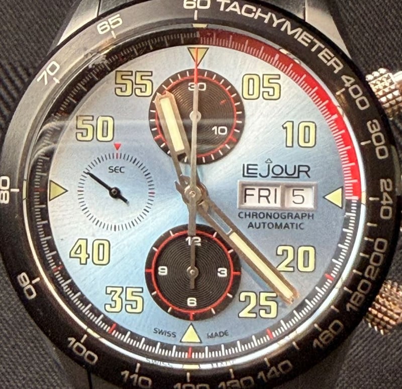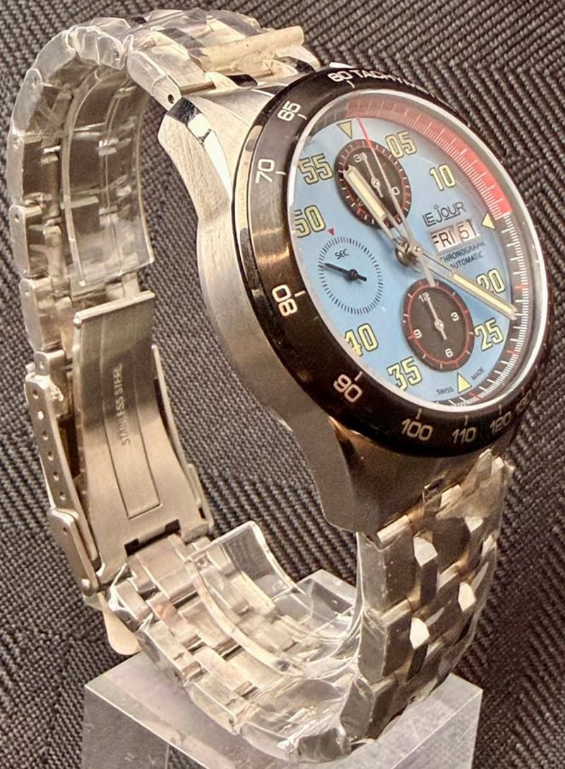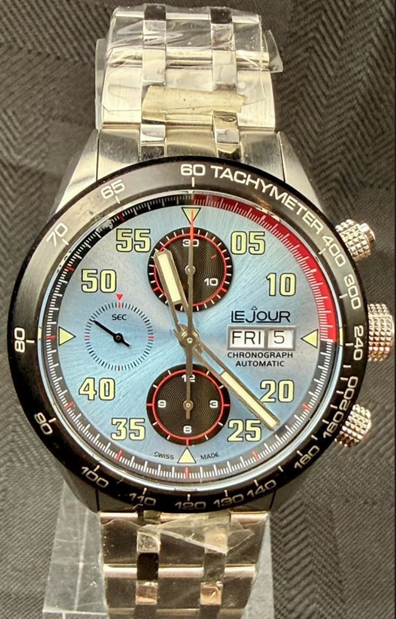LEJOUR ROADSTER BLUE Condition: Good - Refer To Images Year: 2023 Additional Information: 316L Stainless Steel Case And Bracelet Case Size : 42Mm ( Excluding Crown ) Case Height : 15.50Mm ( Including Crystal And Caseback ) Case Length : 49Mm ( L2L ) Lug Width : 22Mm Black Cordura® Strap Sapphire Crystal With Anti-Reflective Treatment Ice Blue Dial With Black Colour Subdials Fixed Bezel In Stainless Steel With Ip Black Finish Grade C3, Swiss Super-Luminova On Hands And Indices Sw500 Swiss Automatic – Chronograph Movement Water Resistant Up To 20 Bar / 200 Meters BOX: INCLUDED PAPERS: INCLUDED XD 587850+2