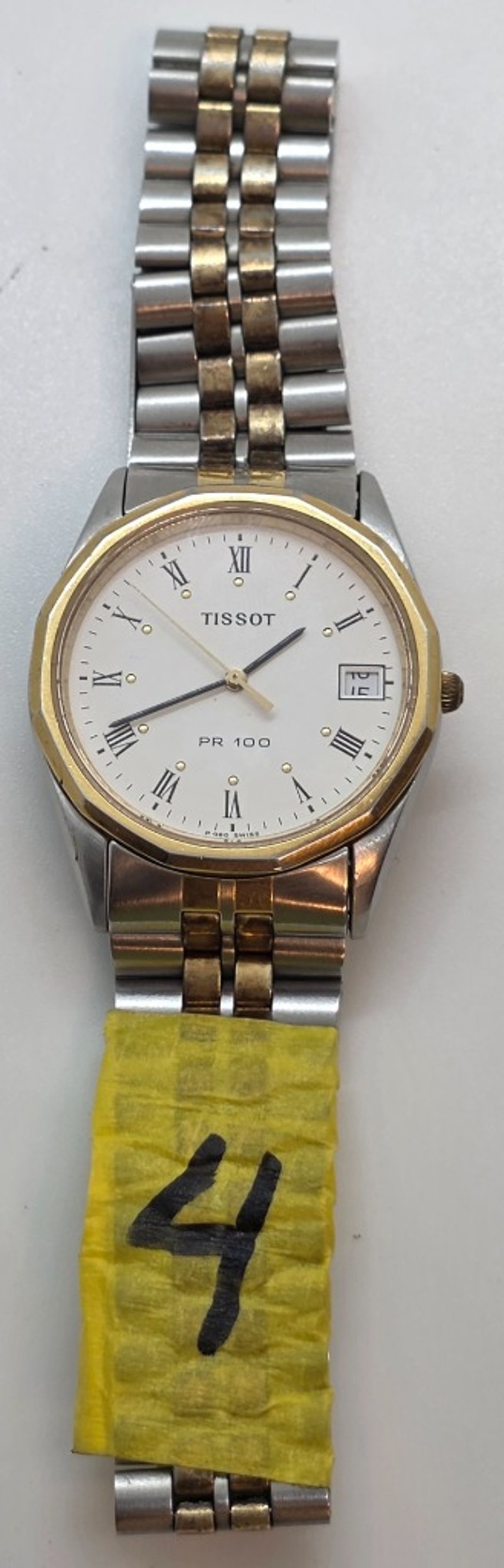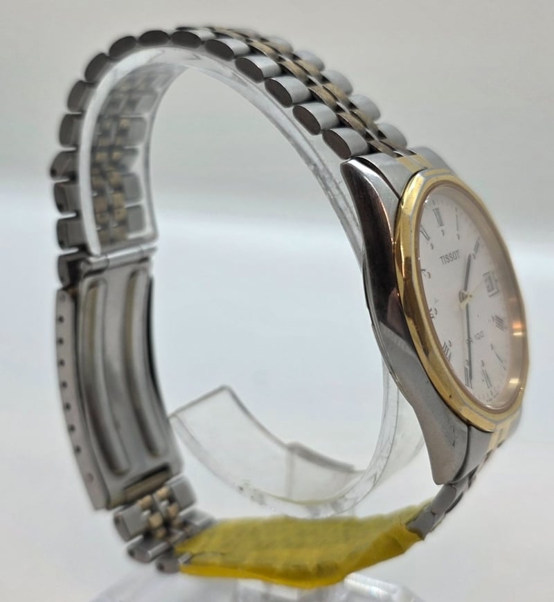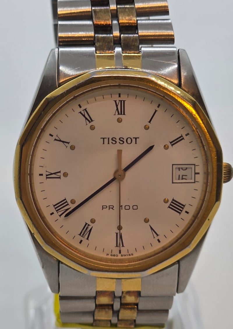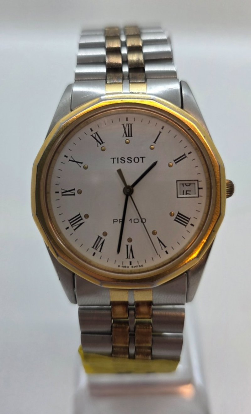 TISSOT PR100 P330/430 1980 REFERENCE NO. P330/430PRODUCTION YEAR: 1980DIAL: 12-HOUR ROMAN NUMERAL, WHITECASE DESCRIPTION: TWO TONE SILVER/GOLD STAINLESS STEELCASE SIZE: 25MMBRACELET: TWO TONE SILVER/GOLD STAINLESS STEELMOVEMENT: ANALOG, QUARTZBOX: NOT INCLUDEDPAPERS: NOT INCLUDEDCondition: Good - Refer To ImagesAdditional Information: Bezel: GoldWater Resistance: 100 M (10 Atm)Glass: Sapphire CrystalCrown: 2MmACACIA RIDGE584442+4
