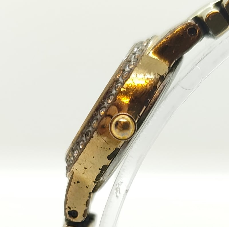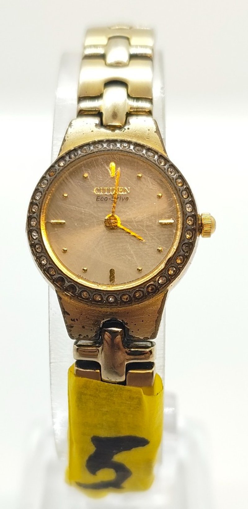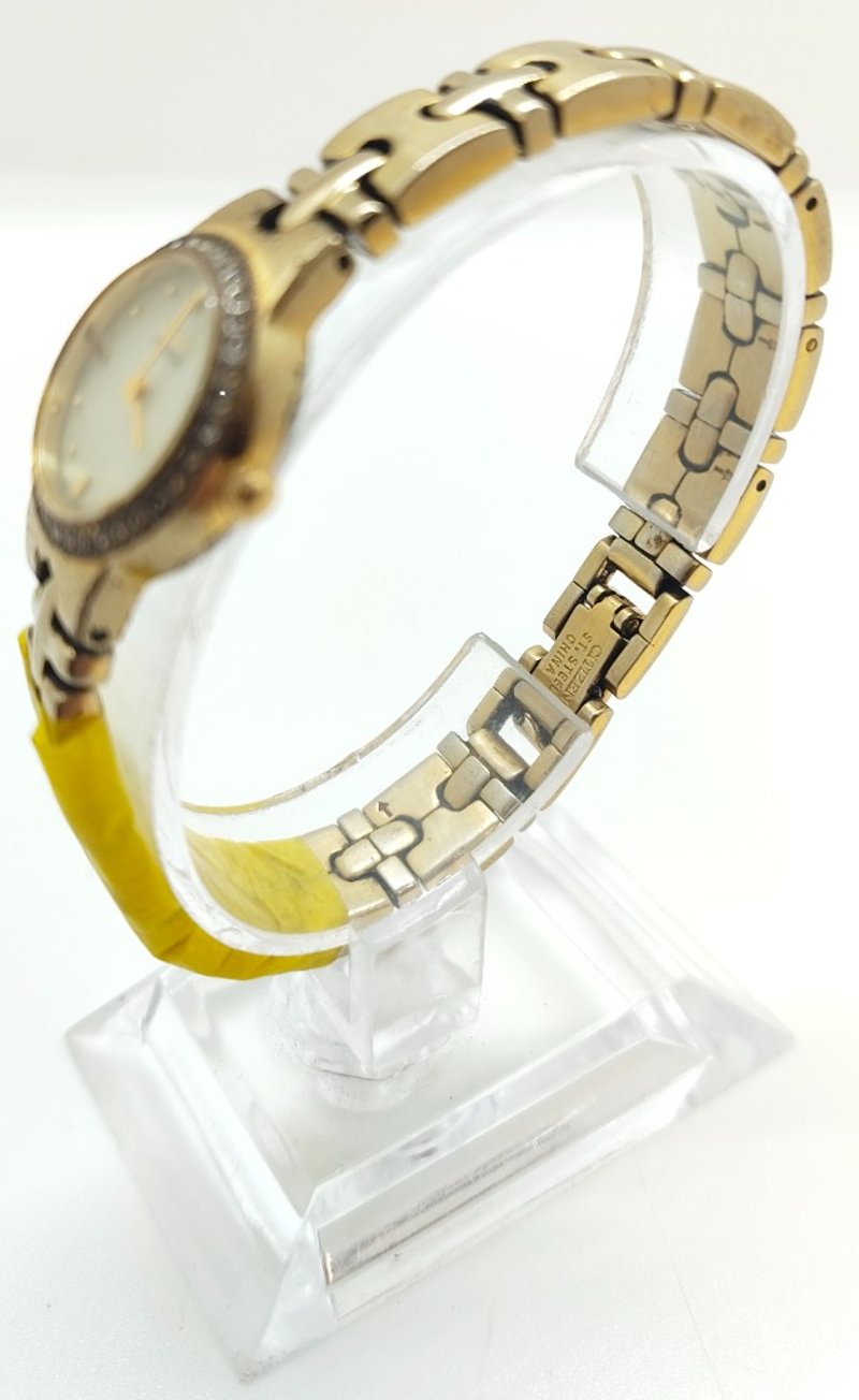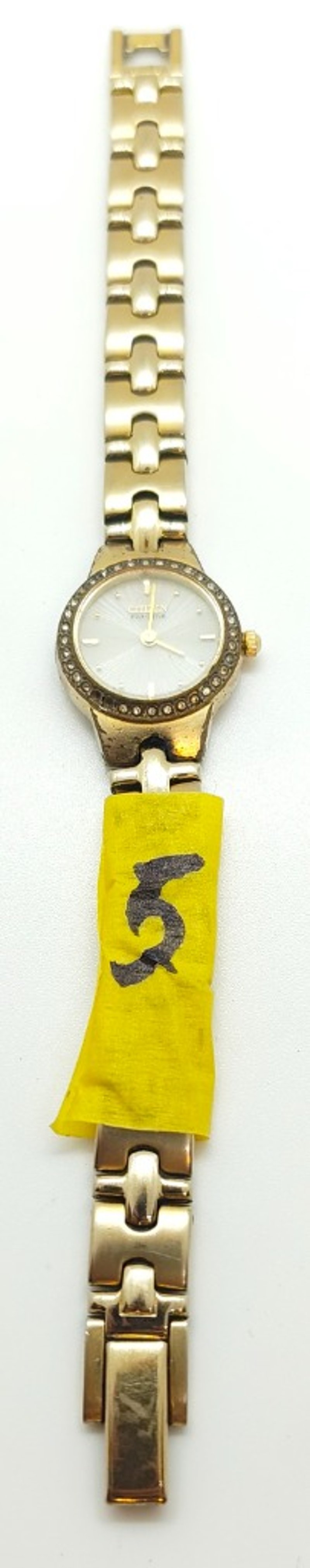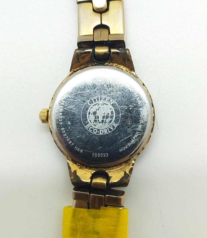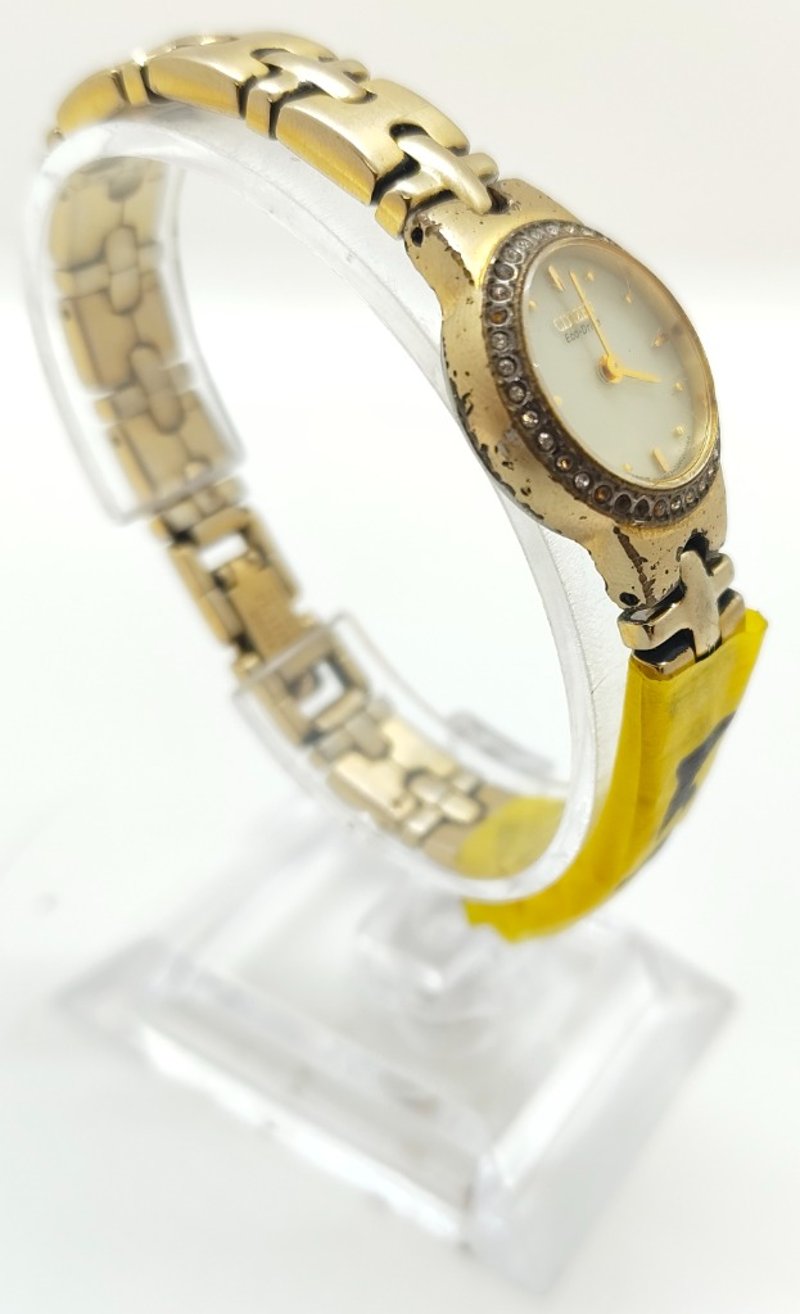 CITIZEN ECO-DRIVE SILHOUETTE BO23SO27497 UNKN REFERENCE NO. BO23SO27497PRODUCTION YEAR: UNKNDIAL: 12-HOUR, CREAM COLOURED BASE, GOLD TONE DOT INDICES AND GOLD TONE HANDSCASE DESCRIPTION: GOLD TONE BASE METALCASE SIZE: 21MMBRACELET: GOLD TONE BASE METAL BRACELETMOVEMENT: ANALOG, SOLAR (ECO DRIVE)BOX: NOT INCLUDEDPAPERS: NOT INCLUDEDCondition: Fair - Refer To ImagesAdditional Information: Bezel: Crytal Set (Missing 3 Crystal Pieces)Glass: Mineral CrystalWater Reistance: 30 Meters584442+5