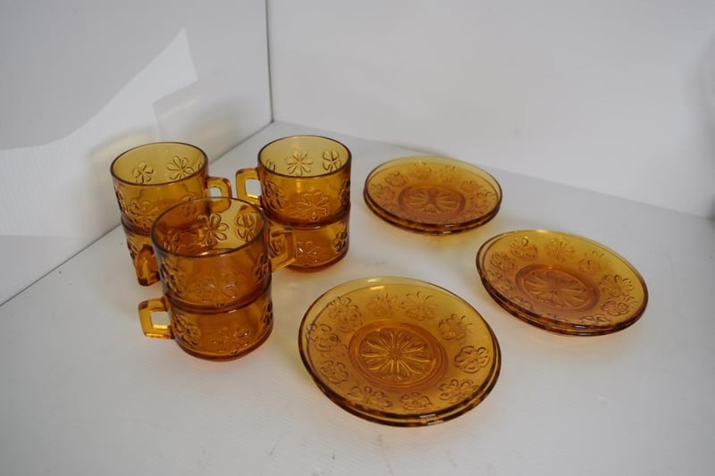 Vintage floral lily pattern brown glass cup saucer set of 6
