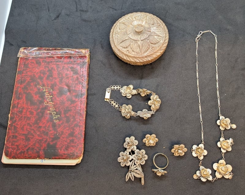 COLLECTION OF SILVER FILIGREE JEWELLERY WITH CARVED JEWELRY BOX AND AUTOGRAPHED GUEST BOOK, CIRCA 1939