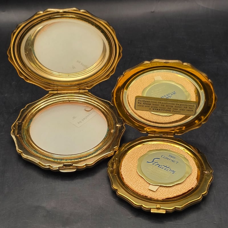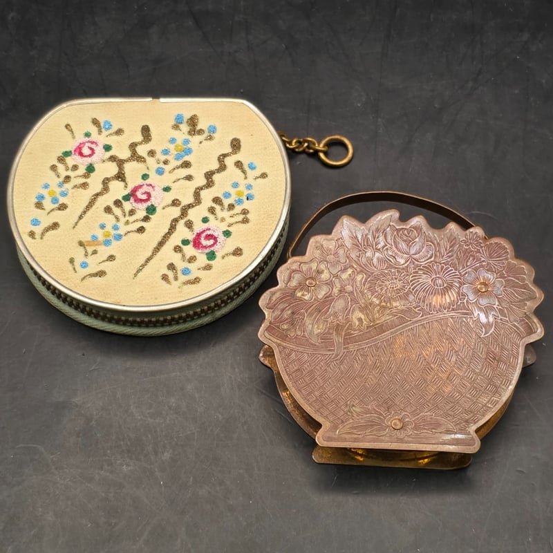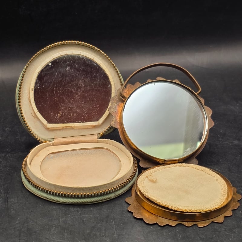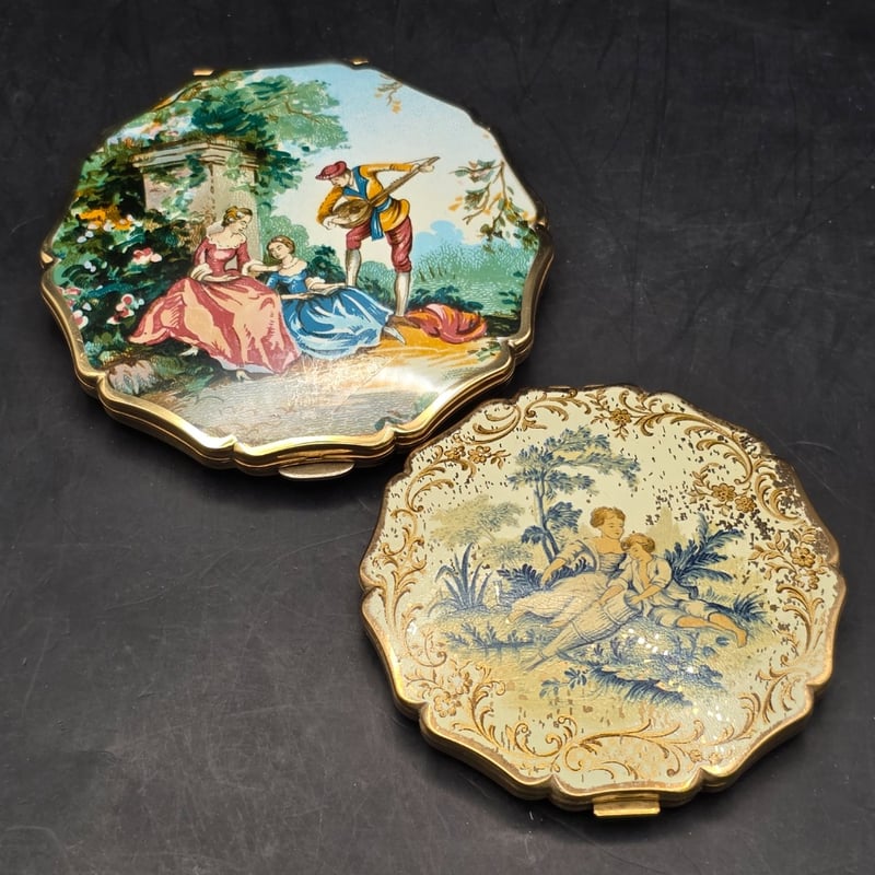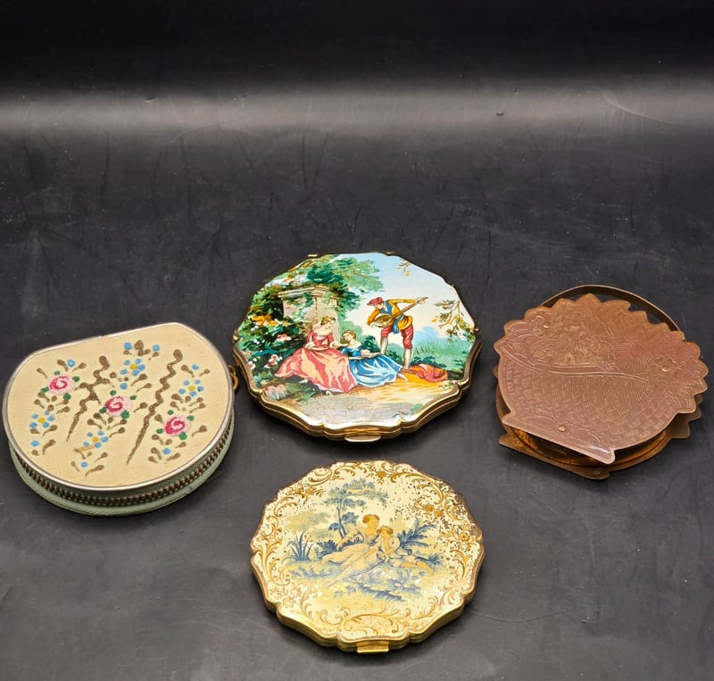 1950S Stratton Enamel Painted Victorian Sifter, 1940S Well Fifty Avenue New York Basket Powder Compact Puff, 1950S Semi Circle Compact Fabric Zip Purse, 1950S Stratton Enamel Compact Powder Sifter Including Original Instruction Sticker