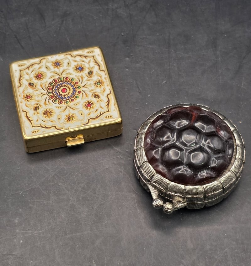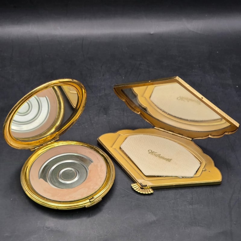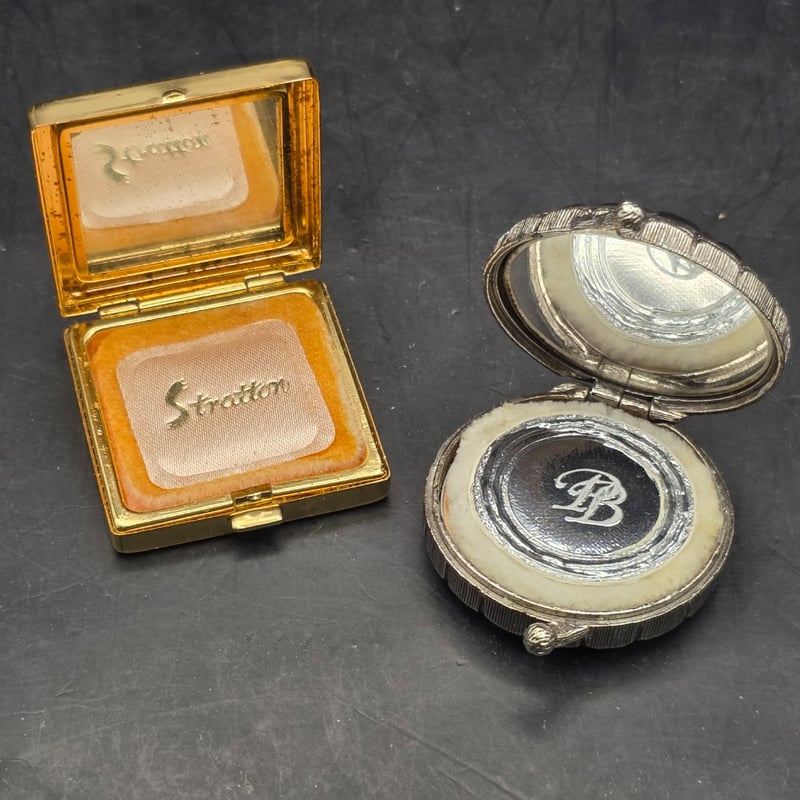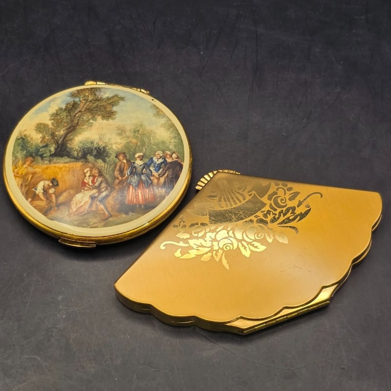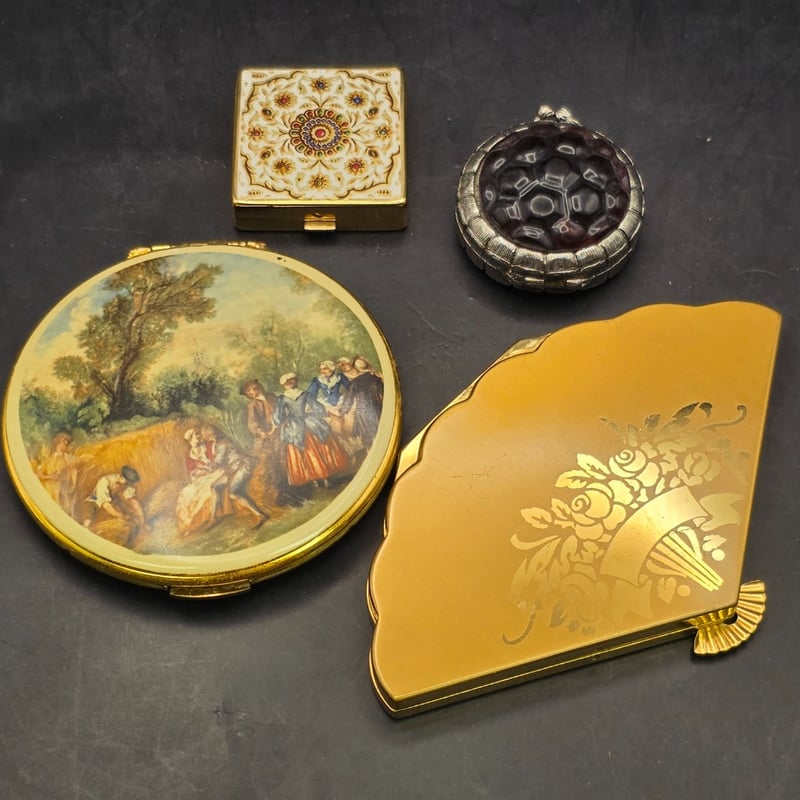 1950 Stratton Mini Compact Powder With Puff And Label, 1940S Wadsworth Henrietta Floral Etched Fan Powder Compact With Puff And Sifter, Polly Bergen Turtle Back Powder Compact With Puff And Powder, 1940S-50S Kigu Painted Enamel Victorian Scene With Powder