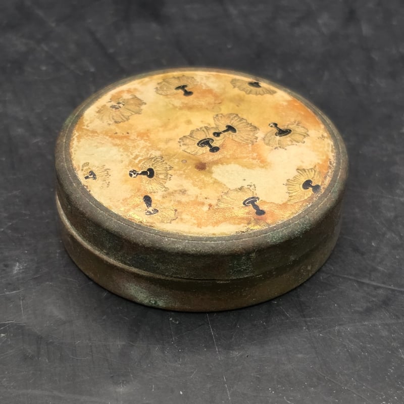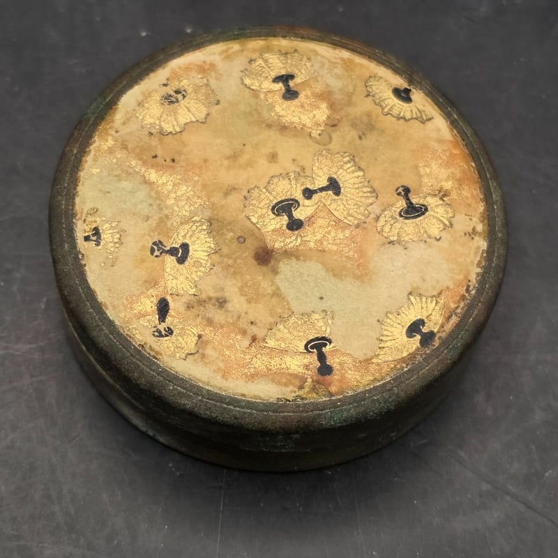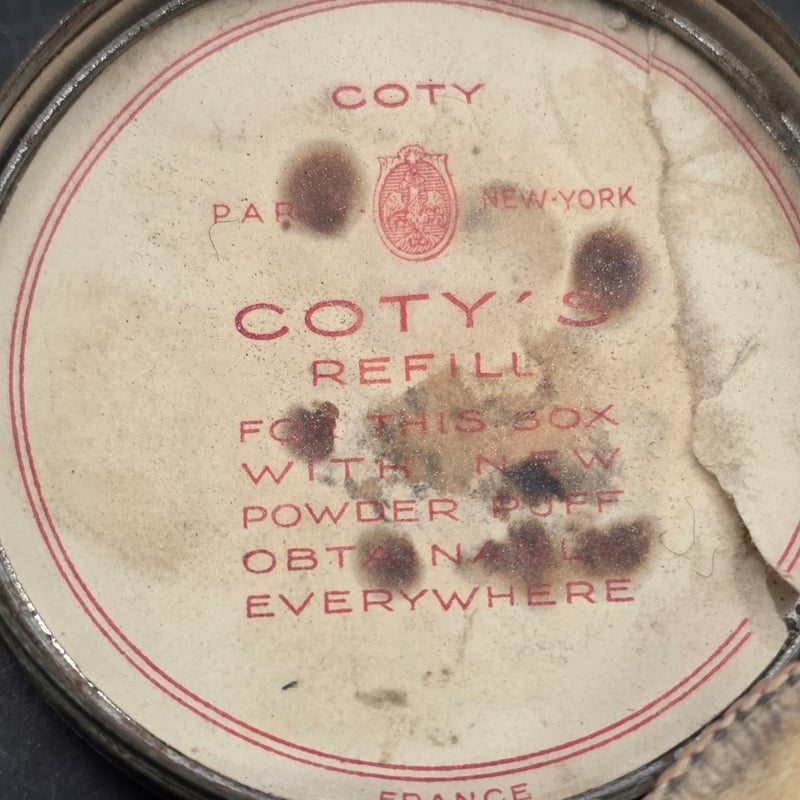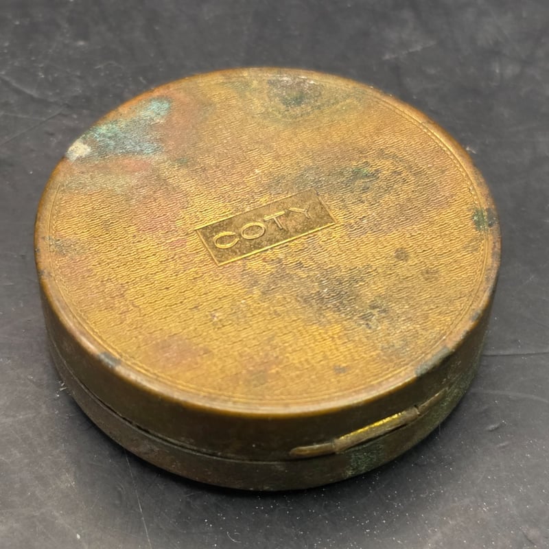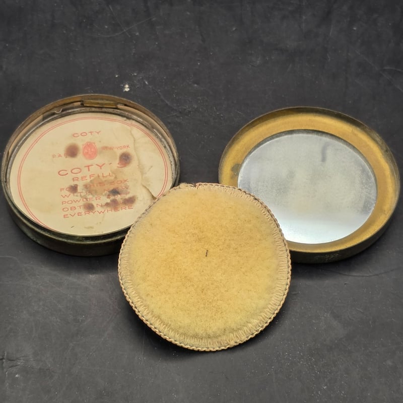 1920S-30S COTY DESIGNED BY RENE LALIQUE, POWDER CAN COMPACT AIR SPUN GOLD AND BLACK SILK MATERIAL WITH PUFF