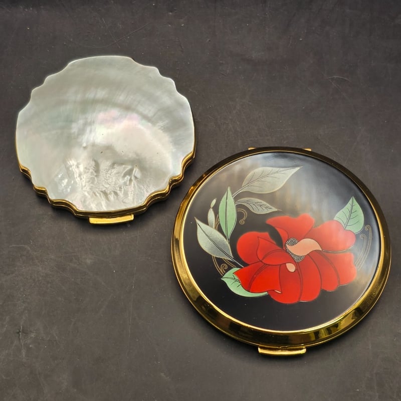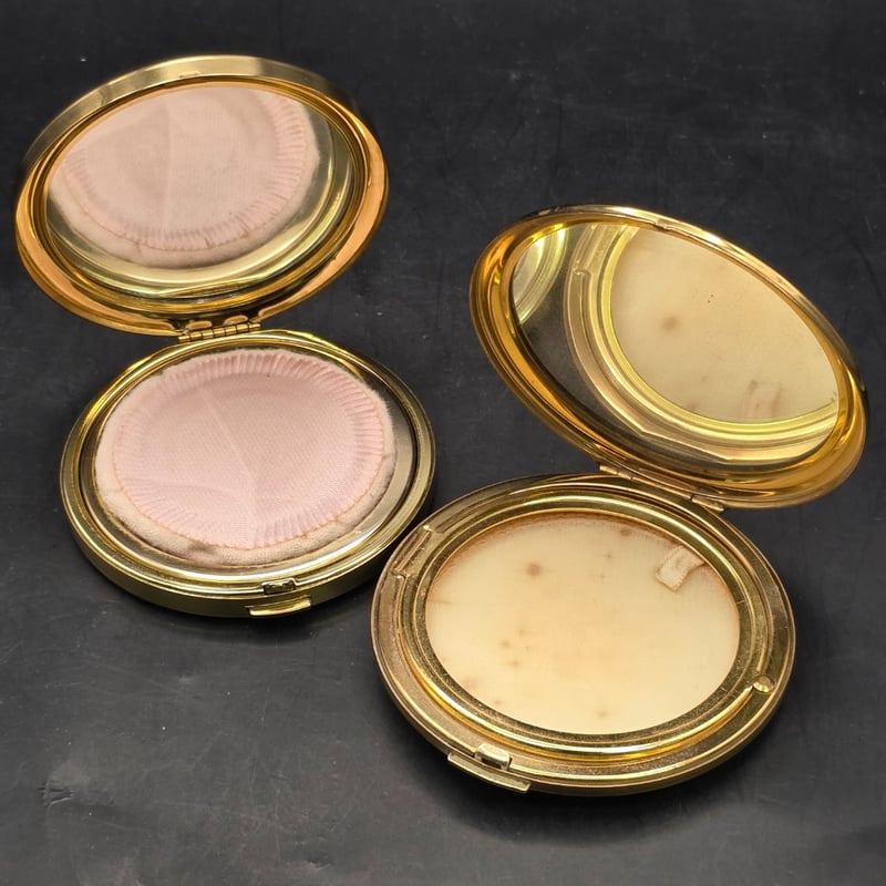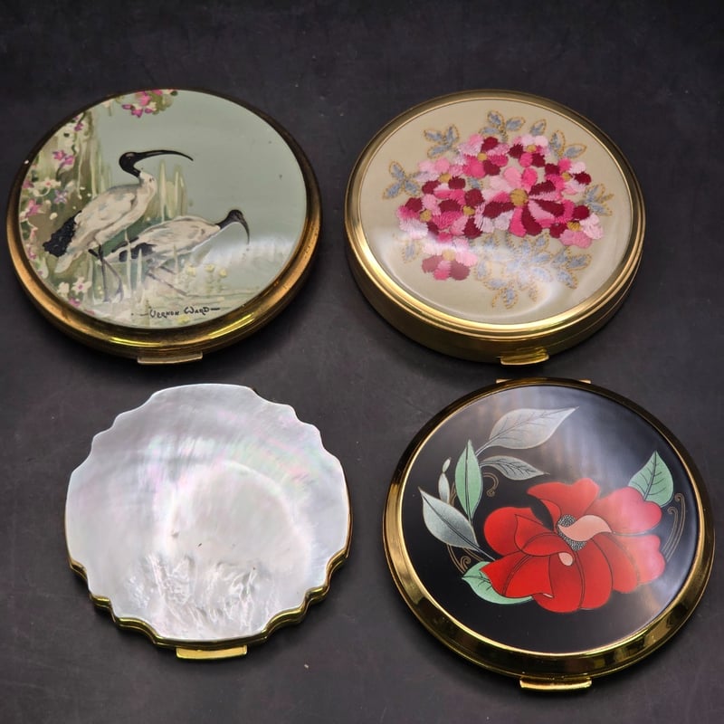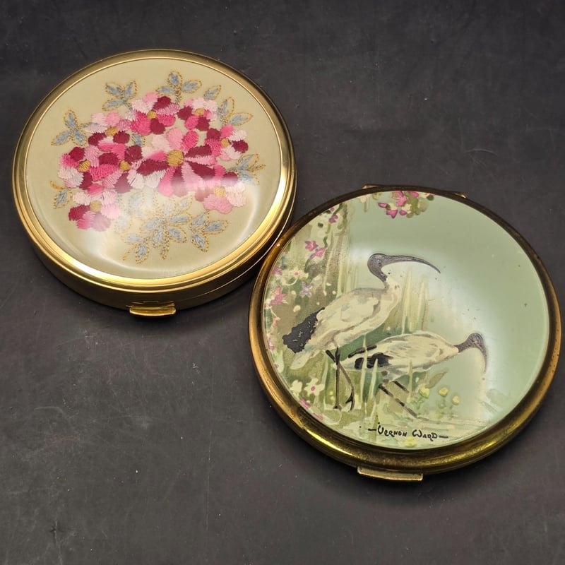 1950S Stratton Powder Compact With Puff And Instruction Booklet In Original Pouch, 1950S Stratton Shell Shaped Powder Compact With Puff Sifter Label And Instructions Tag, 1950S Petit Powder Compact Silk Screen With Puff And Sifter, 1950S Stratton Powder Compact With Sifter Depicting Ibis