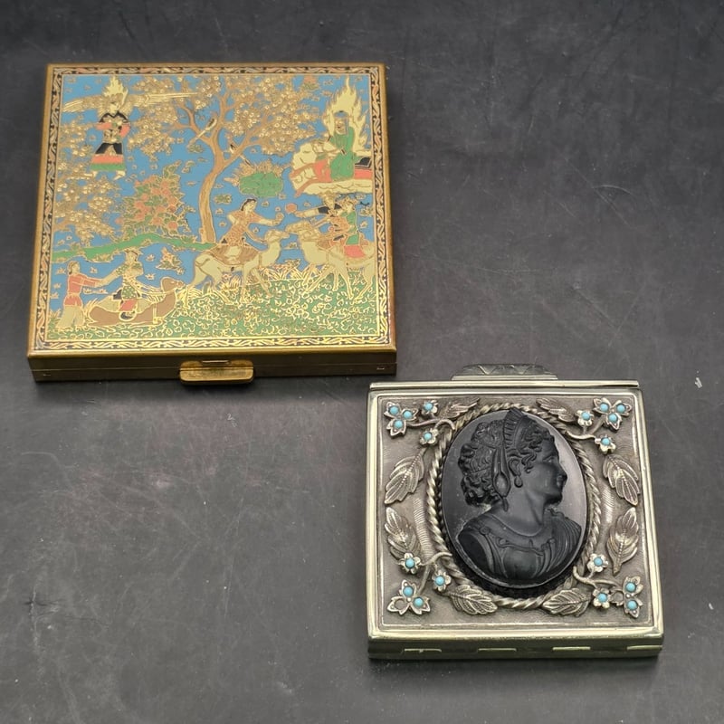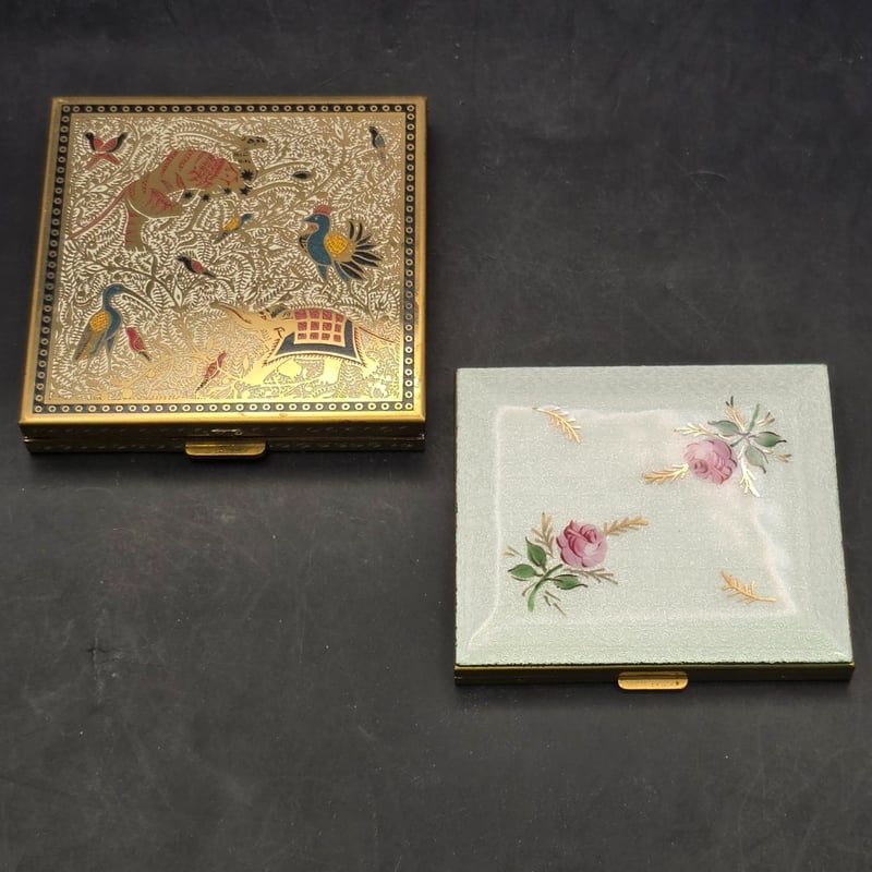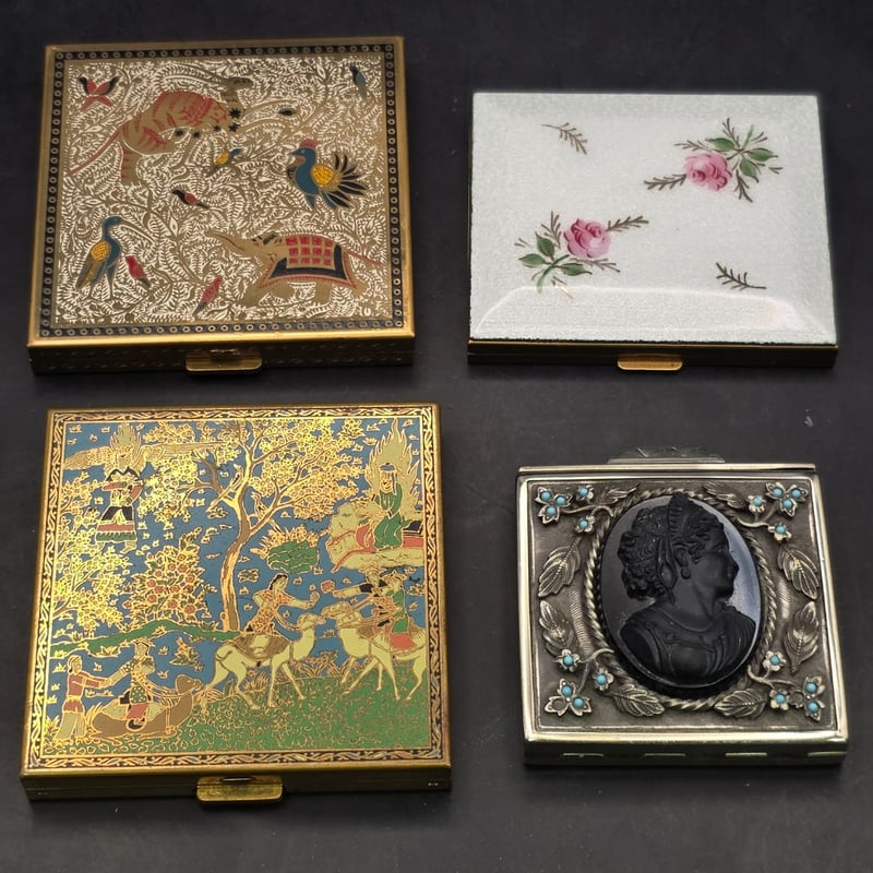 1900S COSMETIC ACCESSORIES 1900S Volupte Vintage Powder Compact, Volupte Cloisonne Powder Compact With Puff And Powder, Filigree Cameo Powder Compact Puff And Powder Compact, Guilloche Enamel Powder Compact With Puff And Powder Intact 232985+15