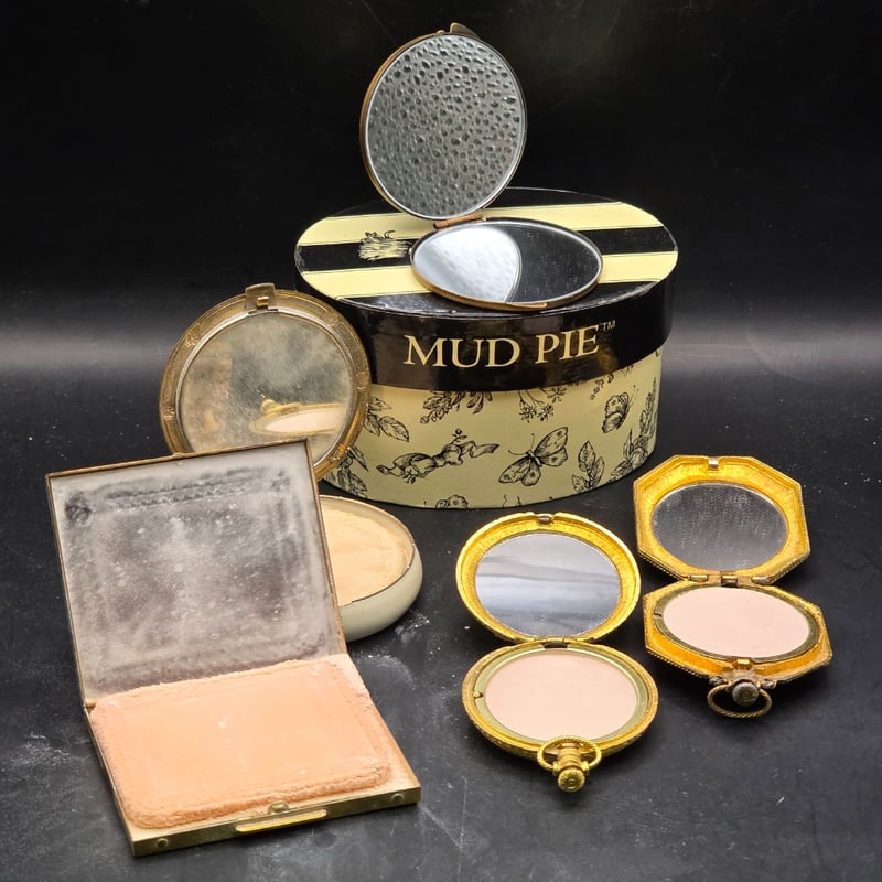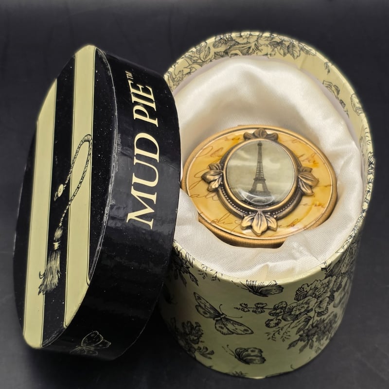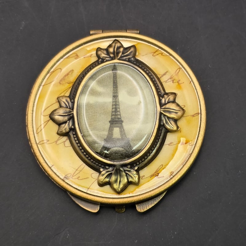 1900S Cosmetic Powder Compacts, 1900S Double Pie Mirror Eiffel Tower Set In Brooch On Top Of Box In Original Box
