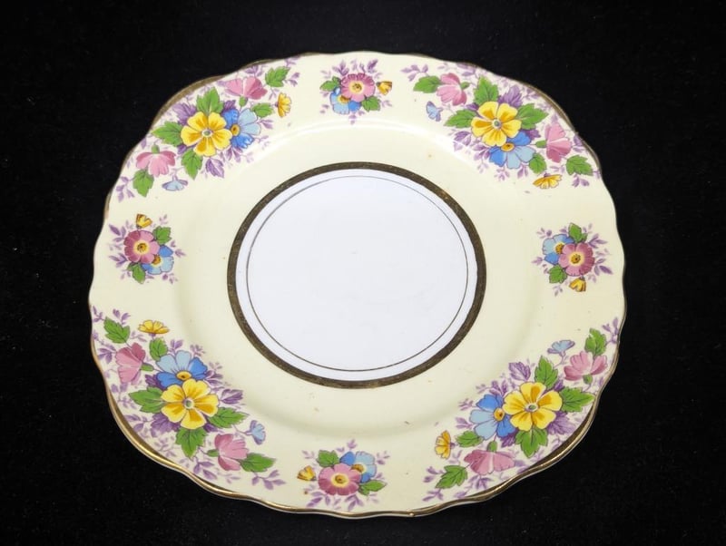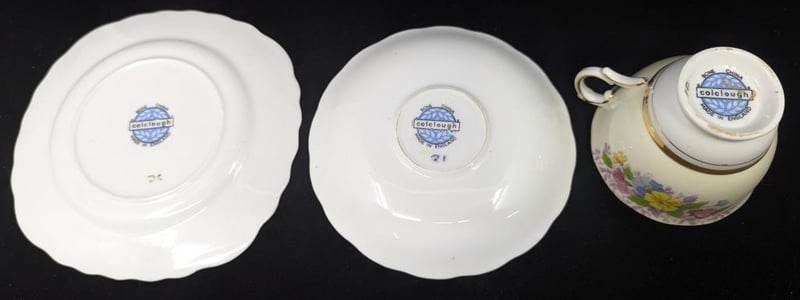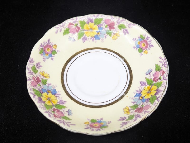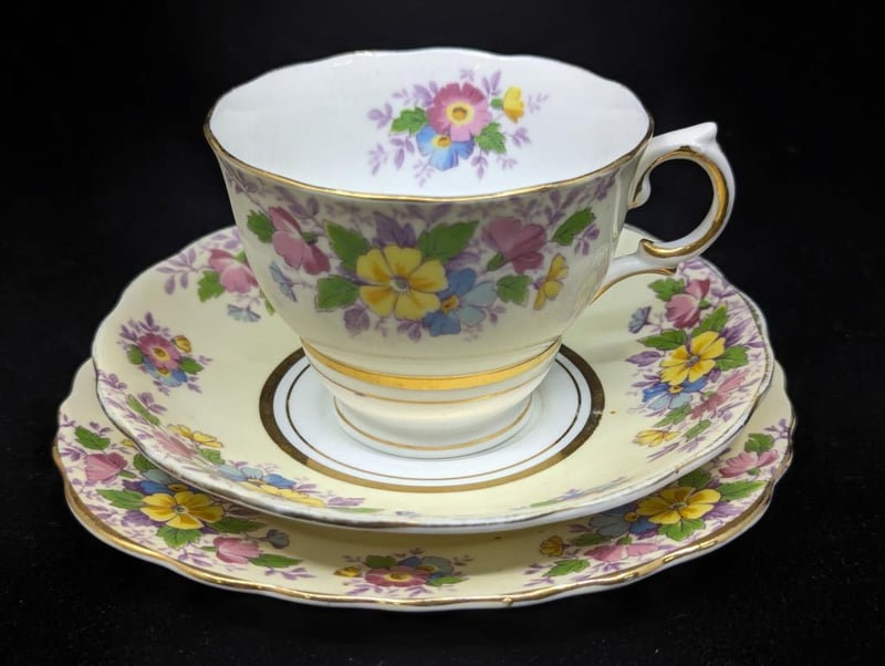 Includes Teacup, Saucer And Base Plate, Items Feature Yellow Tint With Floral Imagery