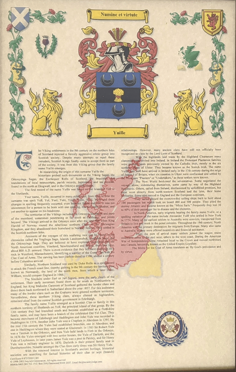 "HALL OF NAMES" FAMILY HISTORY CERTIFICATE FOR YUILLE. Item Size: Height: 52cm, Width: 36cm, Depth: 5cm, Weight: 1Kg Condition: Good - Refer To Images F2A 163113+7