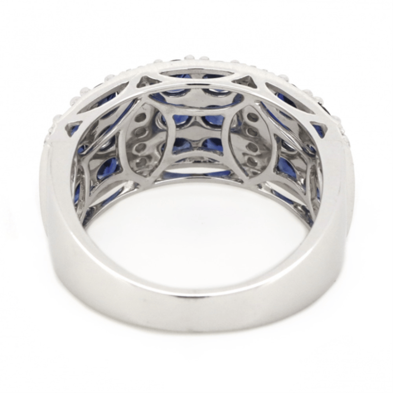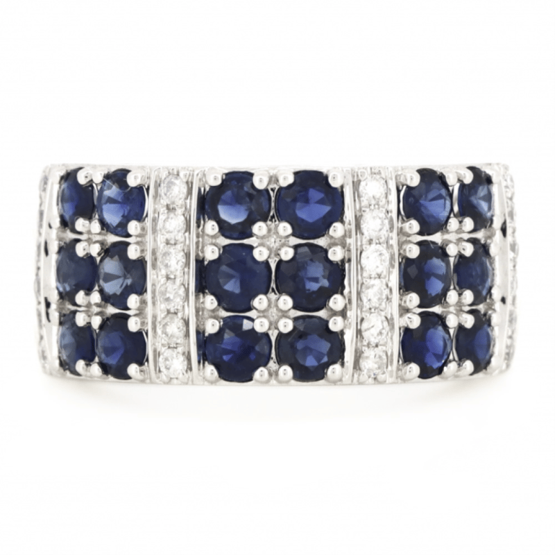 The Design Features, 18 Round Cut, Royal Blue, Sapphires (1.73Ct Tsw, Eye Clean Clarity), 4 Claw Set. Alternating In Rows Between Are, 24 Round Brilliant Cut, Diamonds (0.23Ct Tdw, G-H Colour, Si2-I2 Clarity), Micro-Claw Set. Ring Size M.