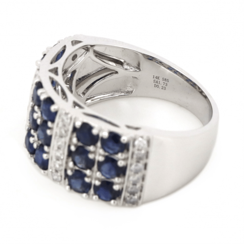 14K WHITE GOLD, BLUE SAPPHIRE AND DIAMOND, DECORATIVE BAND RING.