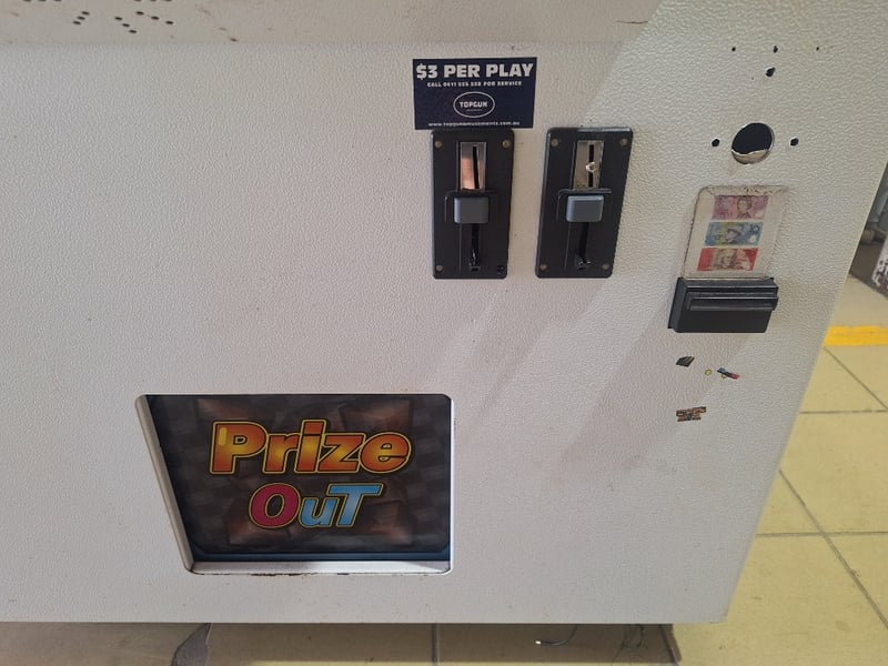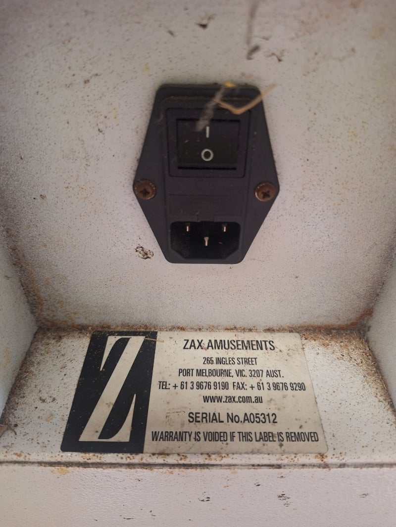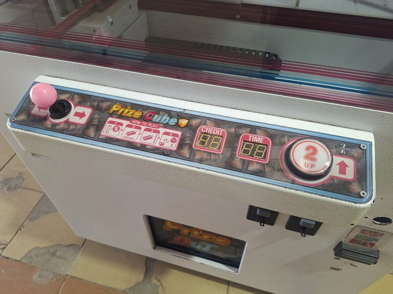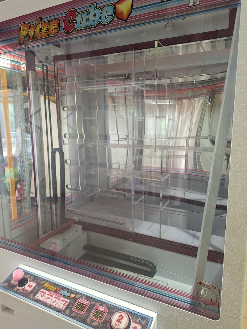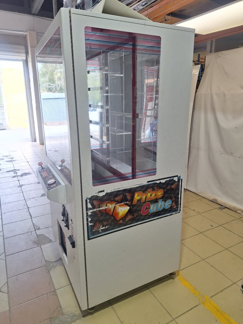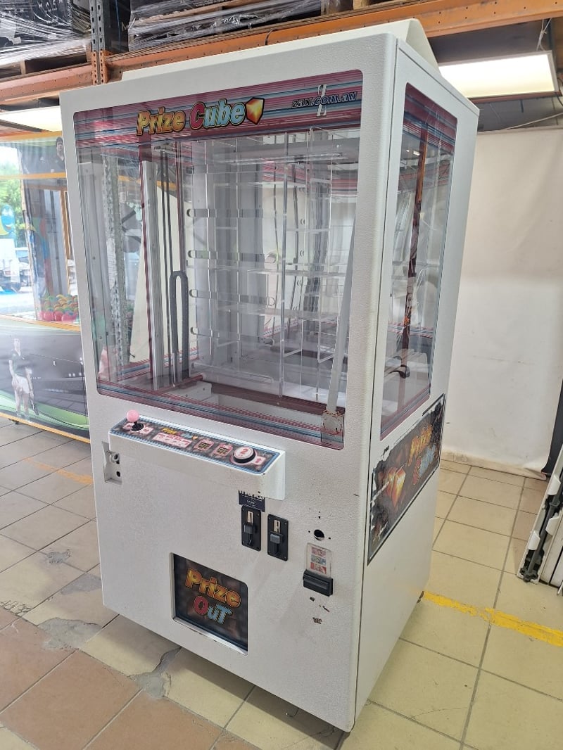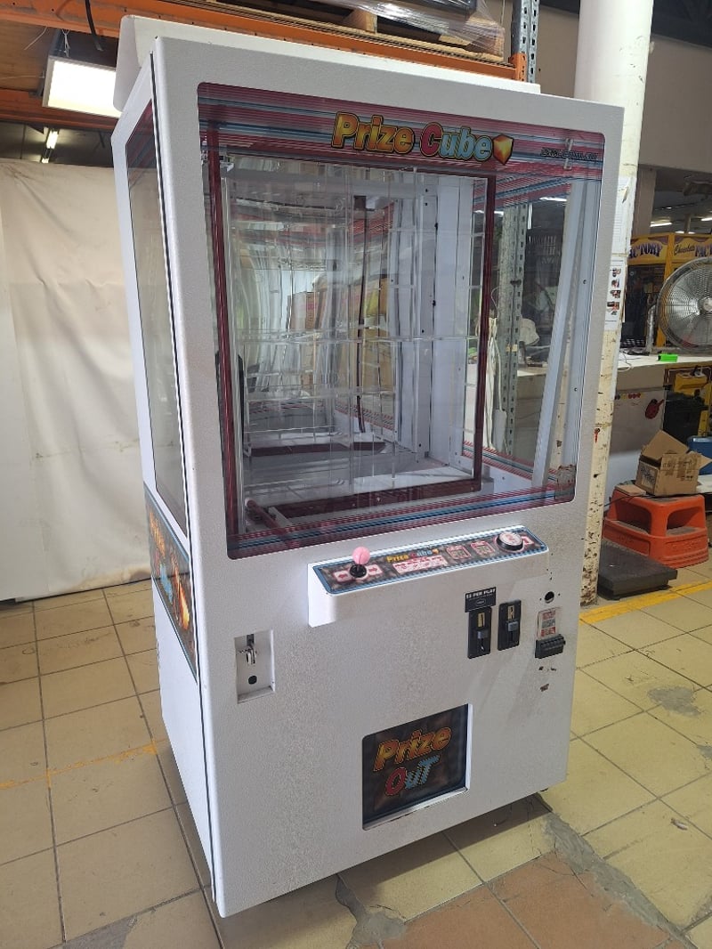 Arcade Machine, Prize Cube Make: Zax Amusements Model: Prize Cube Serial: A05312 White Finish, Coin Mechanism, No Keys Or Power Cord, Not Tested, Signs Of Wear, Not Working, Uses IEC Power Cable Or Similar Dimensions H:182cm W:89cm D:80cm
