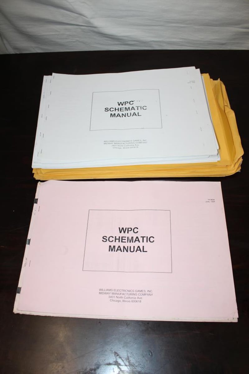 19 copies in total - Large bundle of WPC schematic manuals printed by Williams Electronics Games / Midway Manufacturing Company.Includes multiple stapled schematic sets with wiring diagrams, CPU, power driver, display and sound board schematics; mixed paper colours, workshop wear visible.