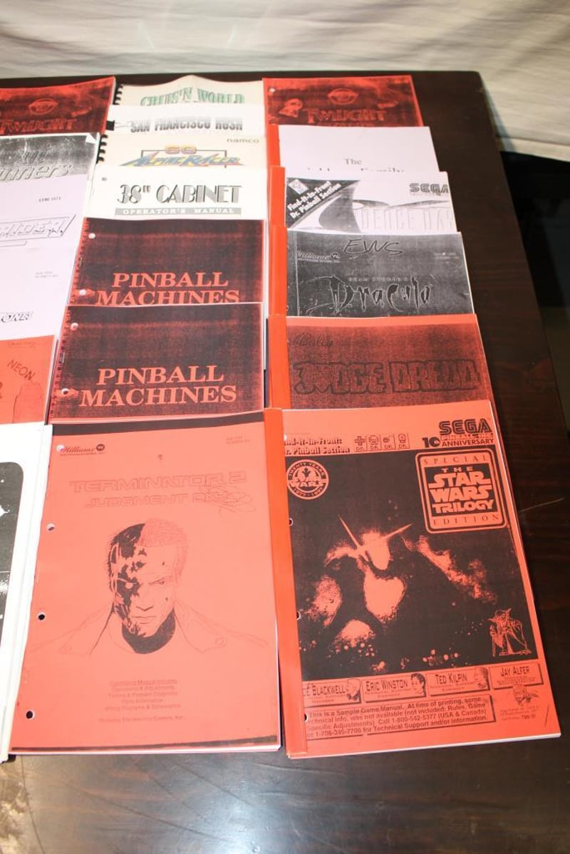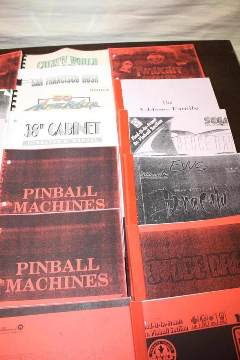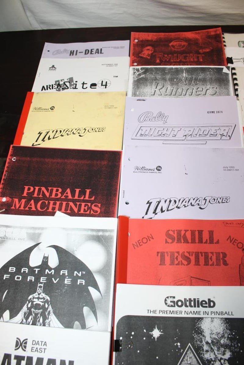 Mixed lot of arcade and pinball instruction and service manuals in paper format.