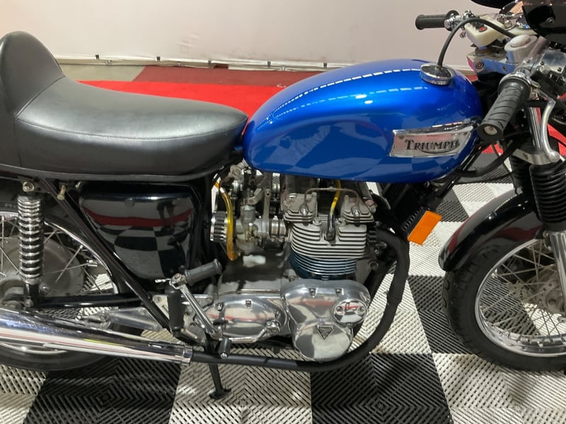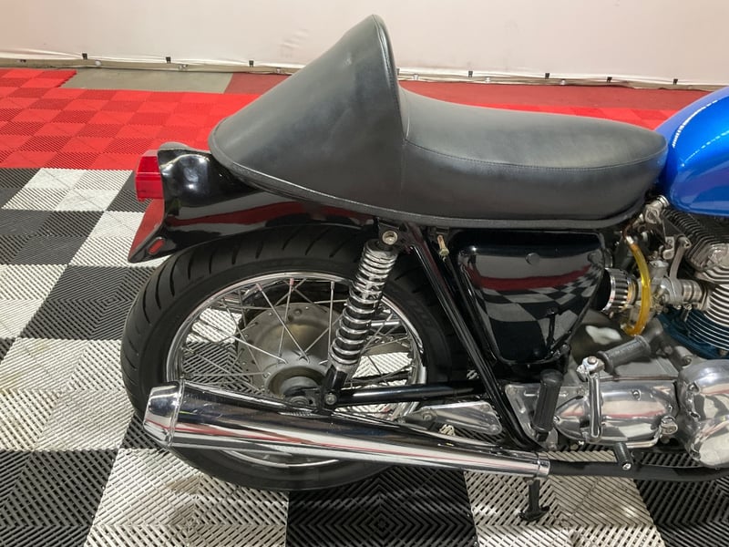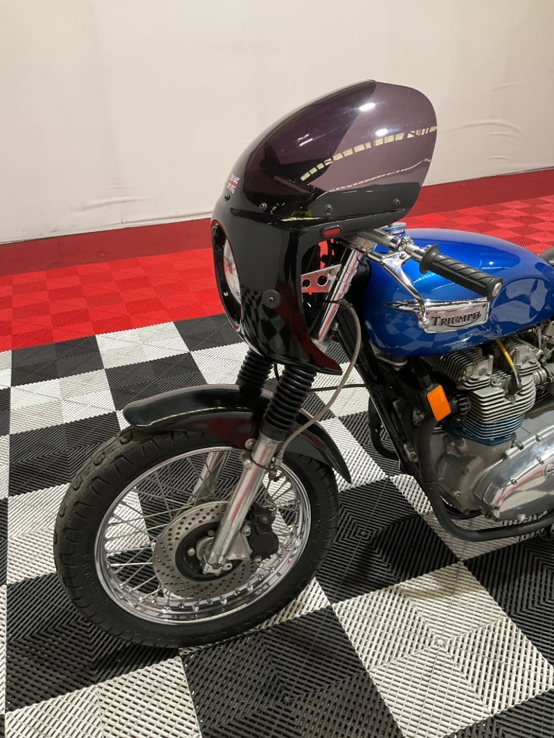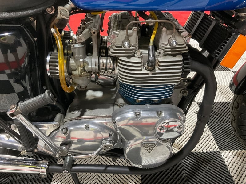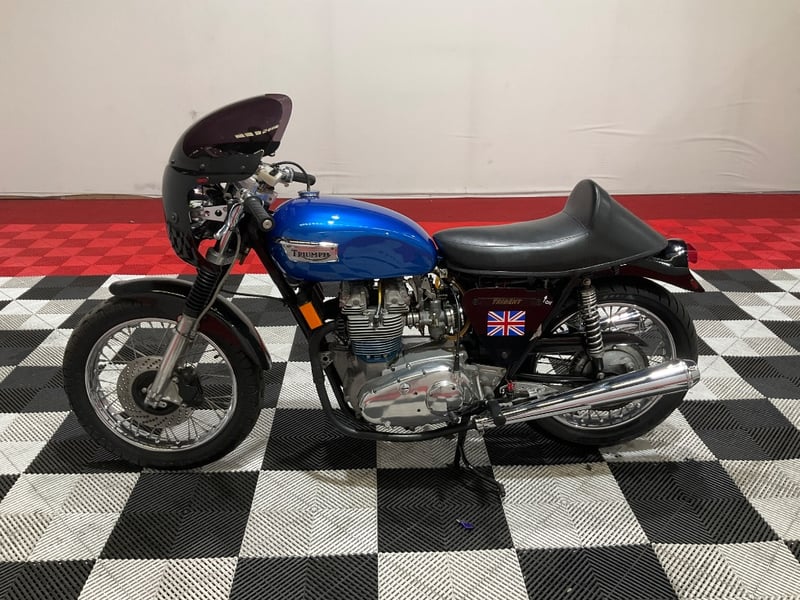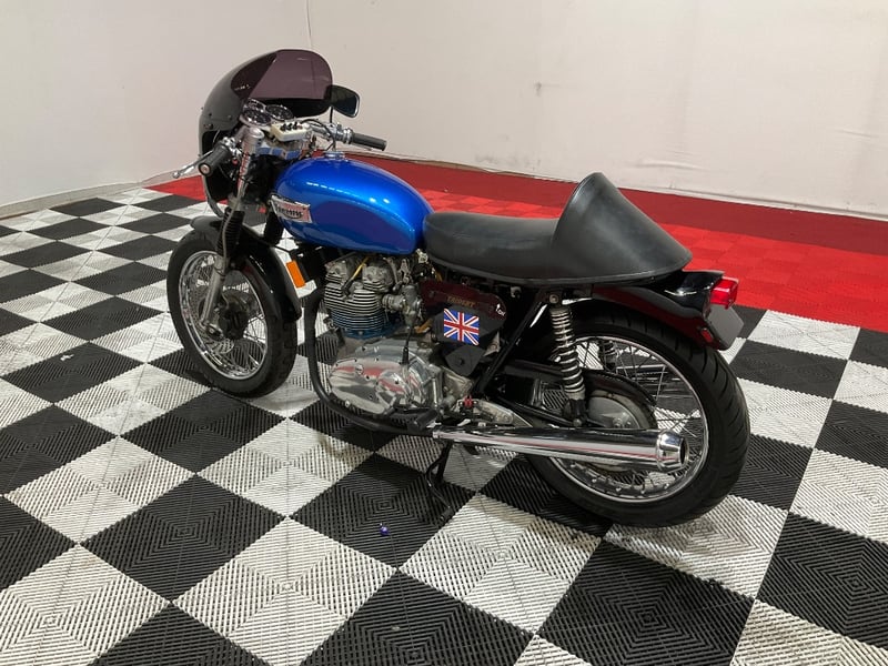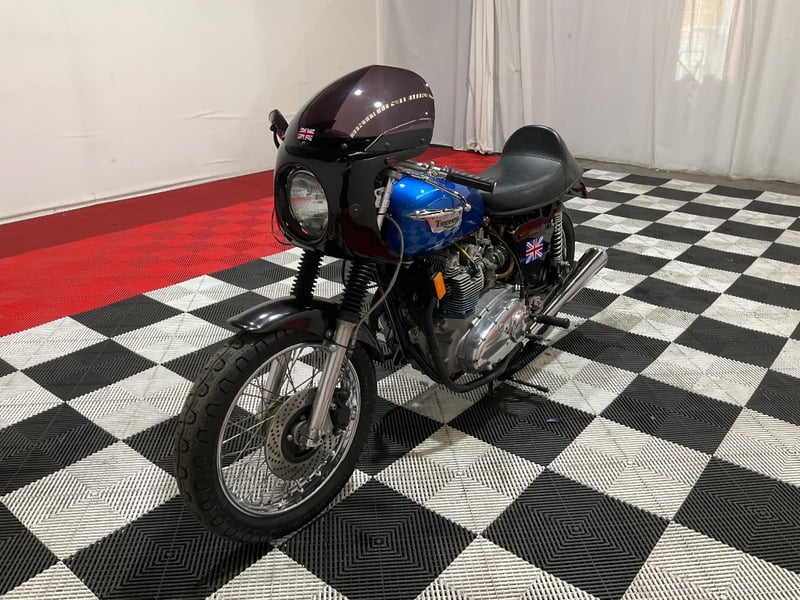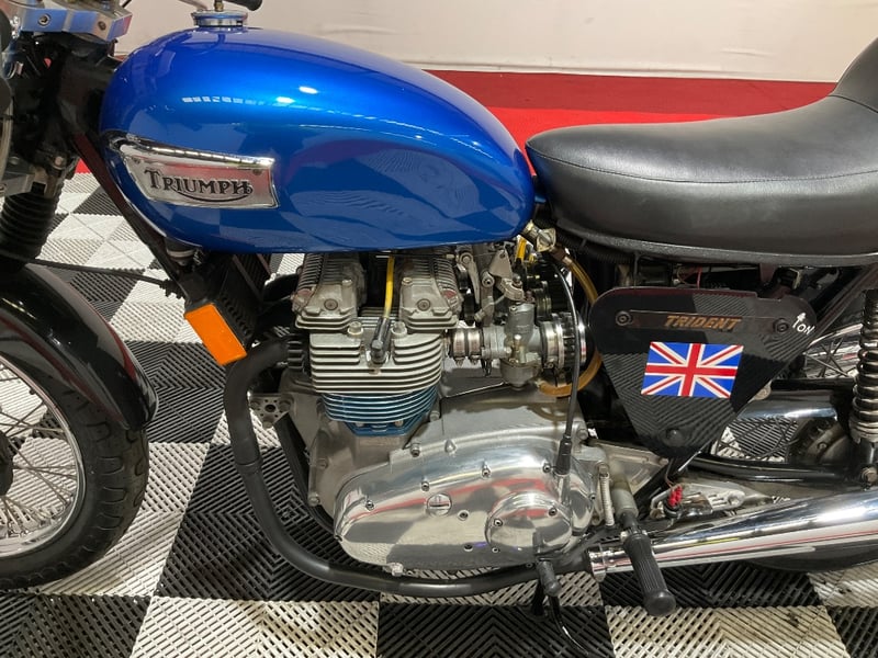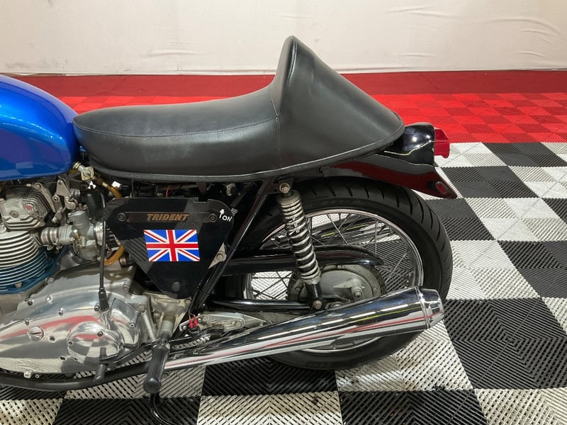 1973 Triumph Trident T150V Very few bikes can lay claim to being a genuine piece of British motorcycle racing history, but the Triumph Trident is absolutely one of them. The T150 triple dominated production racing in the early 1970s, including a famous one-two-three finish at the 1971 Isle of Man Production TT, and the street versions carried all of that three-cylinder character into something you could actually ride every day. The T150V here is the desirable 5-speed variant, the most refined of the series, and someone has done a proper job turning it into a cafe racer. The modifications are well-executed and show real knowledge of what works. The bikini fairing keeps the lines clean and houses the original Smiths tachometer and speedometer, with an added oil pressure gauge in a tidy three-instrument cluster. Billet alloy triple clamps replace the originals. The front end has been upgraded with Lockheed brake calipers and a drilled disc rotor for improved stopping power. The seat is a neat single cafe hump in good-condition black vinyl. A chrome 3-into-2 exhaust with megaphone silencers finishes the rear end properly. The Union Jack stickers on the fairing and the 'TRIDENT' side panels with 'Ton' marking leave you in no doubt what this machine is about. The metallic blue tank paint is a standout, deep and glossy with the chrome Triumph badge sitting cleanly on it. The polished primary and timing covers are near mirror-finish. All three Amal Concentric carbs are present and correct. The rear tyre appears to be a modern replacement with good tread. The Smiths gauges show approximately 17,000 miles, which is reasonable for a well-maintained triple that has seen some actual use. This is a proper, thoughtfully built example of one of Britain's most revered classics. Not a trailer queen, not a rough project, but a purposeful cafe machine that is ready to ride or show. Key #F23